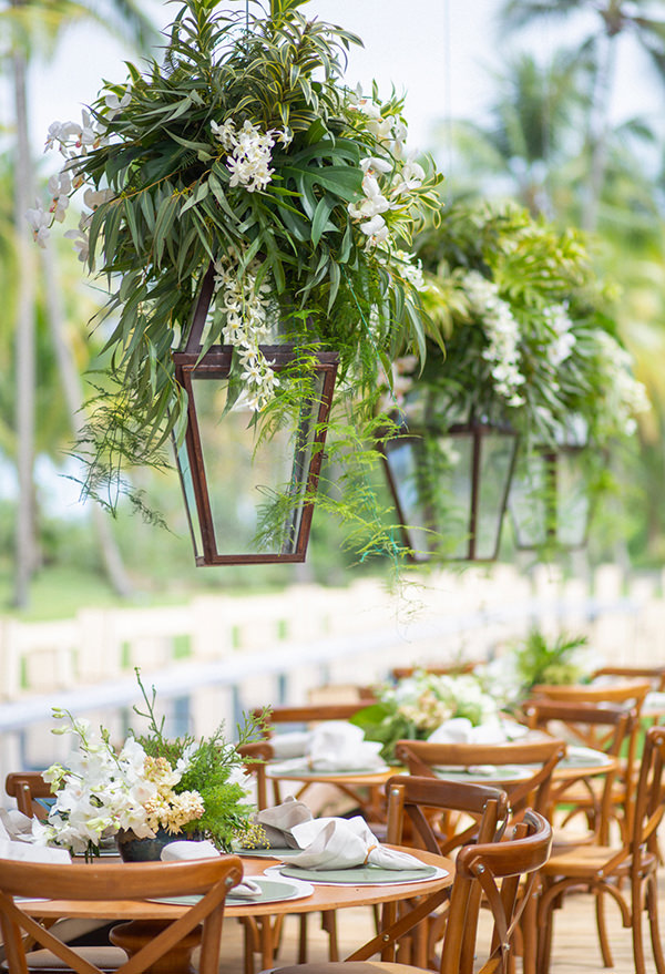 Na festa, o teto abaloado de tecidos recebeu a companhia de aéreos de folhagens, como costela de Adão, orquídeas brancas e lustres de palha.