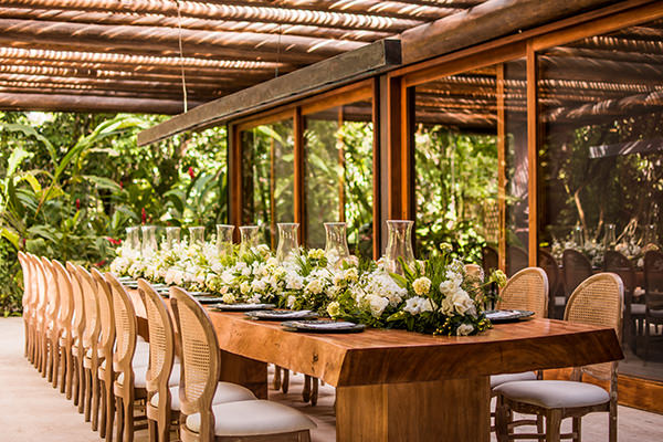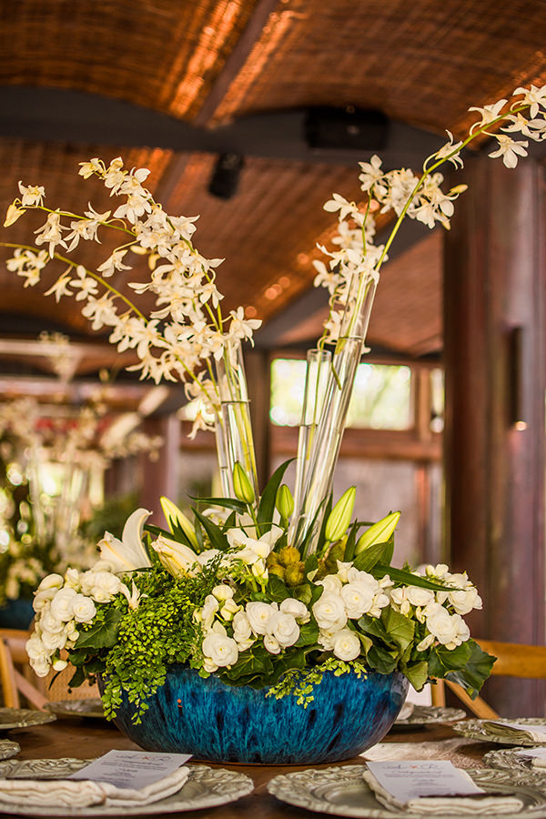 Já na festa, arranjos baixos e guirlandas florais para compor as mesas. Aqui, hortênsias, azaleias, orquídeas e sementes foram algumas das espécies utilizadas. Para acomodar os convidados, o decorador também preparou confortáveis lounges.