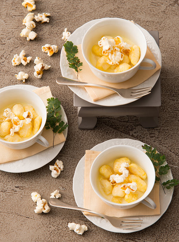 Para a festa, opções não faltam. Começando pelo jantar, olha que delícia este Nhoque de milho em fonduta de queijo e pipoca: