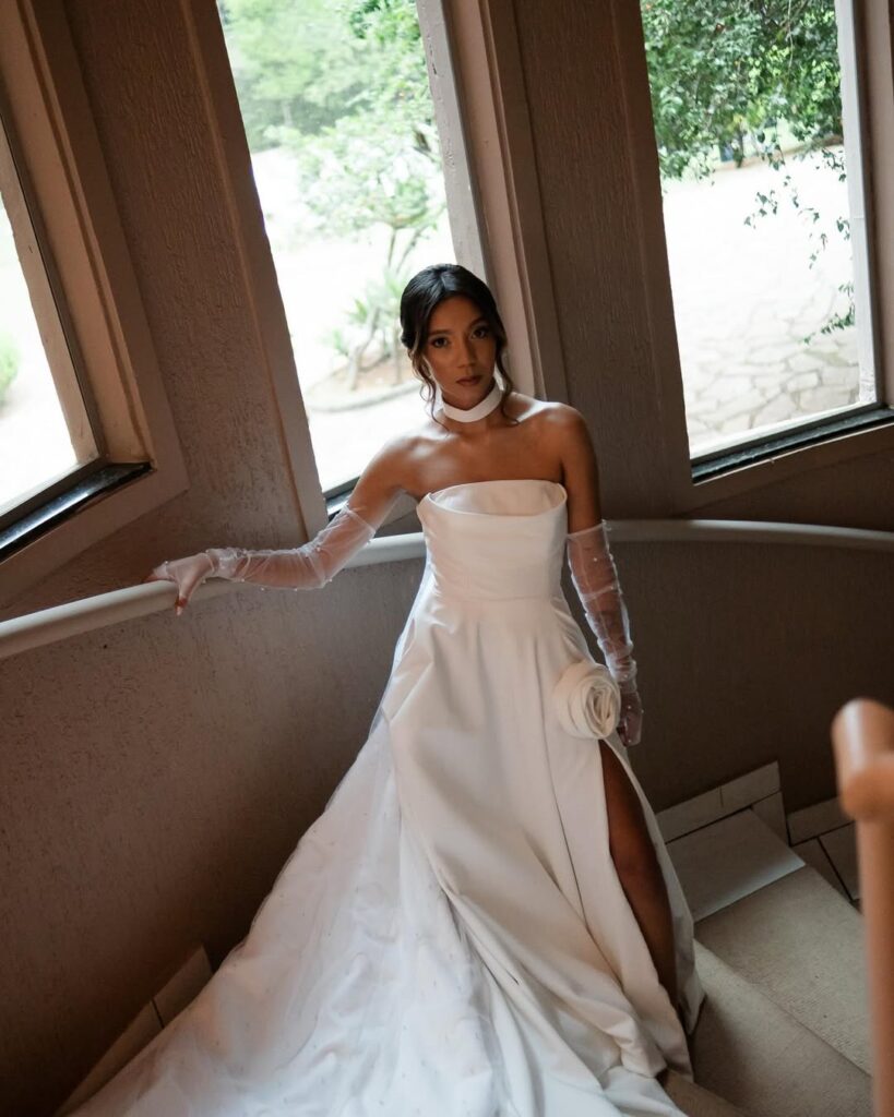 Quando essa lógica se aprofunda, o vestido também passa a dialogar com a trajetória criativa da noiva. A Pérola Noivas compartilha casos em que identidade e criação caminham juntas. “Hoje, as noivas buscam vestidos que representem quem elas são, procuram peças que unam personalidade e conforto.” Um exemplo marcante é o de Bruna, artista têxtil, que escolheu um vestido que refletia sua própria linguagem estética e seu trabalho manual com uma peça leve, autêntica e carregada de significado pessoal.