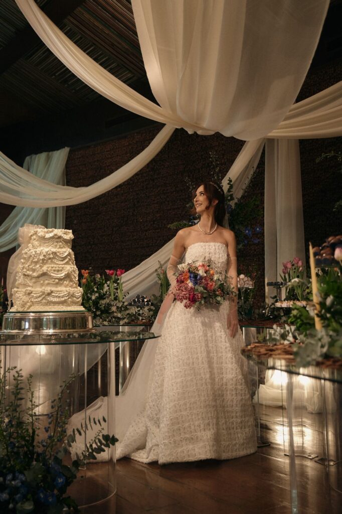 O vestido então deixa de simbolizar imposição e passa a expressar a mulher que está se casando e tudo o que ela é e acredita. Essa mesma clareza aparece na visão da Santis, que resume bem o espírito do tempo. “A noiva de hoje não busca um personagem, ela busca verdade.” O vestido precisa respeitar corpo, tempo e história, permitindo viver o dia com presença real. Para 2026, o ideal é um vestido que não pesa e não incomoda. “Quando o corpo está livre, a elegância acontece sem esforço.” Linhas limpas, modelagem inteligente, tecidos nobres e escolhas conscientes substituem excessos e expectativas alheias.