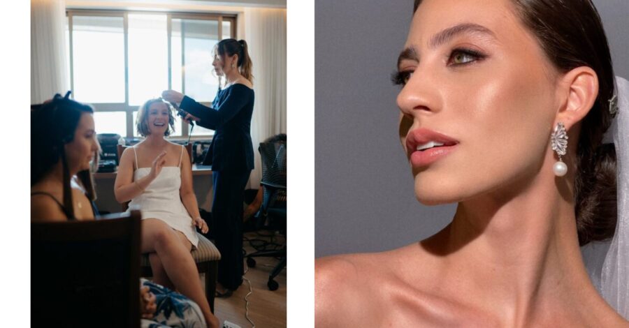 Danny Cardoso explica que, na lógica do novo tempo, a pele precisa apresentar viço saudável, com glow controlado e acabamento que traduza ternura. Já o cabelo pede textura e movimento, sem abrir mão de um acabamento limpo — e até a joia escolhida para o penteado precisa dialogar com o conjunto.
