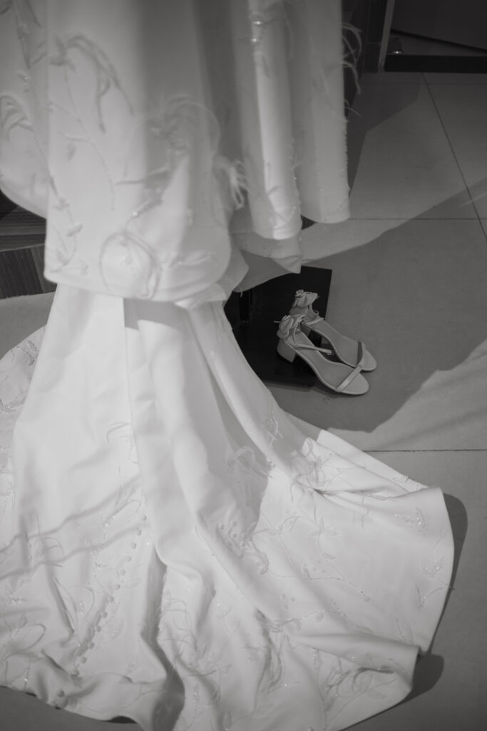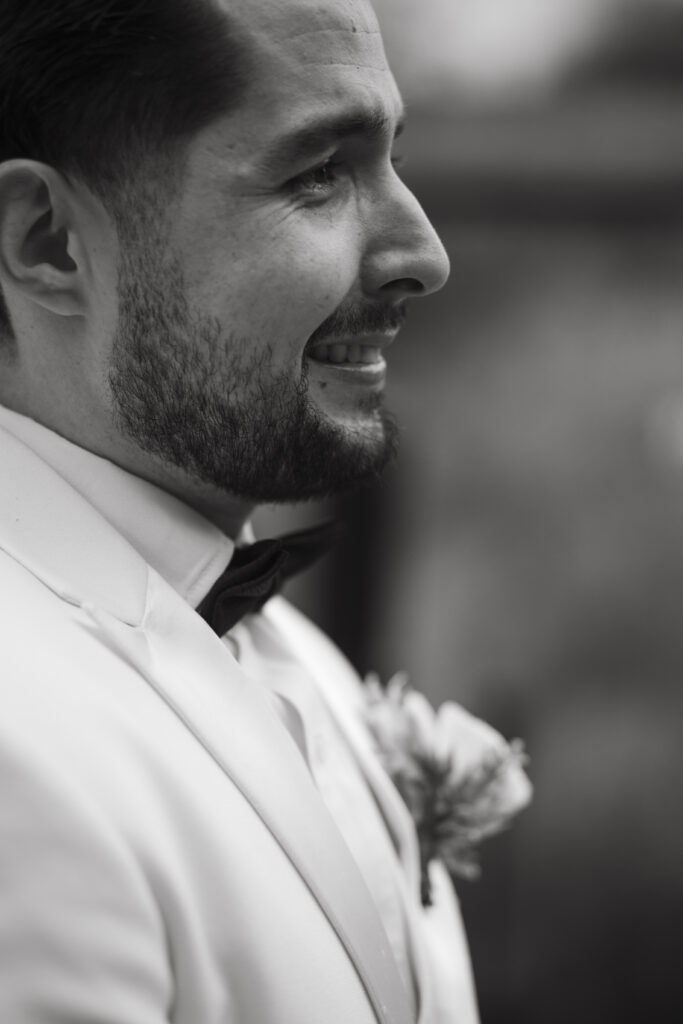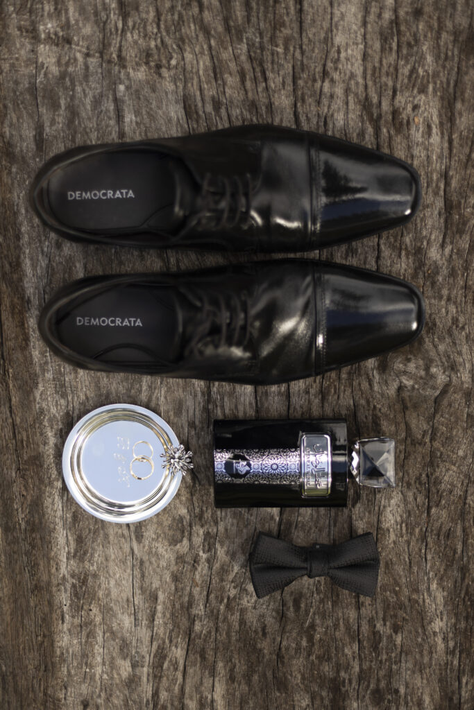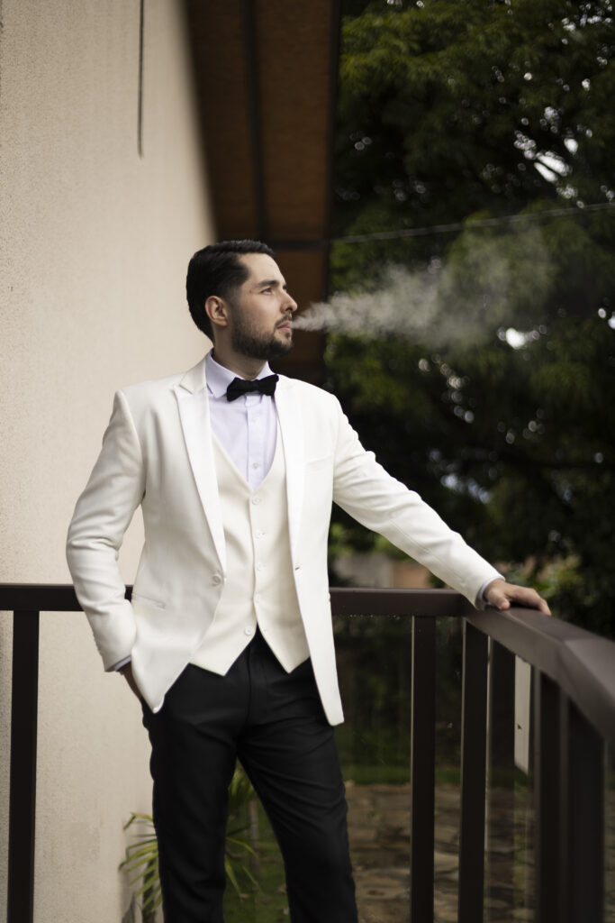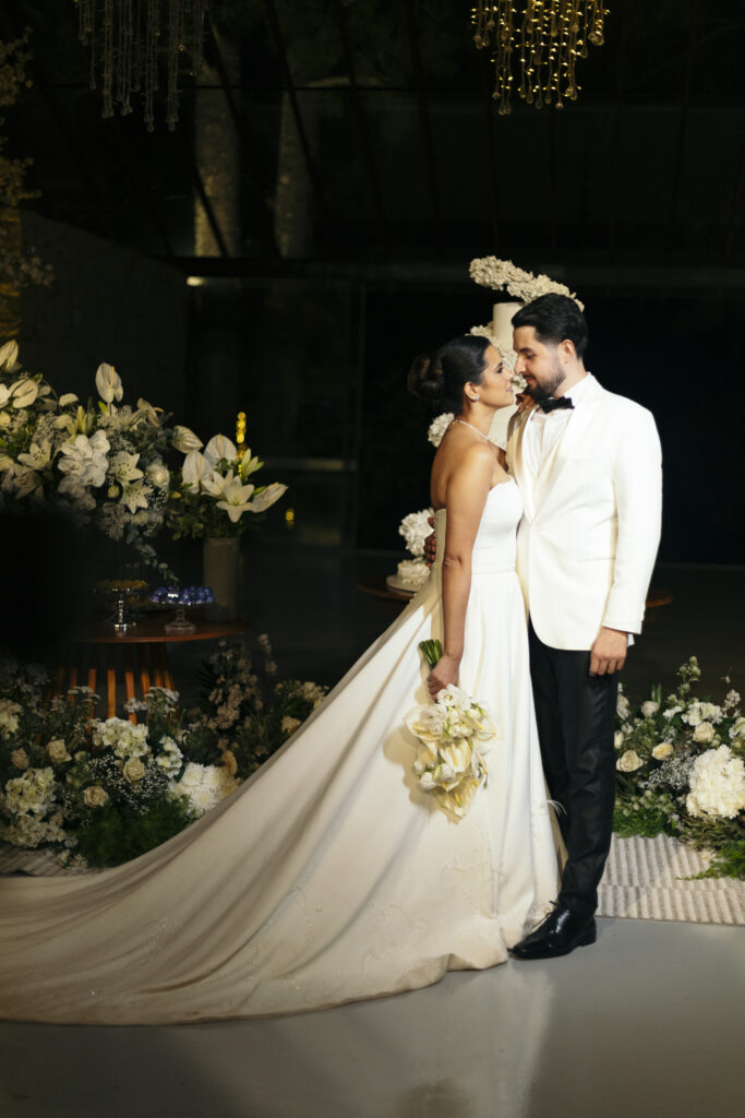 Depois de provar mais de 40 vestidos entre Brasília e Goiânia, Bárbara decidiu fazer o primeiro aluguel com um modelo desenhado exclusivamente para ela, na La Fiancée, exatamente como sonhou. “Foi realmente mágico: todas as provas, o desenho e a ajuda da equipe.” Já Kauê apostou em um smoking clássico, que ele mesmo escolheu e que harmonizou perfeitamente com o look da noiva. “Idealizamos desde o início o uso de smoking, como um príncipe — e ficou lindo no dia”, conta a noiva. A escolha do traje se deu na reconhecida loja Maxime Noivos & Black Tie.