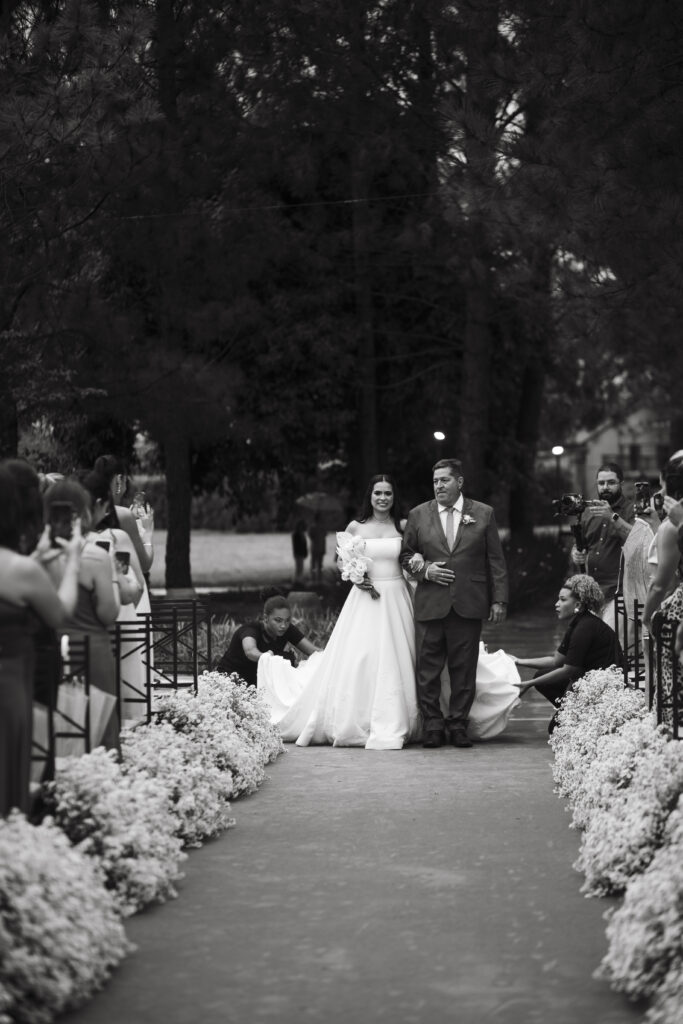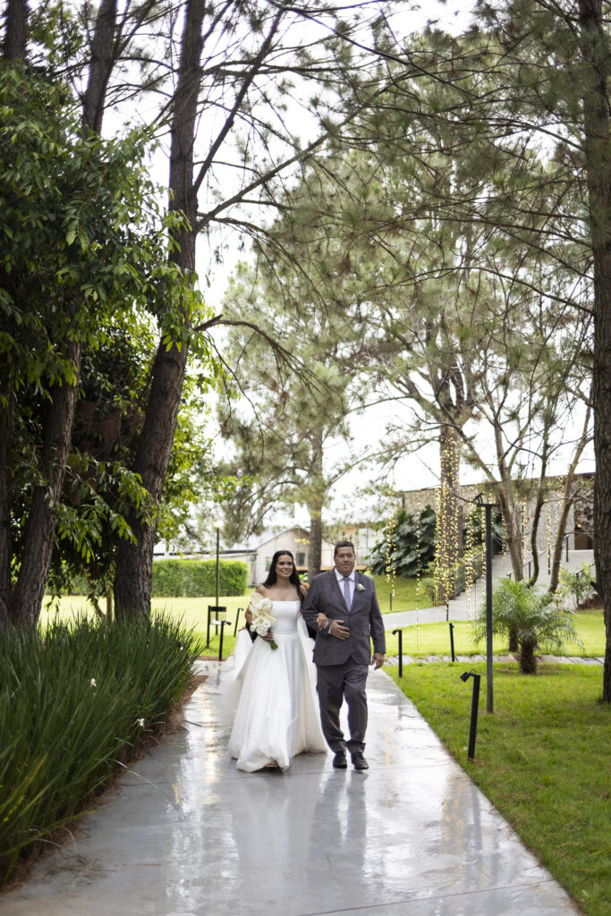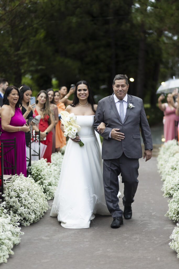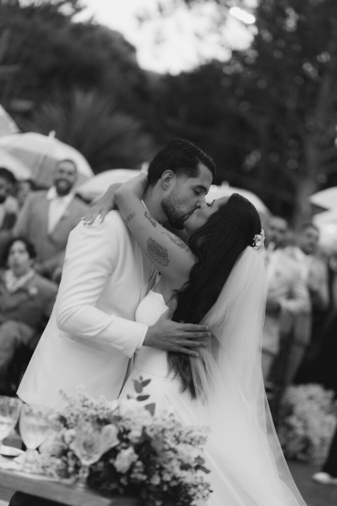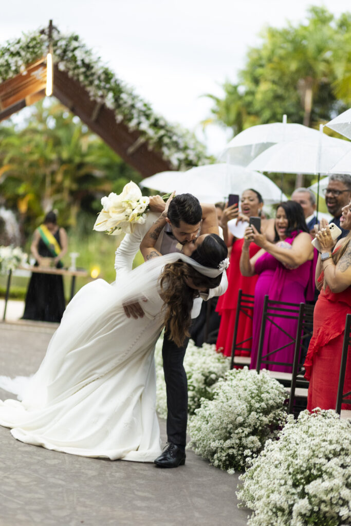 Um dos momentos mais marcantes da cerimônia foi, sem dúvida, a chuva inesperada. A previsão indicava apenas 20% de chance e, por isso, decidiram não contratar cobertura. Como plano B, Bárbara sugeriu o uso de guarda-chuvas, ideia prontamente abraçada pela cerimonialista, que foi um verdadeiro anjo da guarda durante todo o processo. No grande dia, a chuva caiu forte, mas não abalou em nada: os convidados permaneceram firmes na cerimônia e o amor foi ainda mais sentido. A chuva, que poderia ser um contratempo, tornou-se parte da poesia.