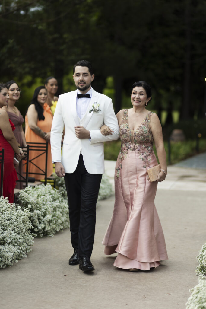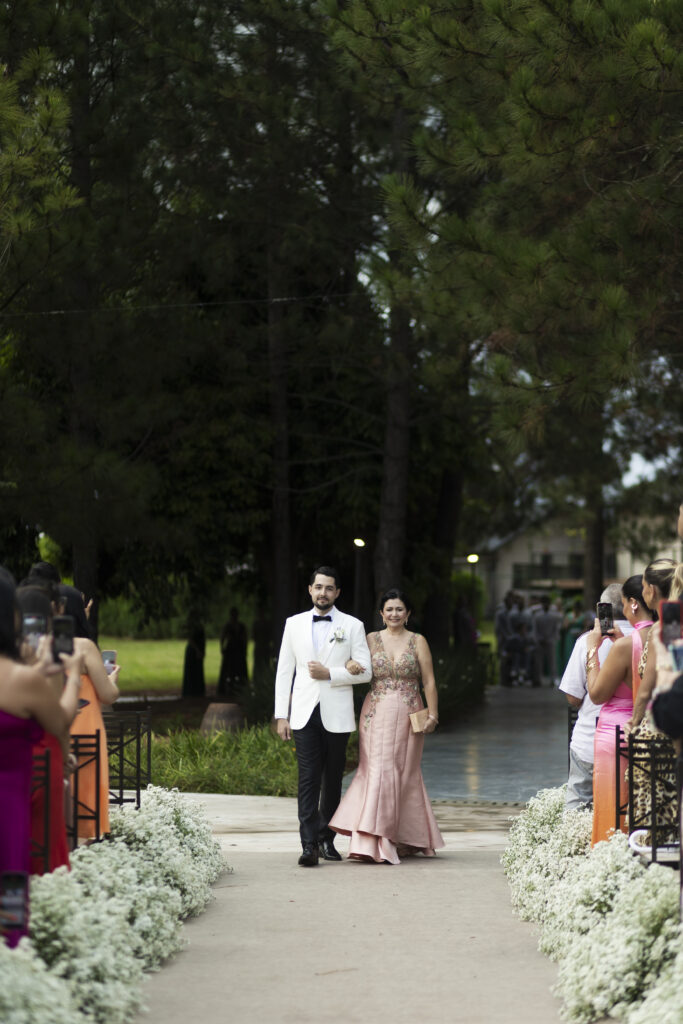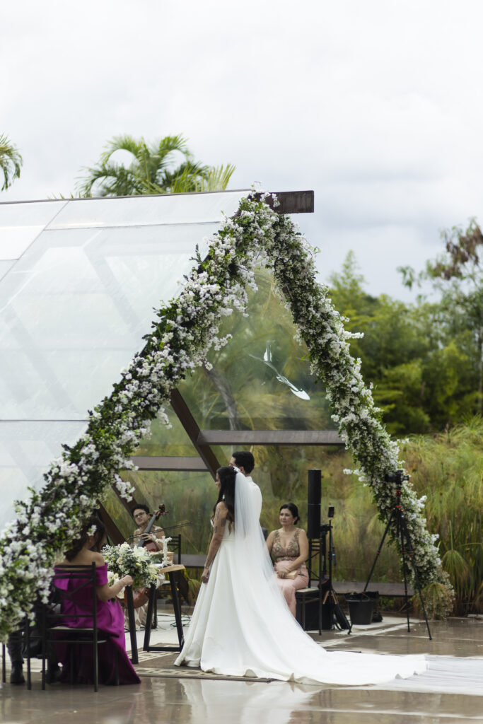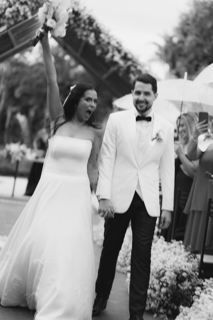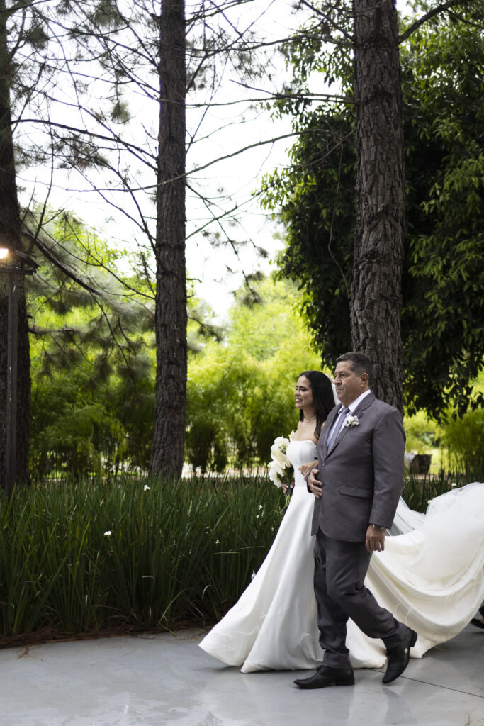 Um dos momentos mais marcantes da cerimônia foi, sem dúvida, a chuva inesperada. A previsão indicava apenas 20% de chance e, por isso, decidiram não contratar cobertura. Como plano B, Bárbara sugeriu o uso de guarda-chuvas, ideia prontamente abraçada pela cerimonialista, que foi um verdadeiro anjo da guarda durante todo o processo. No grande dia, a chuva caiu forte, mas não abalou em nada: os convidados permaneceram firmes na cerimônia e o amor foi ainda mais sentido. A chuva, que poderia ser um contratempo, tornou-se parte da poesia.