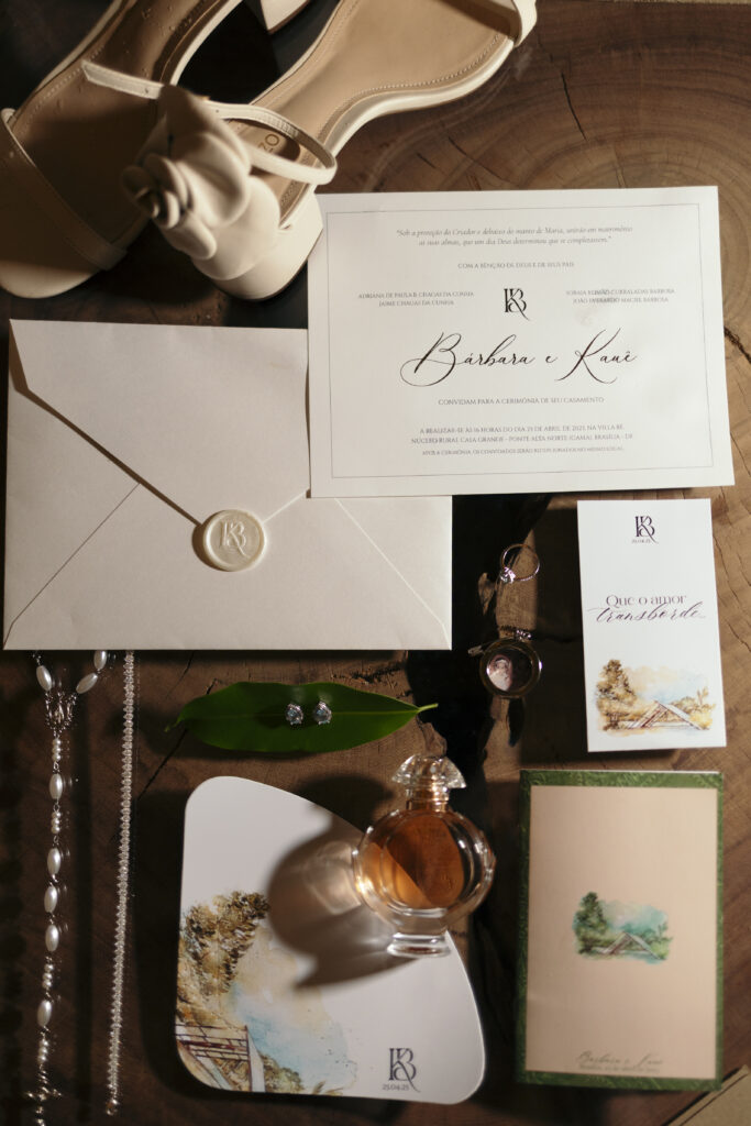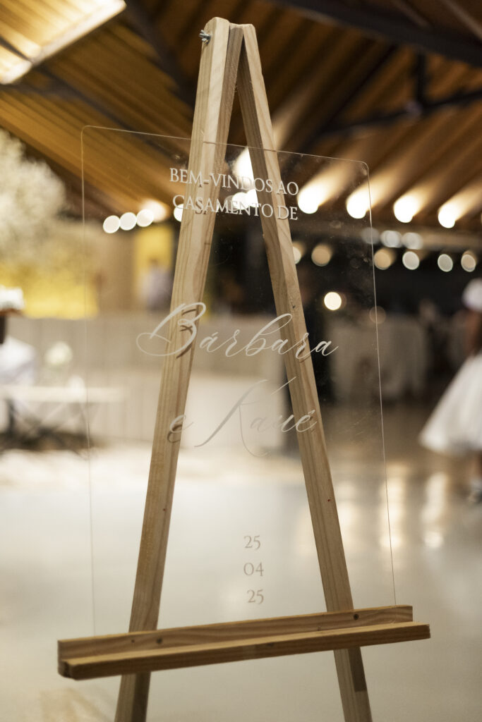 Controladora e apaixonada pelos preparativos, a noiva colocou a mão na massa e criou toda a papelaria do casamento — dos livretos à placa da entrada. O design foi inspirado na aquarela do próprio espaço, criando uma identidade visual personalizada e afetiva.