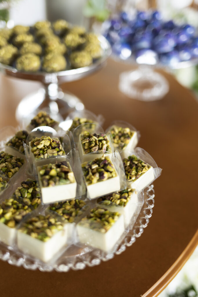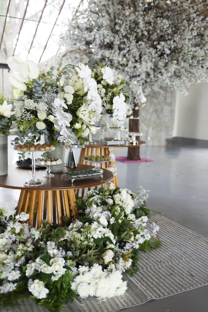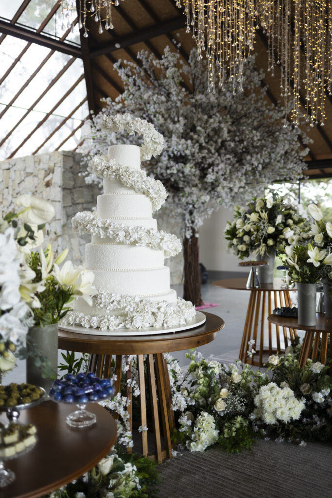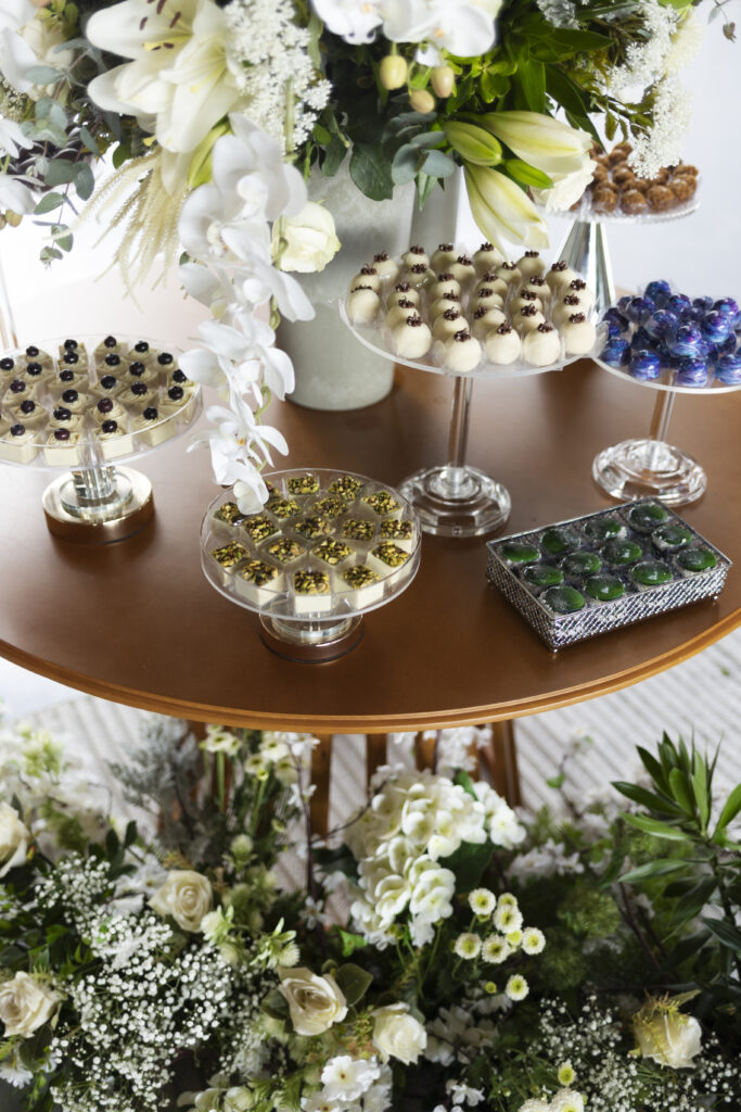 Já na festa, o buffet foi um verdadeiro sucesso. Dos dadinhos de tapioca com geleia de pimenta ao risoto de camarão servido na pista de dança, tudo foi elogiado, tanto pela qualidade quanto pelo serviço. O jantar, repleto de opções sofisticadas como filé mignon ao molho poivre e fettuccine no grana padano, foi acompanhado por sobremesas queridinhas: creme de papaya com cassis, doces finos e um bolo dos sonhos de blueberry com limão siciliano e frutas vermelhas.