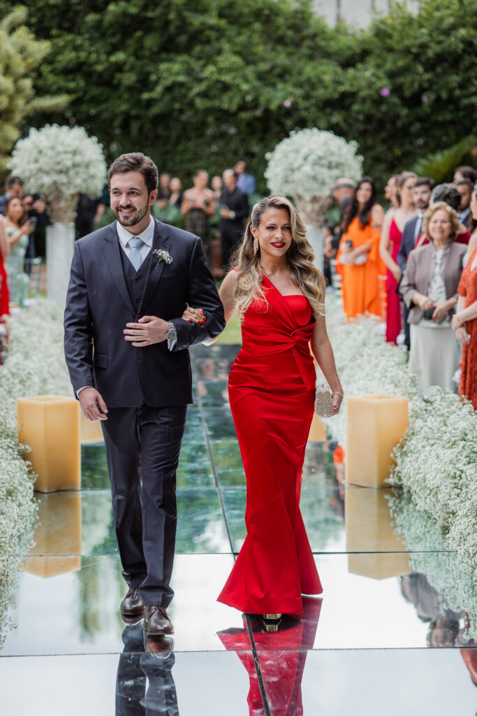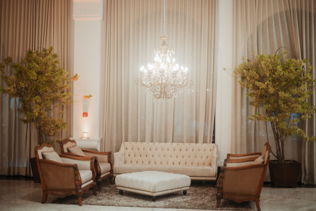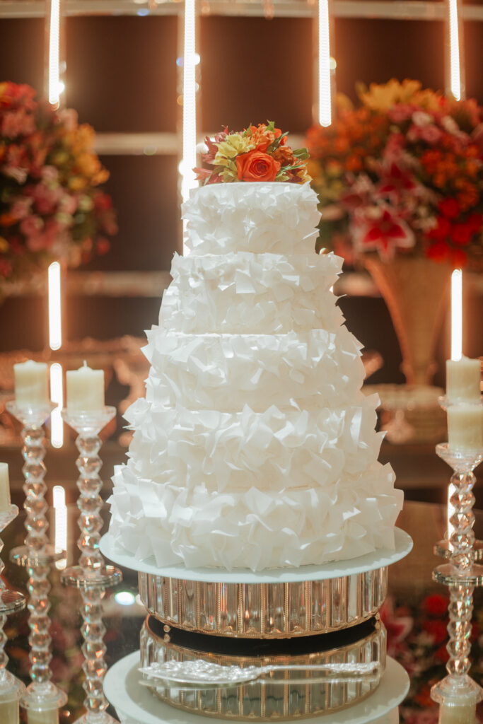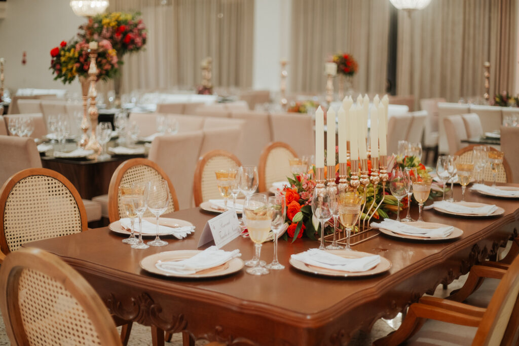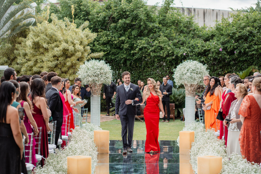 A decoração da cerimônia, assinada por Fernanda, decoradora do Dúnia, seguiu uma linha clássica: branco, verde e velas. Já para a recepção, o casal ousou mais nas cores quentes, com um toque rústico, elegante e acolhedor.