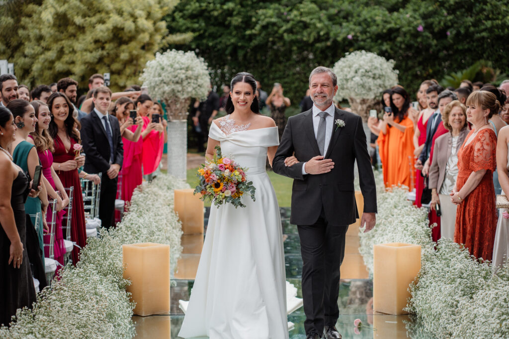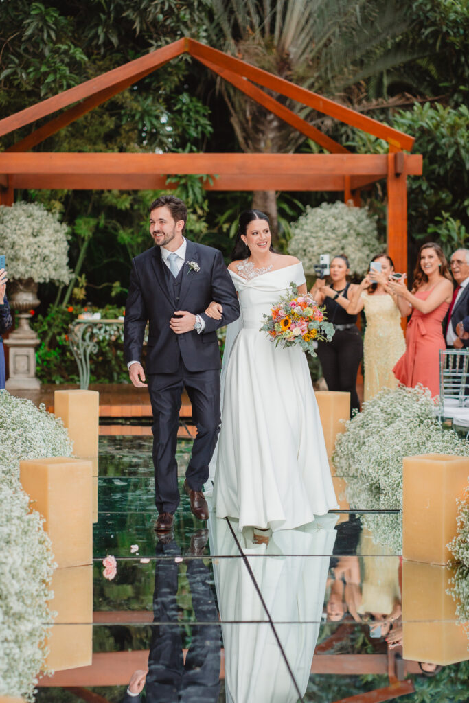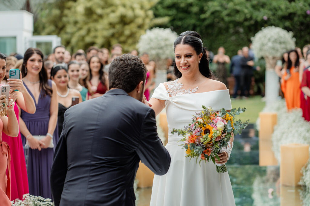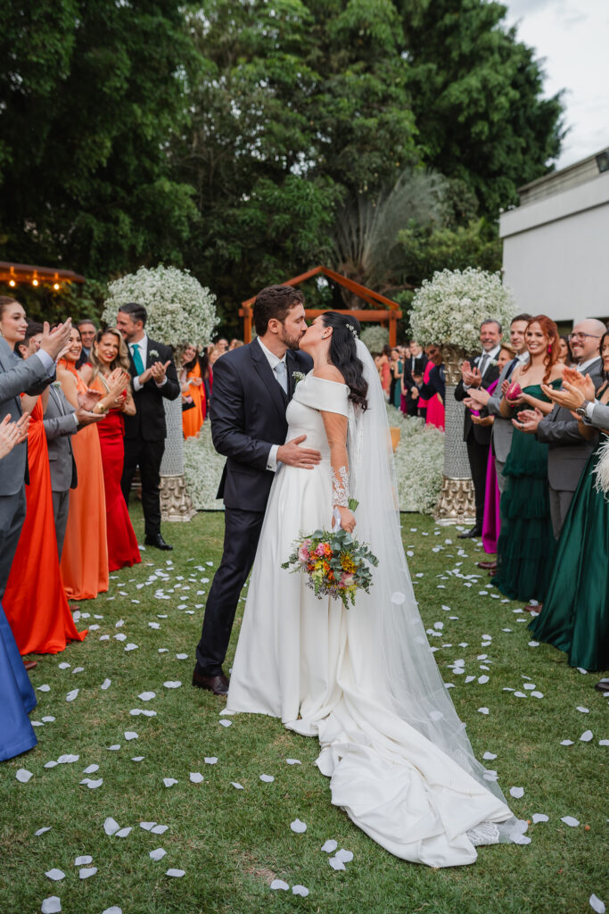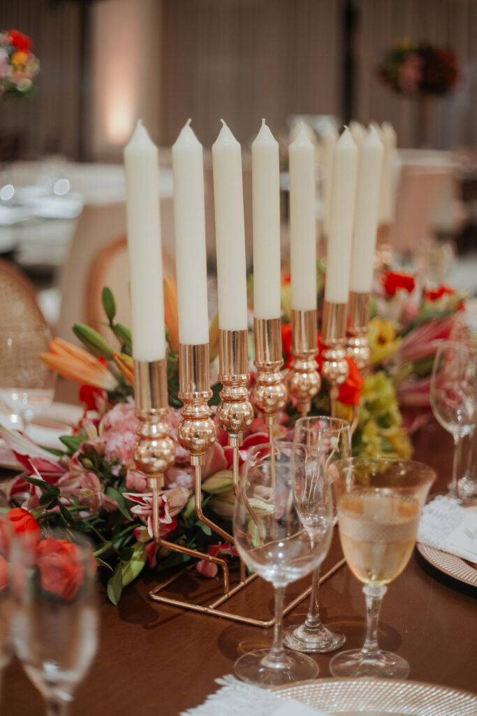 A decoração da cerimônia, assinada por Fernanda, decoradora do Dúnia, seguiu uma linha clássica: branco, verde e velas. Já para a recepção, o casal ousou mais nas cores quentes, com um toque rústico, elegante e acolhedor.