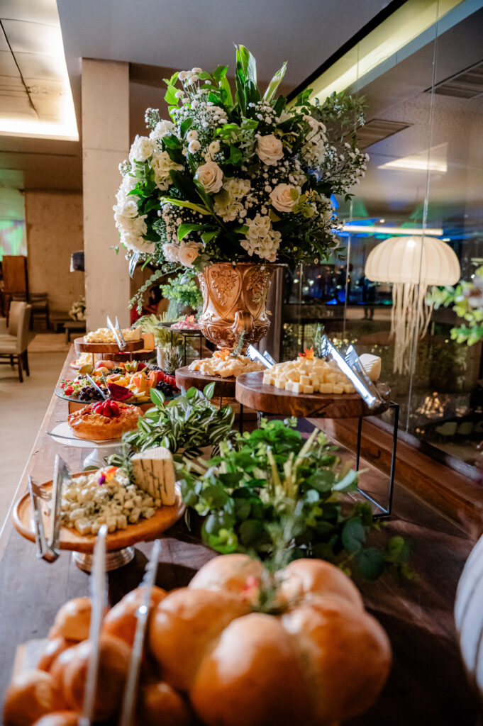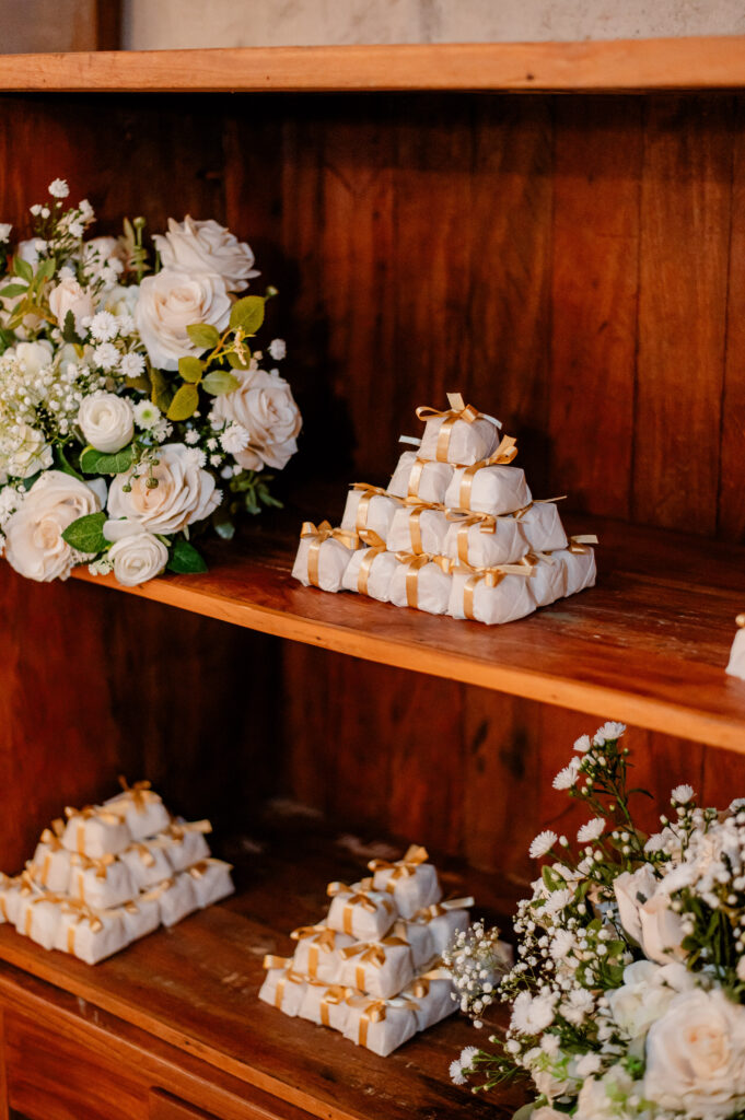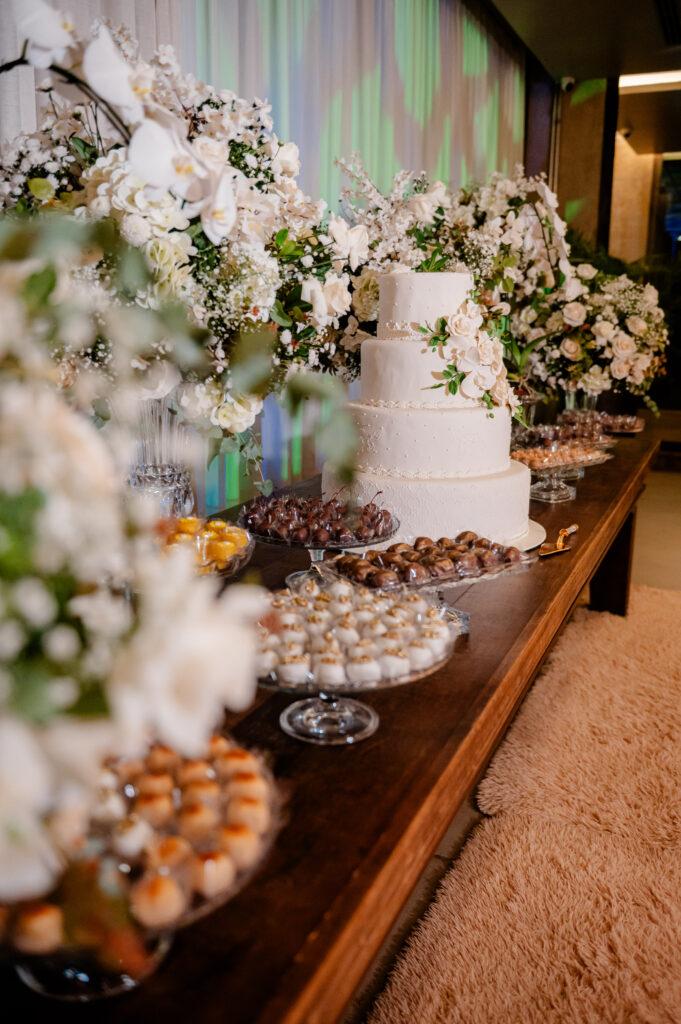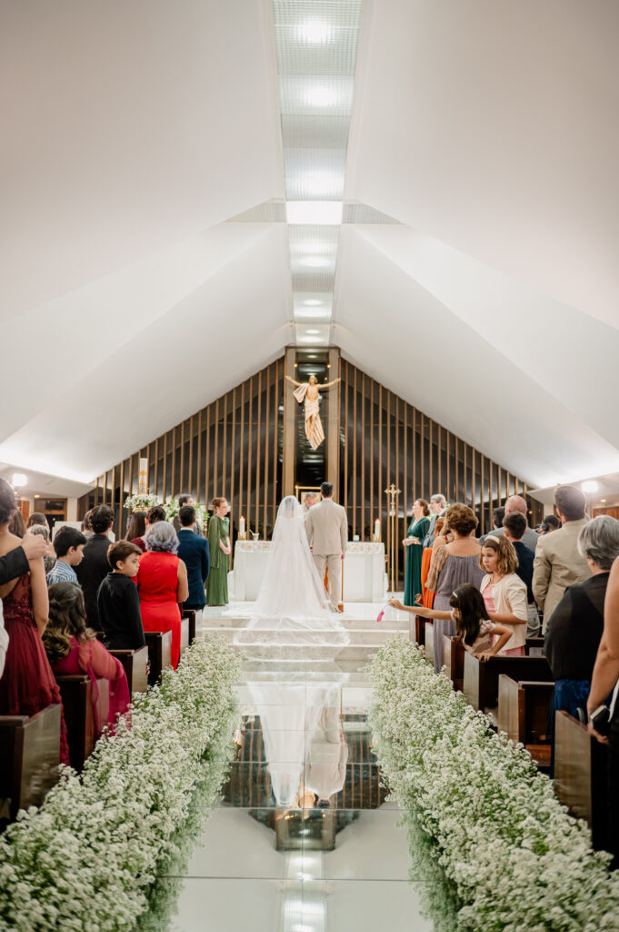 Quanto à decoração, os noivos optaram pelo estilo atemporal romântico clássico, seguindo uma paleta em tons suaves de off-white, bege, dourado, verde e branco. Essas escolhas se refletiram não apenas na decoração da igreja e da festa, mas também nos trajes dos noivos, das damas e dos pajens, resultando em uma estética equilibrada que contribuiu para uma atmosfera envolvente e aconchegante.