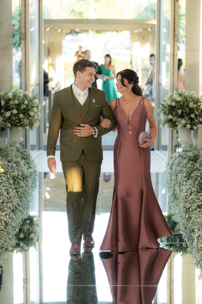 Na busca pelo vestido perfeito, a noiva, conhecida por seu detalhismo, pesquisou muito e visitou diversas lojas até encontrar o modelo que parecia ter sido feito para ela: sereia e com mangas rendadas. Complementando a produção, a noiva optou por um salto de modelo clássico assinado por Marianna Machado. Para Rafael, o terno escolhido foi na cor verde — por ser sua favorita e uma surpresa para a noiva. “Achei que ficou super original e totalmente a cara dele”, conta Thaís.