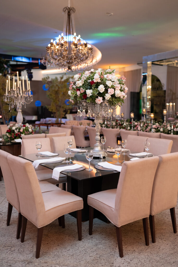 Com flores e decoração inclusas no pacote do espaço, o casal trabalhou em conjunto com a decoradora Fernanda Soares para definir todos os detalhes. A mistura do estilo clássico com toques de cor resultou em um cenário sofisticado e acolhedor. A paleta incluía branco, verde, rosa-canela e marsala, com detalhes dourados e muitas velas para criar uma atmosfera romântica. Complementando toda a estética, optaram por uma exuberante maquete da Baruka, que trouxe ainda mais encanto ao centro da festa. Após a experiência, Thaís afirma que é fundamental ter um decorador atencioso, que leve em consideração os gostos dos noivos. “Nossa decoradora fez tudo isso com muito carinho, criando algo ainda mais lindo do que imaginávamos”, afirma.