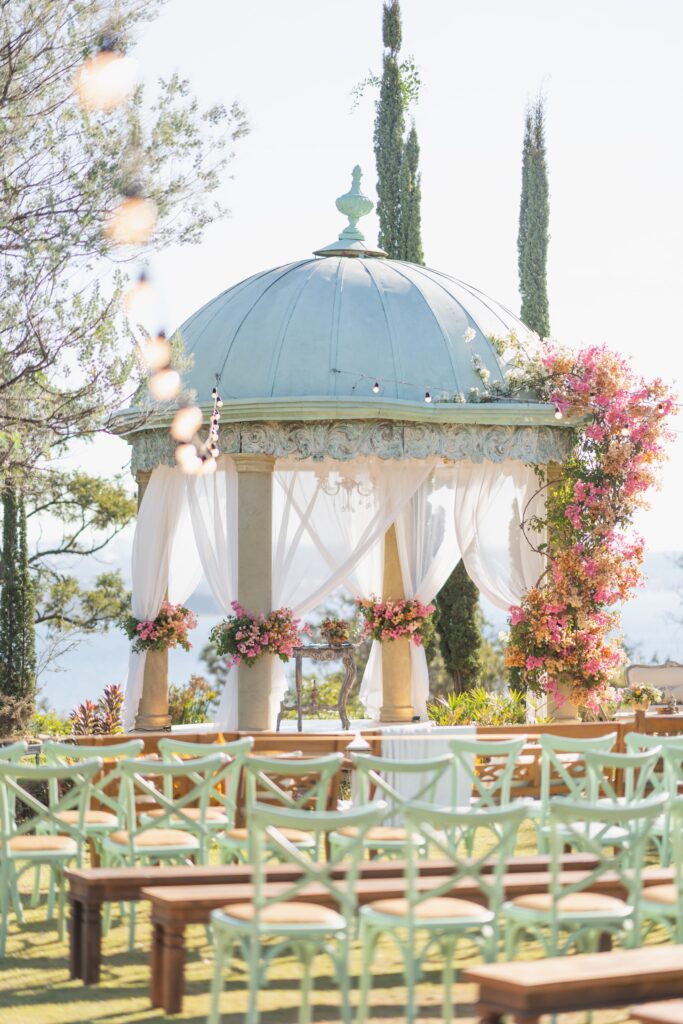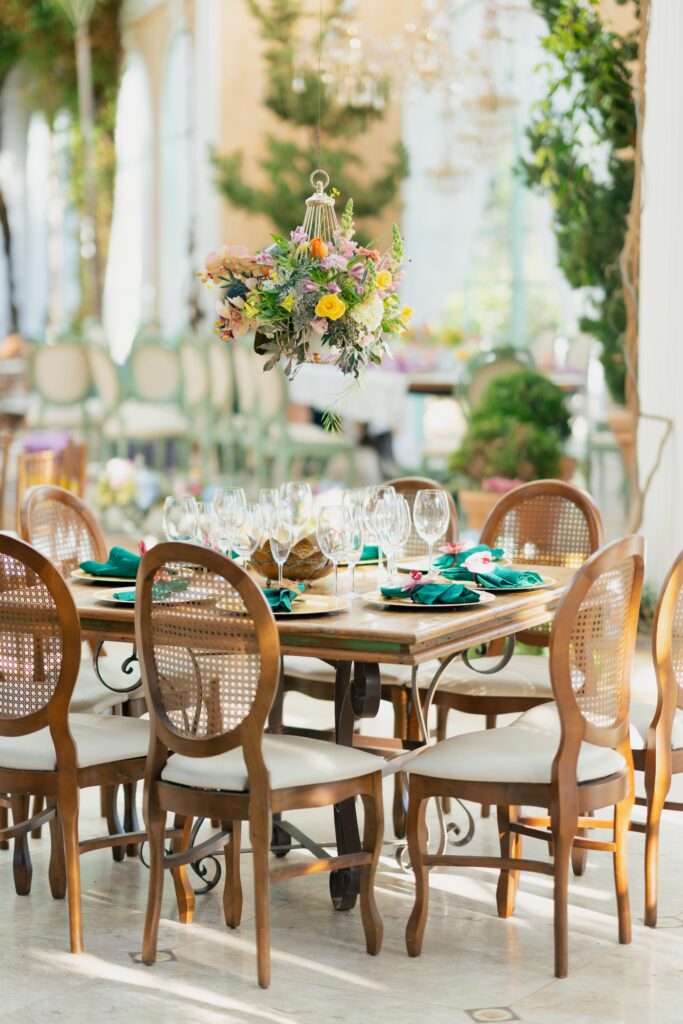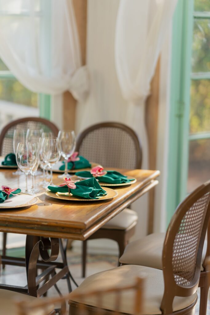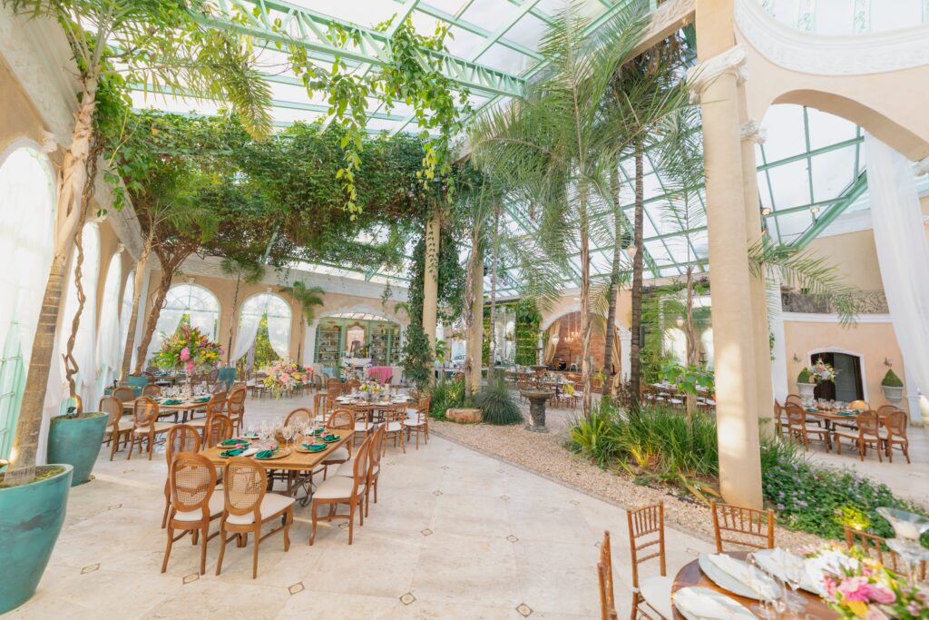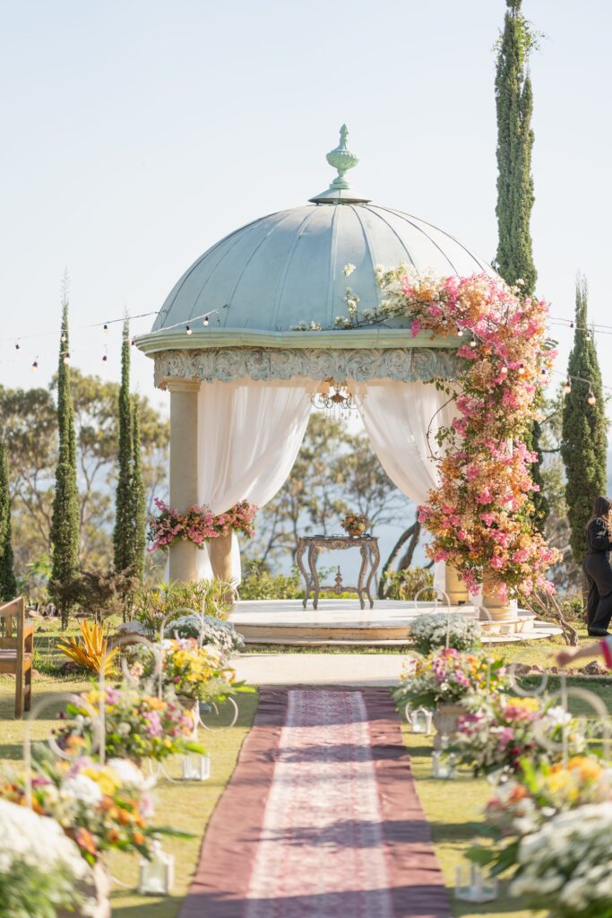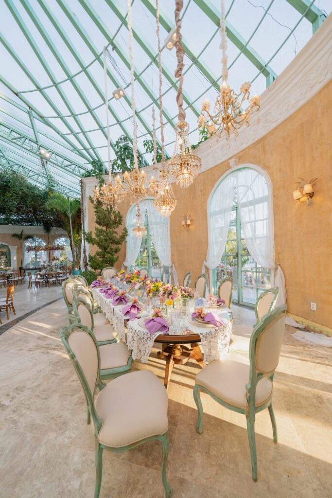 O espaço estava deslumbrante, a decoração em tons de rosa, lavanda, laranja antigo e verde, num cenário que parecia suspenso entre o real e o sonho. A Villa Giardini transformou cada detalhe em poesia, com arranjos delicados, mesas dignas de realeza e o pôr do sol servindo de moldura.