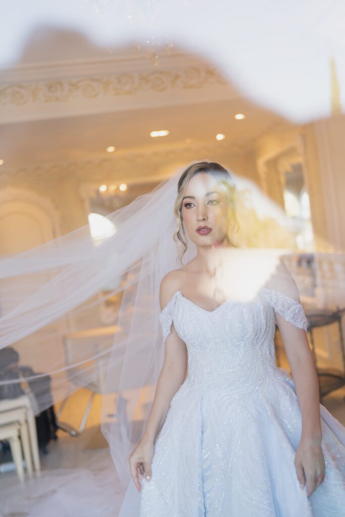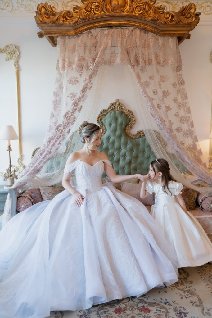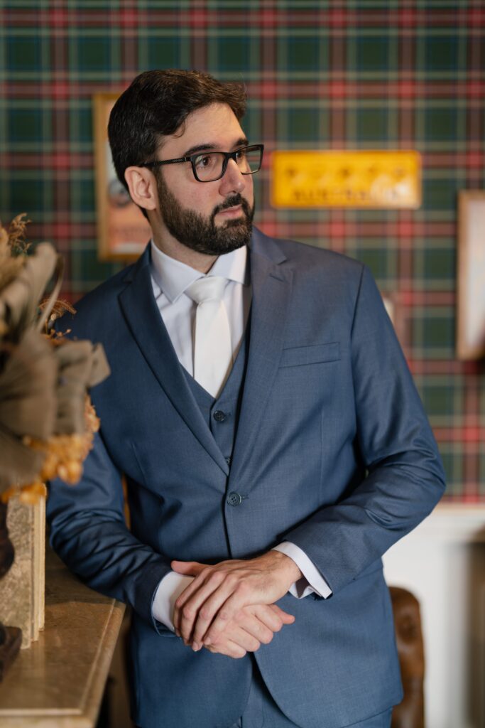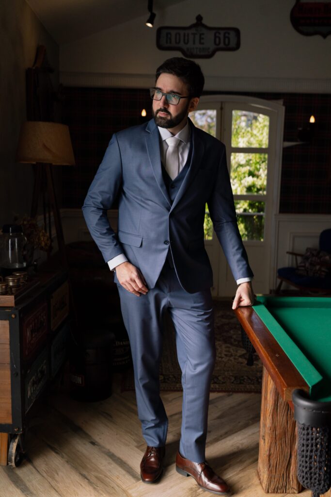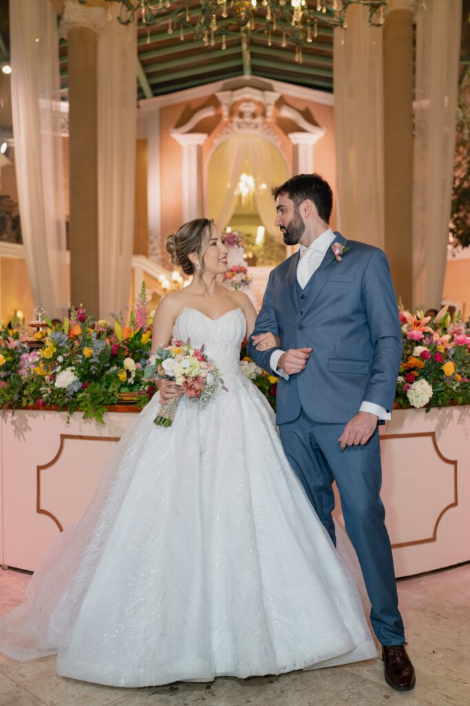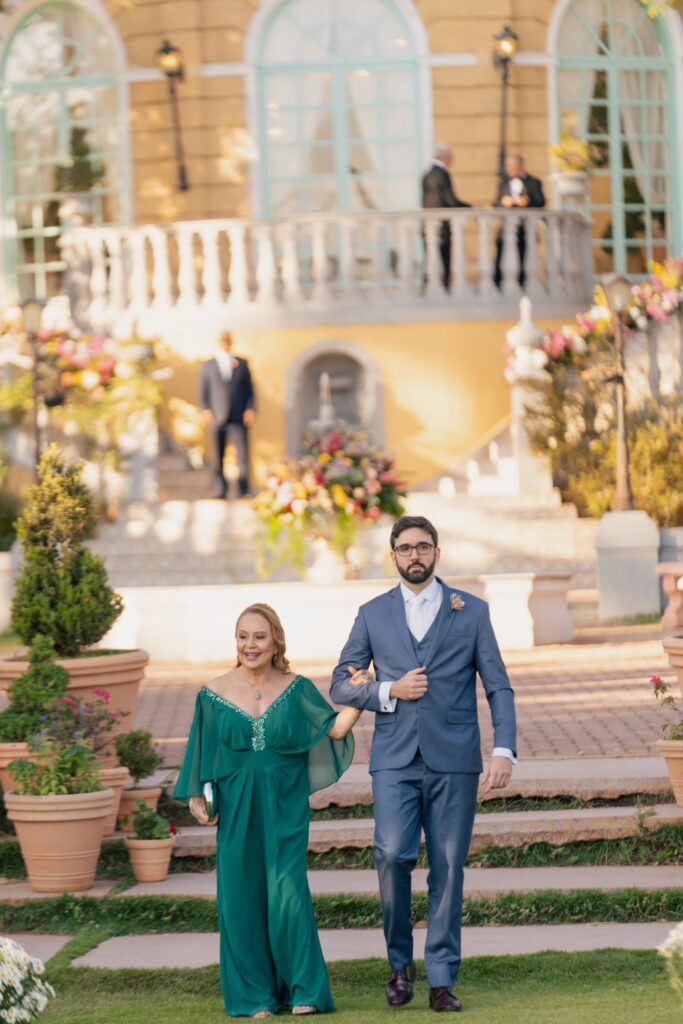 E para completar o ar de realeza, os trajes escolhidos pelos noivos ornavam ainda mais a ocasião. Kamilla estava com um vestido de brilho suave que parecia feito de emoção e luz. Já Vinícius estava em seu traje azul-índigo escolhido na companhia do pai e do sogro e com a ajuda de Léo, do Maxime Noivos, que buscou entender as paletas de cores do evento e o ajudou de maneira rápida e assertiva a escolher o melhor traje para a ocasião.