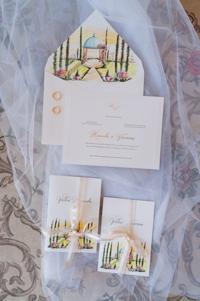 A história do casal foi contada também pela delicadeza da papelaria da Papier D’art, que traduziu sua essência em convites, menus, lembranças e diversos detalhes. Cada peça trazia o monograma envolto em uma arandela de lavandas. O destaque vai para o convite que trouxe a arte impressa do pôr do sol no gazebo do Villa Giardini com o lago e a ponte JK no fundo.