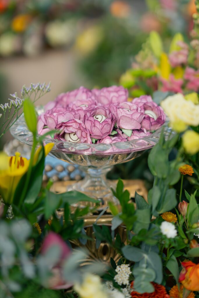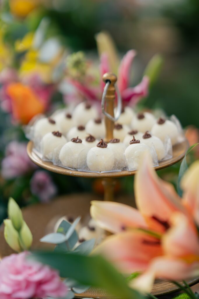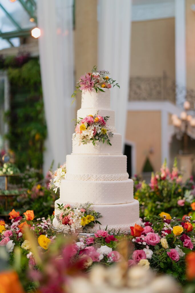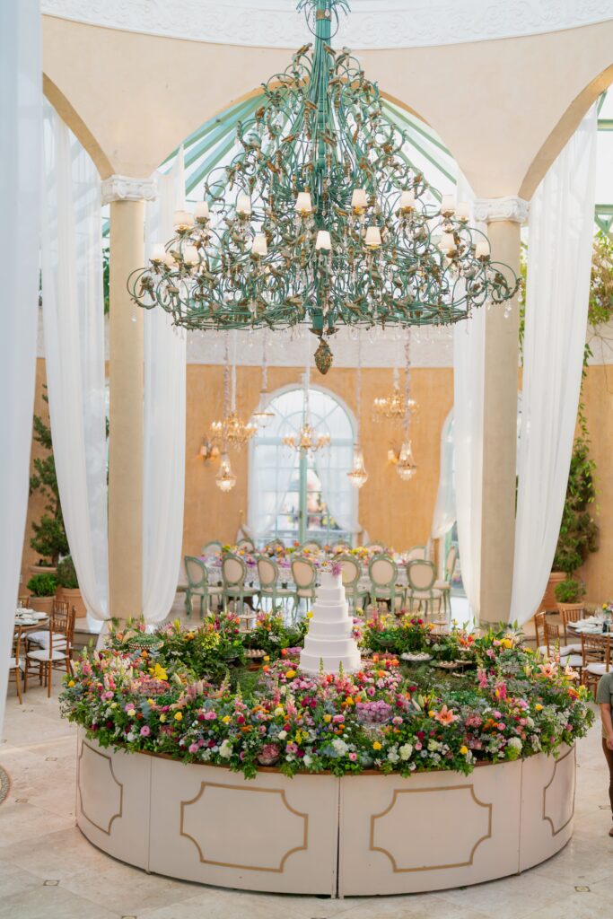 A mesa de bolo em 360°, localizada no centro do Palazzo, ficou rodeada por um jardim de flores e doces, era um espetáculo à parte. O design, aliado à decoração da Villa, transformou o espaço em um verdadeiro conto de fadas.