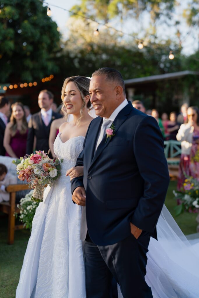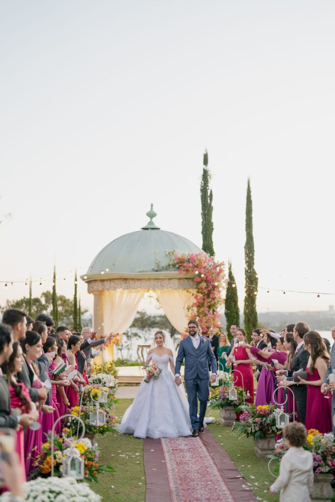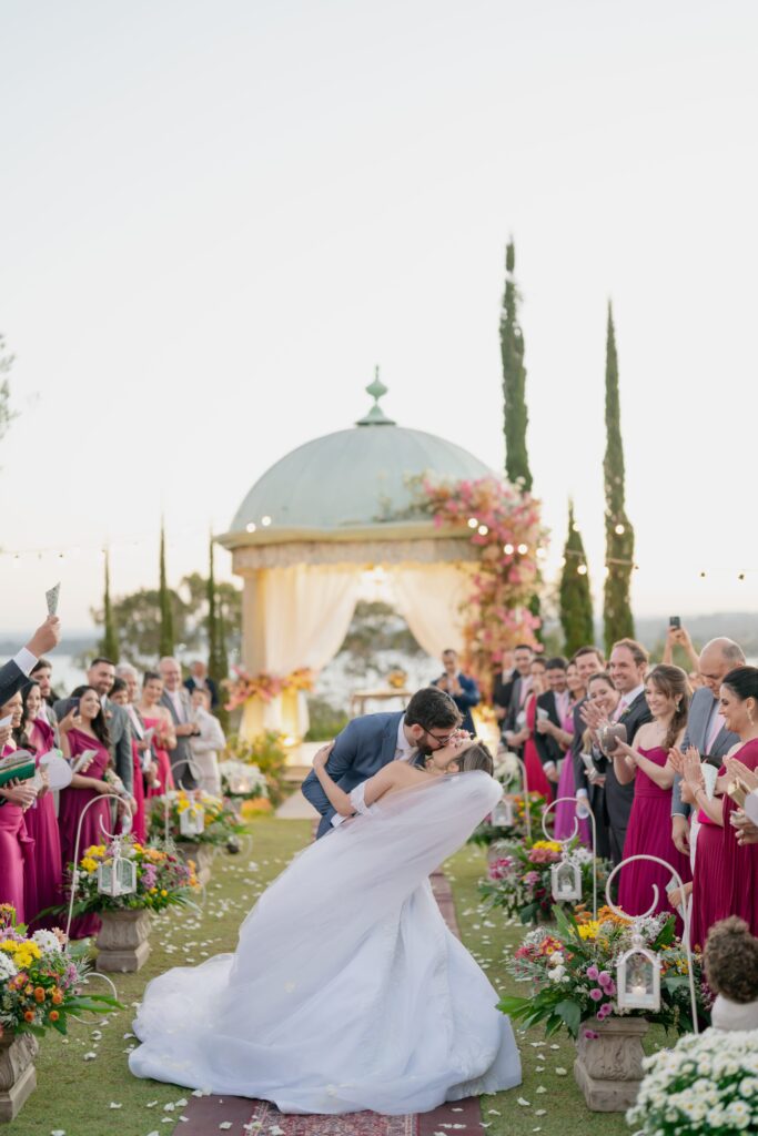 A entrada de Kamila foi anunciada pela banda Sartori com clarins e a Marcha Nupcial, seguida por ‘Sentimentos São’, de A Bela e a Fera. Um verdadeiro momento de princesa. Já Vinícius entrou ao som de ‘Perfect’, de Ed Sheeran, e juntos viveram uma cerimônia emocionante, marcada por votos intensos, discursos tocantes e pela participação especial da pequena Beatriz, filha do casal, que levou as alianças.