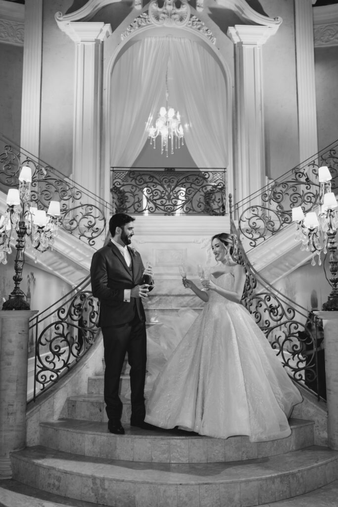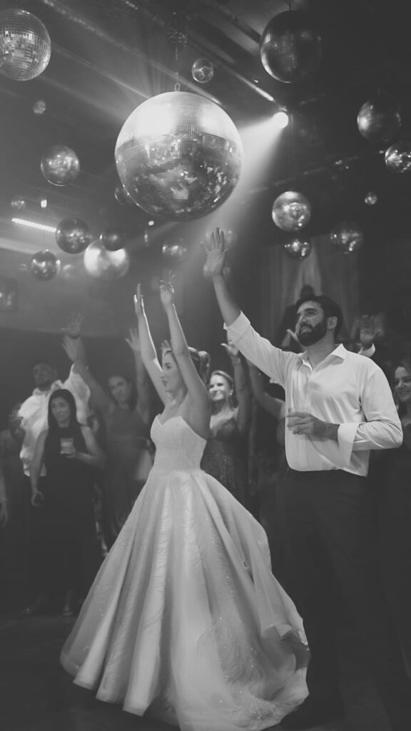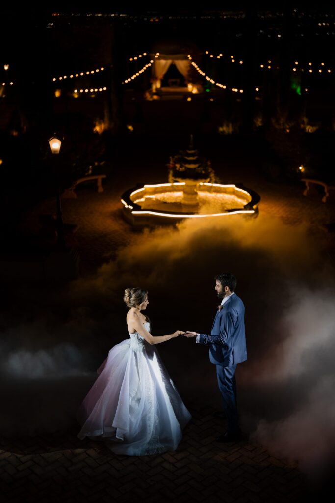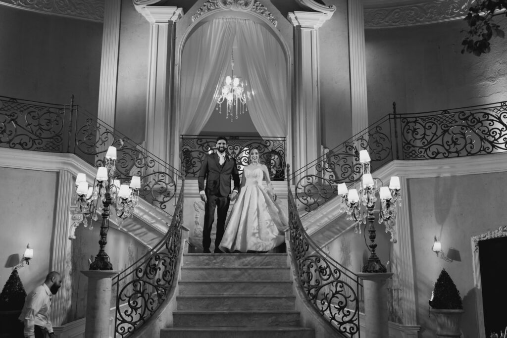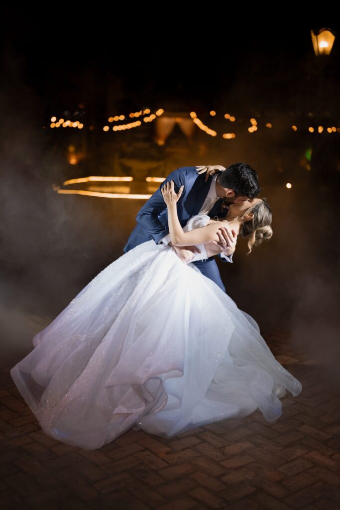 Um dos momentos mais esperados foi a dança dos noivos. Ao som de Until I Found You, eles desceram as escadas em direção ao pátio iluminado. A fumaça de gelo seco envolveu seus passos como nuvens e, quando o beijo final selou a coreografia, o céu se acendeu em fogos de artifício e os convidados celebraram com todo o entusiasmo.