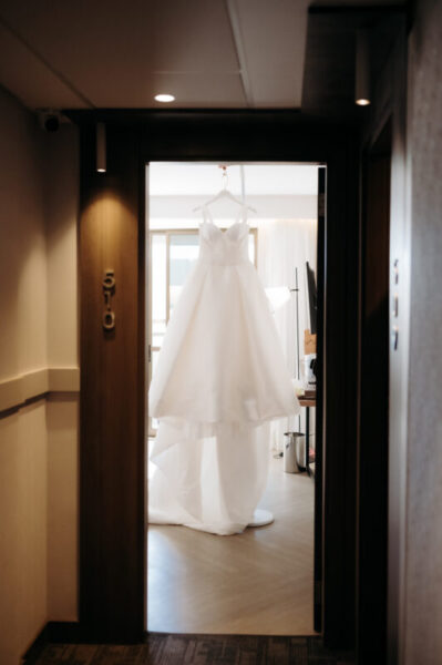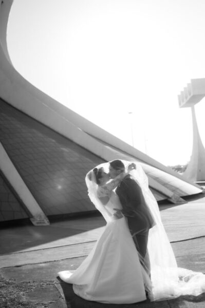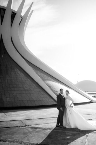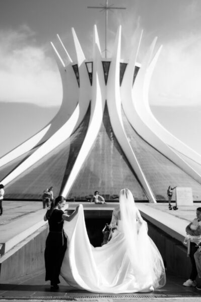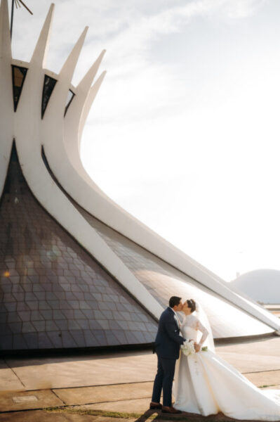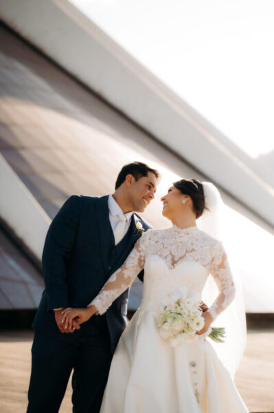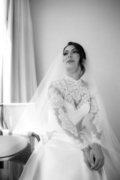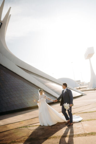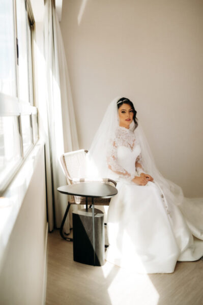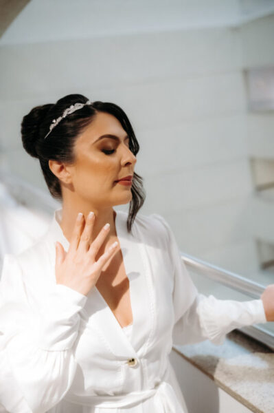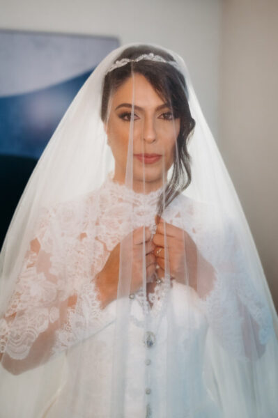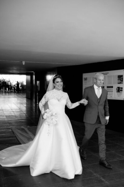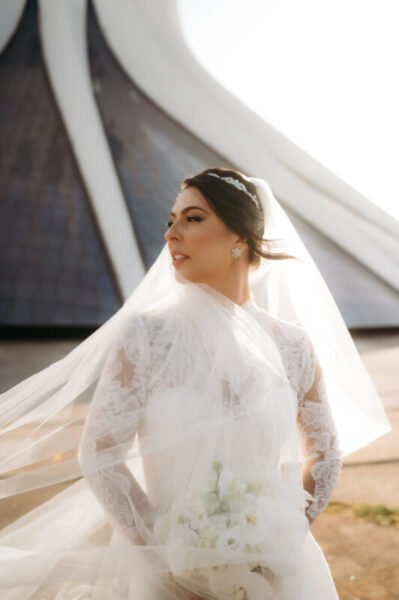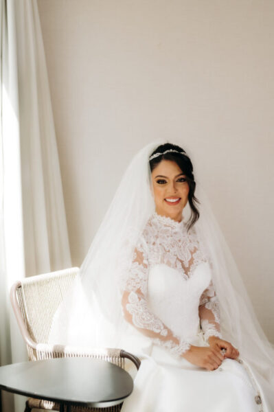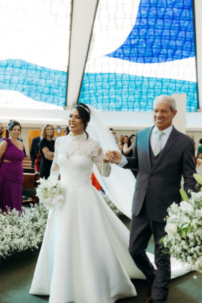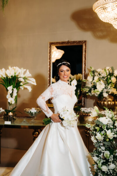 O vestido de Alessandra demorou a se revelar. Entre visitas a várias lojas, ela se encantava, mas sentia faltar algo. Até que encontrou o modelo perfeito: uma peça de cauda imponente, complementada por um bolero que a fez se enxergar, enfim, como a noiva que sempre sonhou ser. E para completar o brilho do grande dia, Alessandra escolheu suas joias e acessórios da Yssima, que lhe conferiram elegância e delicadeza em cada detalhe, além dos sapatos cuidadosamente escolhidos da Mariana Machado, que uniram beleza e conforto para que cada passo fosse seguro e gracioso.