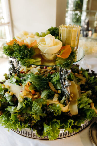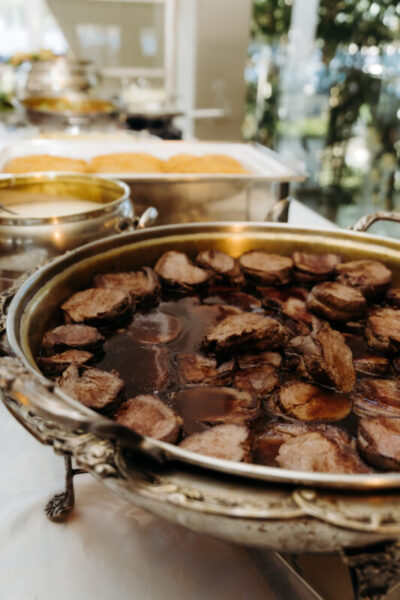 No salão, o Villa Rizza surpreendeu. Com generosidade, ofereceu muito além do contratado, servindo o buffet desde a abertura, fazendo com que todos os convidados se sentissem cuidados. O cardápio foi um espetáculo à parte: desde delicadezas volantes como pastelzinho de queijo canastra com melaço de cana e arancini de costela, até pratos principais como frango à cordon bleu, risoto de filé e ravióli de búfala com molho de tomate fresco. Tudo pensado para agradar e aquecer corações.
