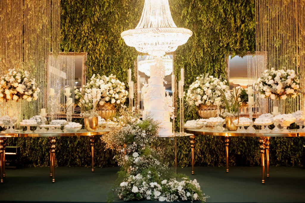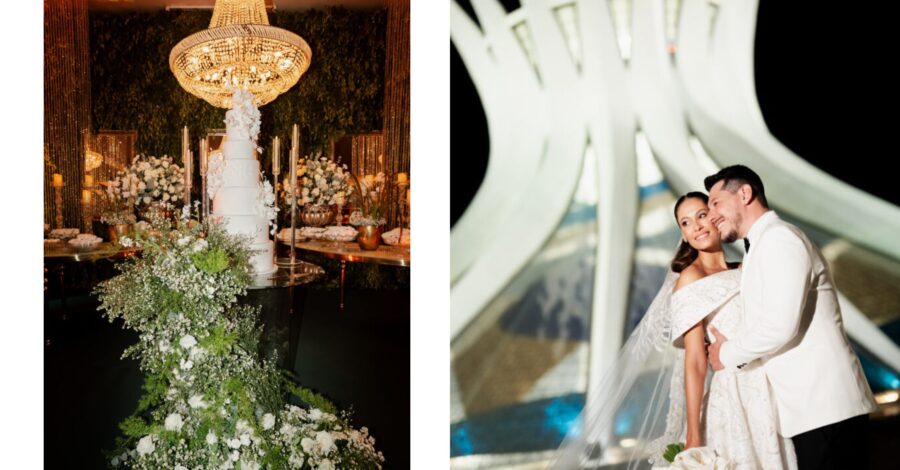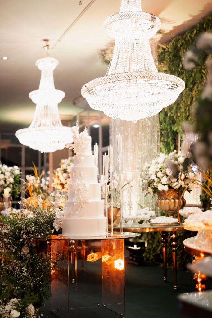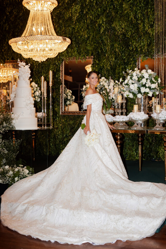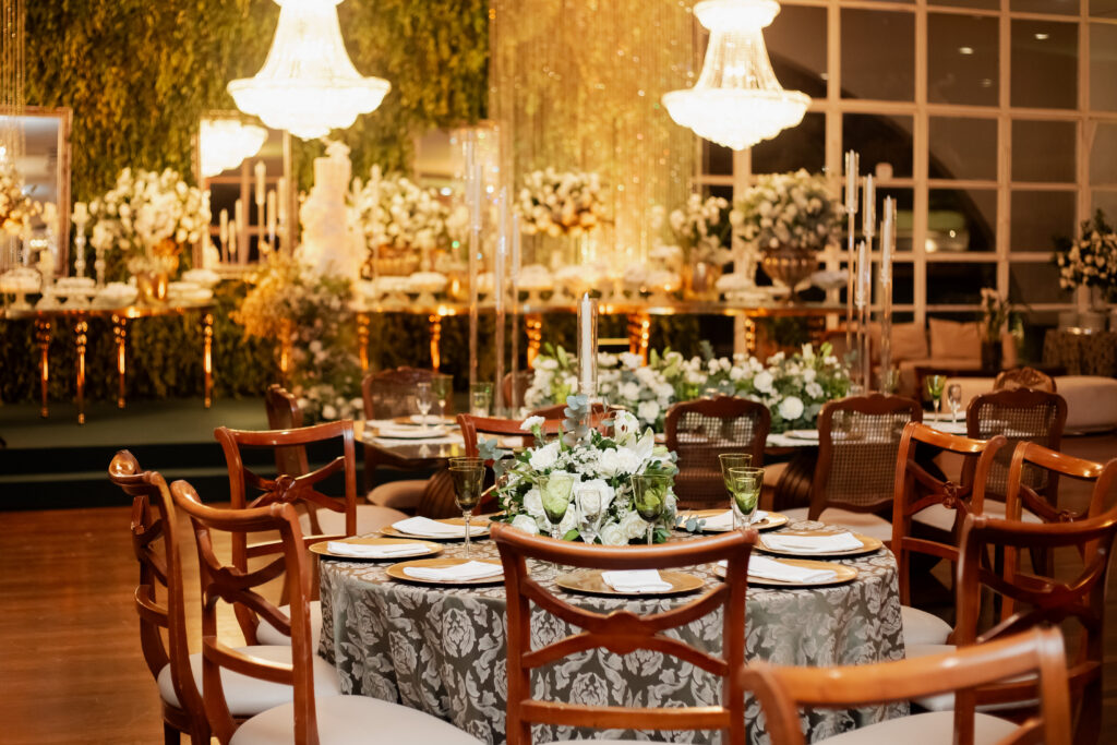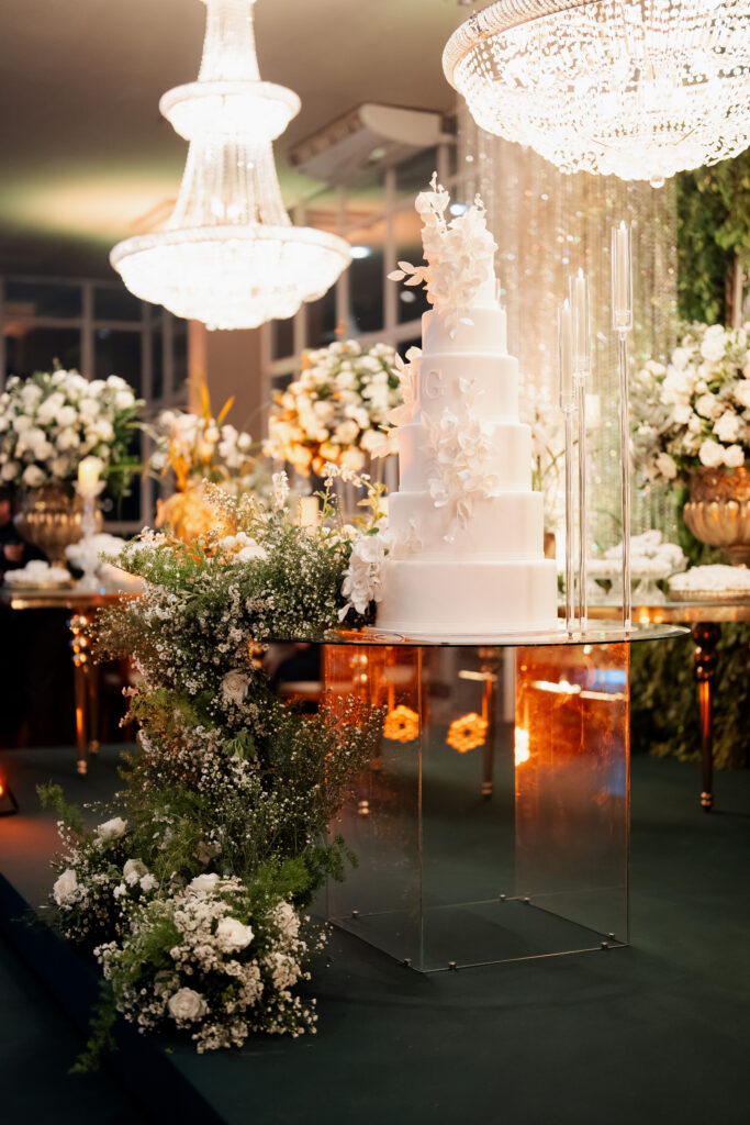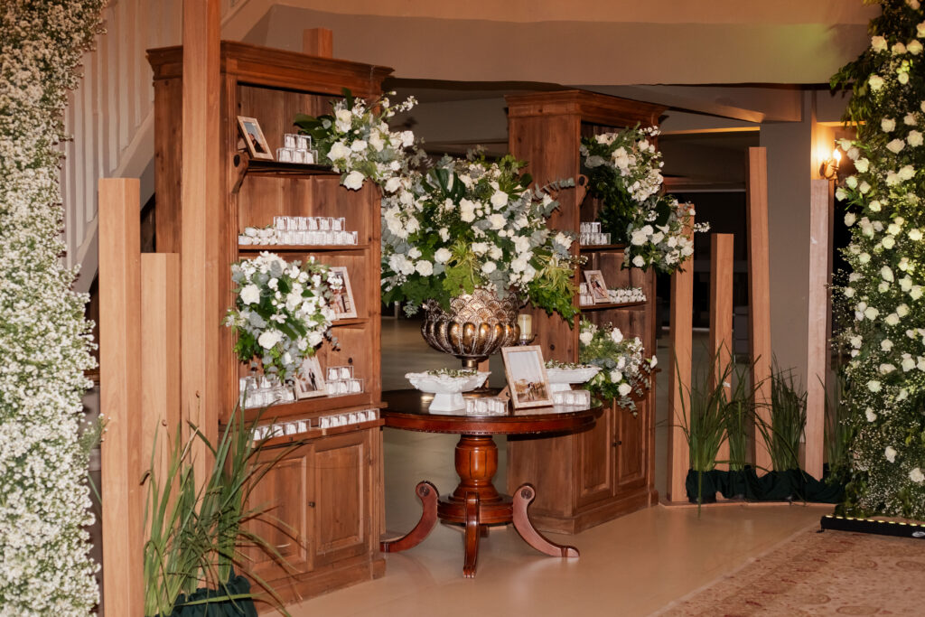 A decoração da festa, assinada pela equipe do Villa Rizza, foi um espetáculo à parte. O branco e o verde dominaram o ambiente, em uma composição clássica e atemporal, que refletia a essência do casal: sofisticada, mas com toques de modernidade. Cada flor, cada arranjo parecia sussurrar sobre pureza, harmonia e amor.