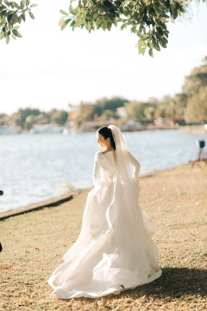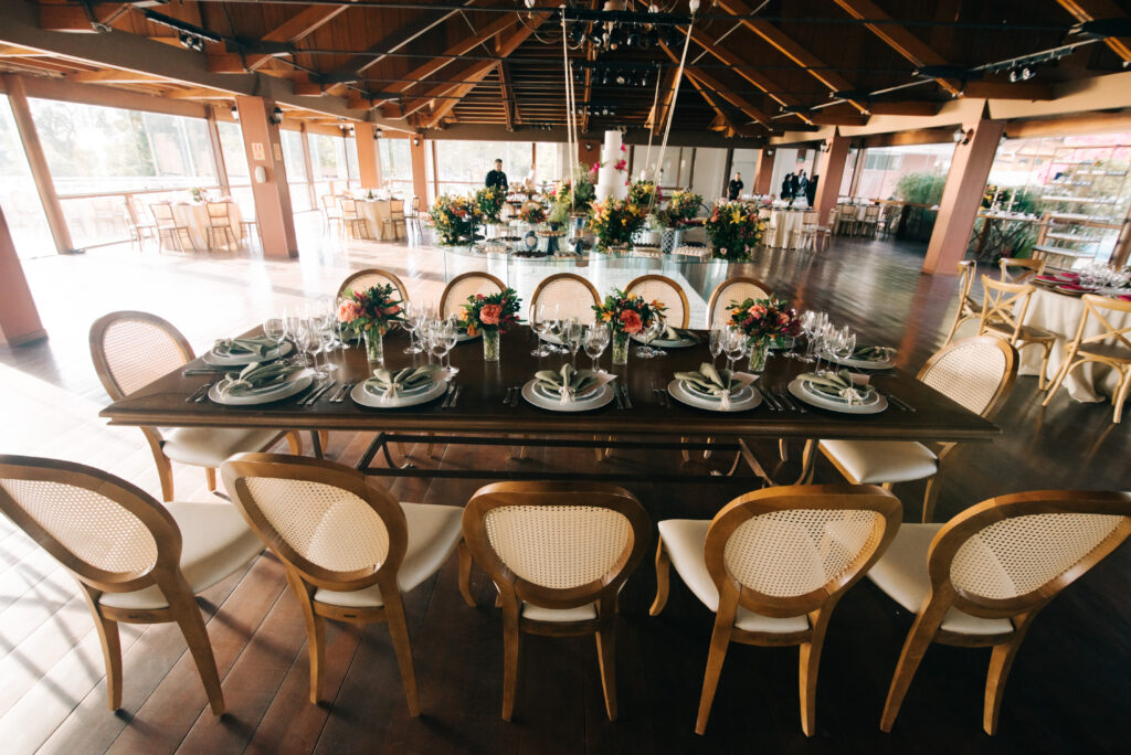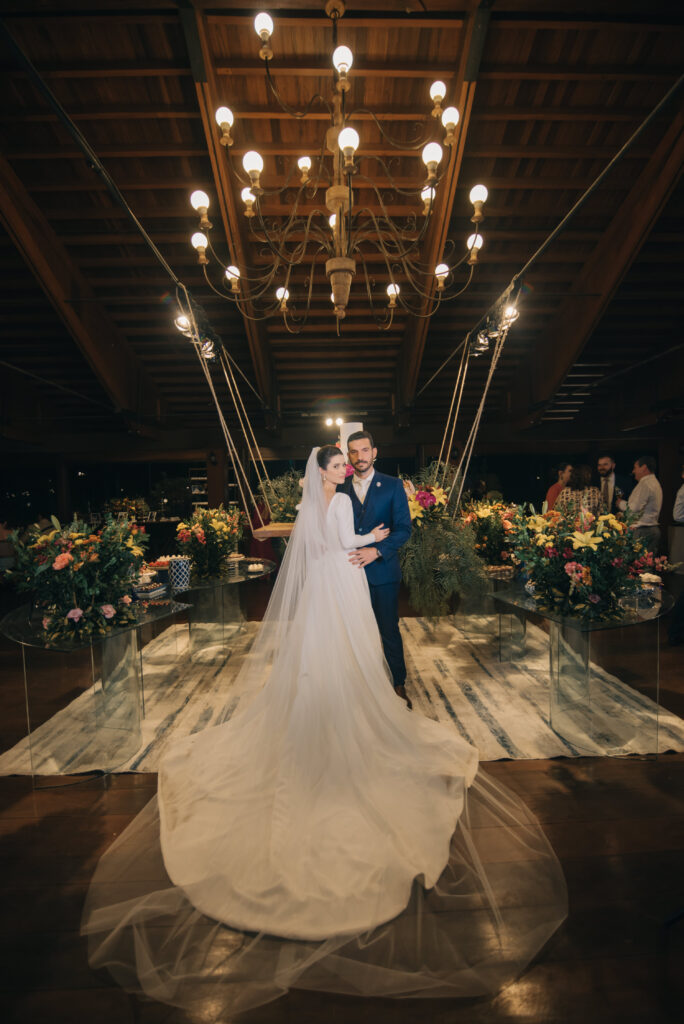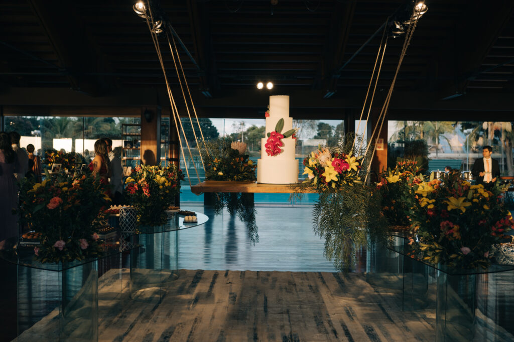 Na decoração, a Catedral foi mantida minimalista, como desejavam os noivos, para que nada ofuscasse a arquitetura do monumento. Eles optaram por um corredor de aster e o tradicional tapete vermelho. Já para a recepção, contaram com o talento da equipe da Say Yes Decor. O salão, com uma bela vista para o lago, ganhou um toque contemporâneo, com mobiliário delicado e flores de cores vivas que contrastavam com a madeira do espaço. “O que surpreendeu mesmo foi a mesa do bolo suspensa, bem centralizada no salão, com os doces dispostos em mesas orgânicas de vidro”, destaca a noiva.