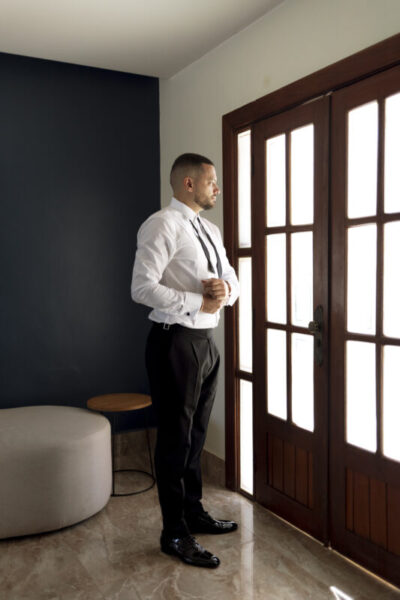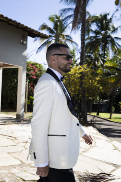 A saga do terno de Ryan também teve seus momentos de comédia e reviravolta. A missão começou com a busca do noivo e seu melhor amigo munidos de uma lista cuidadosamente preparada por Larissa com sugestões de cores e estilos, além de um pedido explícito: nada de terno preto. No entanto, o que Ryan escolheu? Um clássico smoking preto. Quando chegou em casa com a peça, Larissa quase caiu para trás de surpresa. Apesar do susto inicial, o casal conversou e Ryan acabou percebendo que o modelo realmente não refletia seu estilo. Decidido a encontrar o traje ideal, Ryan recorreu ao ChatGPT para pesquisar tons, tecidos e cortes que combinassem com o estilo da cerimônia e com sua personalidade. Chegou à conclusão de que o bege seria a melhor escolha. Foi então que encontraram uma loja que permitia a personalização completa do traje: desde o tecido (escolheram alpaca), passando pelo tipo de gola e bolsos, até as iniciais do casal bordadas com discrição. O resultado foi um terno feito sob medida, elegante e único.