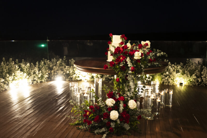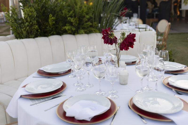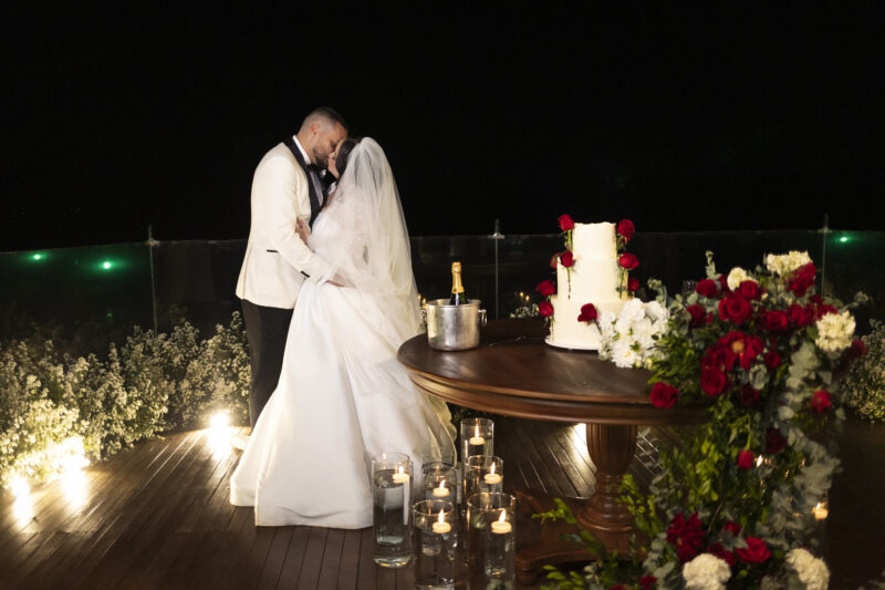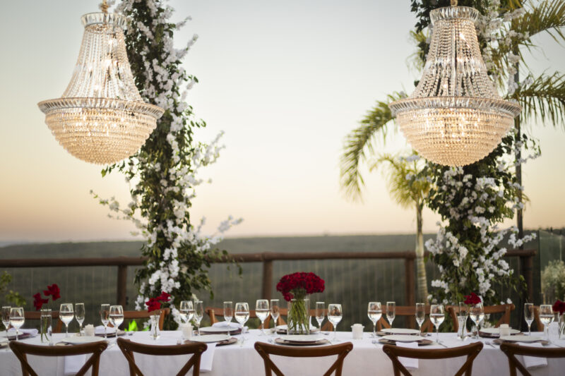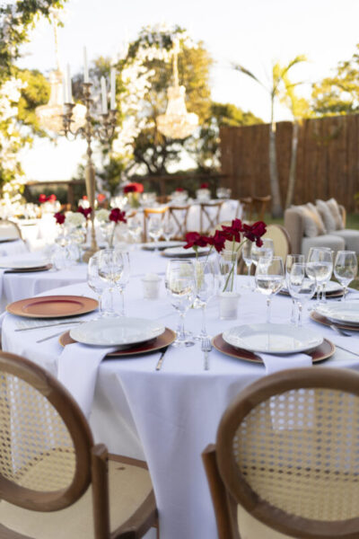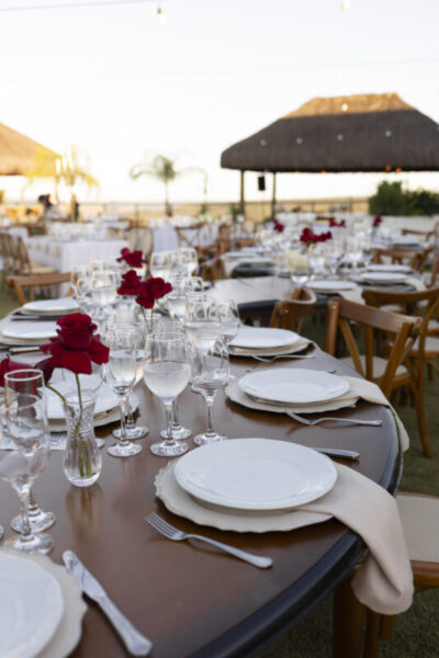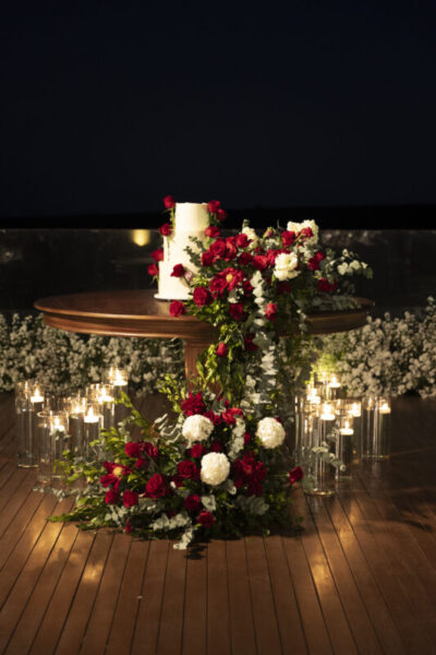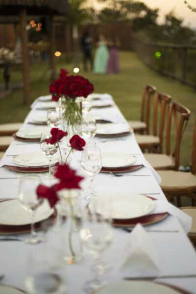 Já na recepção, Larissa queria transportar os convidados diretamente para a Toscana. Mesas coletivas, luzes aconchegantes e elementos que evocassem a vivência italiana foram cuidadosamente escolhidos. A proposta era que cada detalhe contasse um pedaço da história do casal, com cheiro, cor e memória. Outra referência que inspirou a ambientação foi o clássico A Bela e a Fera, não pela trama, mas pelo clima romântico, com lustres, castiçais, velas e a presença marcante das rosas vermelhas. O resultado foi um cenário acolhedor e encantador.
