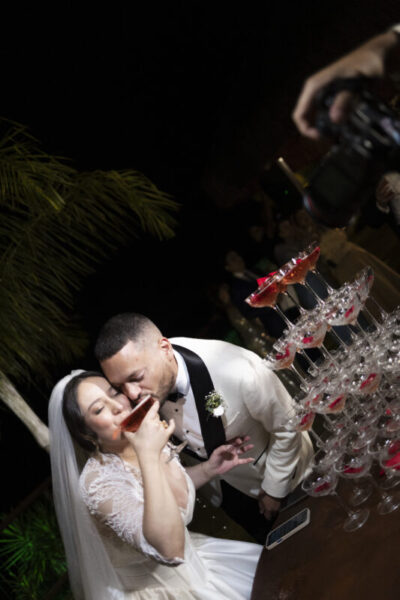 Outro destaque foi o atendimento impecável do Buffet Federal, especialmente do garçom Jobi, que acompanhou o casal com atenção VIP durante toda a festa. Sempre presente na cabana dos noivos, ele foi gentil, prestativo e até ajudou Larissa a manter o equilíbrio entre os brindes, servindo vinho na medida certa e sempre atento ao que eles precisavam. Um cuidado que fez toda a diferença e ficou na memória dos noivos.