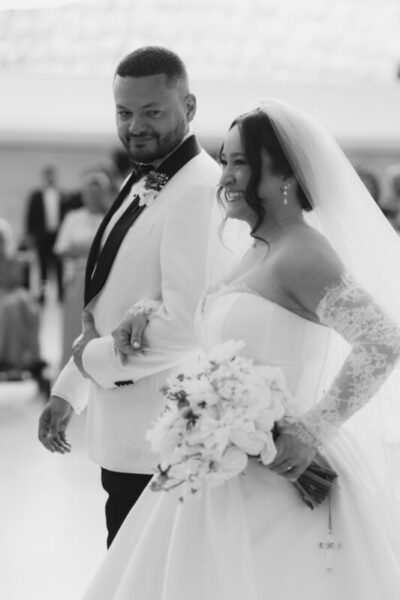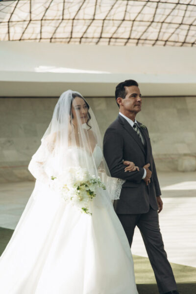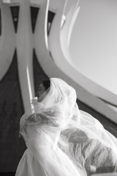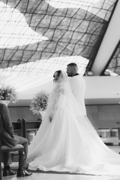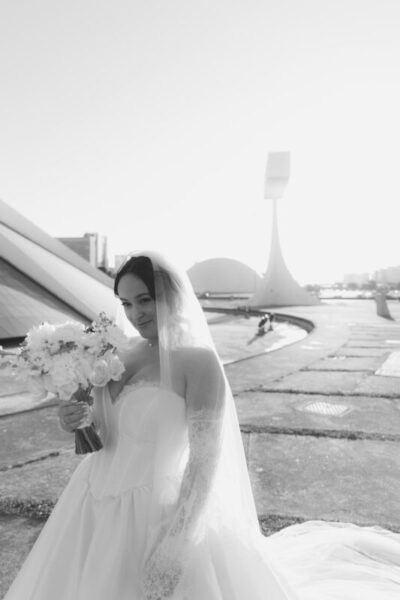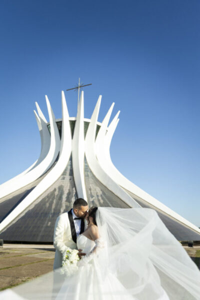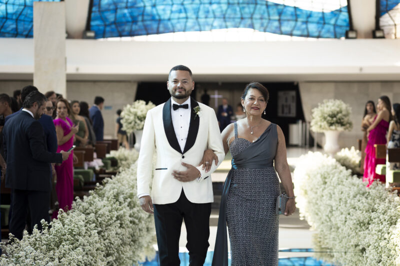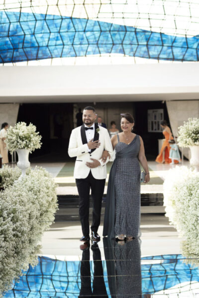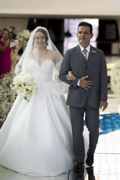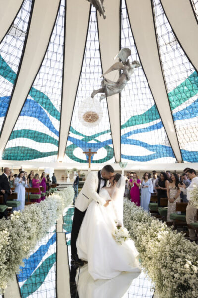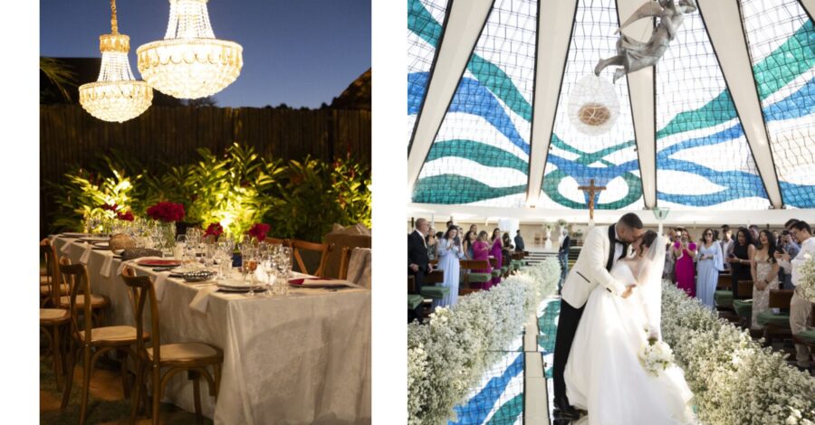 A decoração do casamento de Larissa e Ryan foi pensada como uma extensão da história dos dois, não apenas estética, mas sensorial e afetiva. Para a cerimônia religiosa, realizada na Catedral Metropolitana de Brasília, Larissa se inspirou na elegância italiana do Lake Como. A ideia inicial incluía ânforas repletas de rosas diversas, mas, devido aos altos preços das flores na época do Dia dos Namorados, optou-se por uma composição mais minimalista: rosas brancas com asters, dispostas ao longo do caminho. A própria noiva reconheceu a força arquitetônica da catedral e defendeu a simplicidade como um contraponto sofisticado. “Brinquei com minha decoradora e disse: ‘Finge que você está num reality de decoração com orçamento limitado e faça o melhor!’”, conta, bem-humorada. Após algumas conversas por telefone, chegaram a um consenso elegante e delicado.
