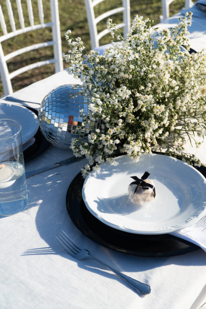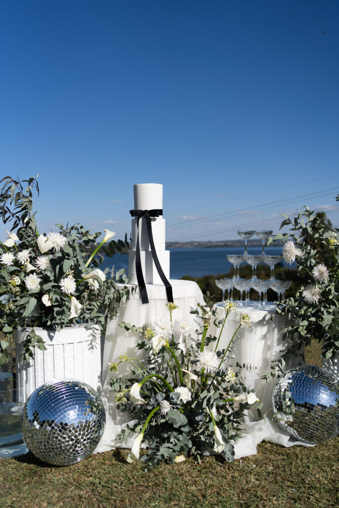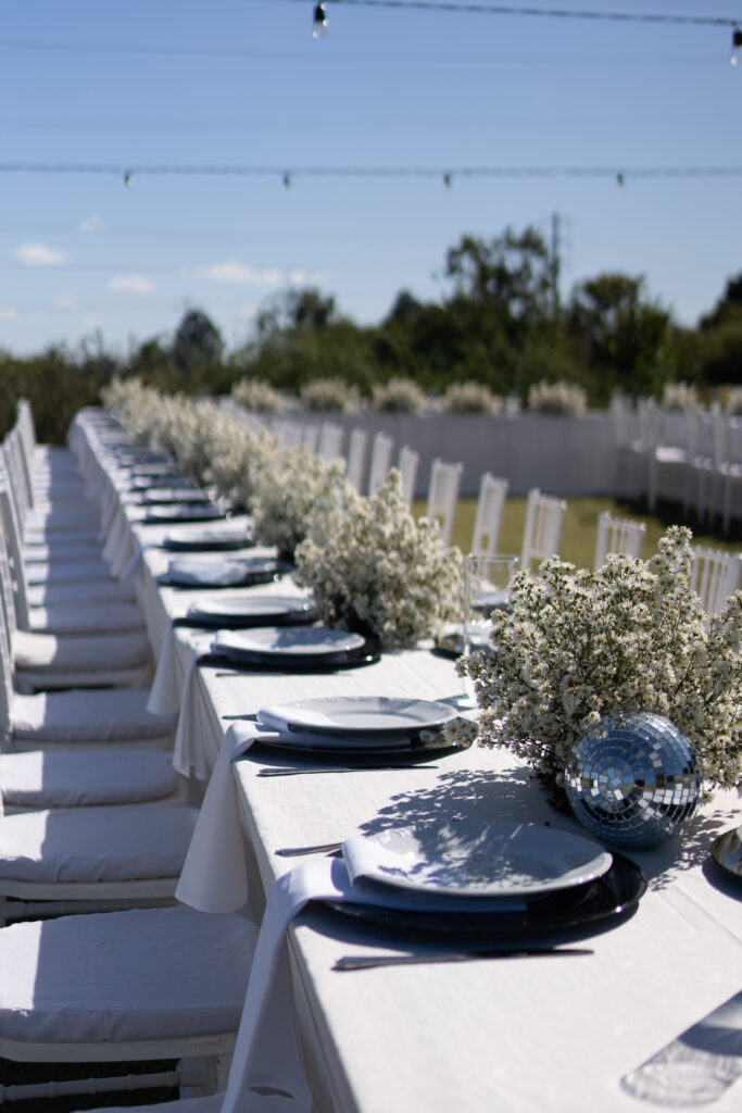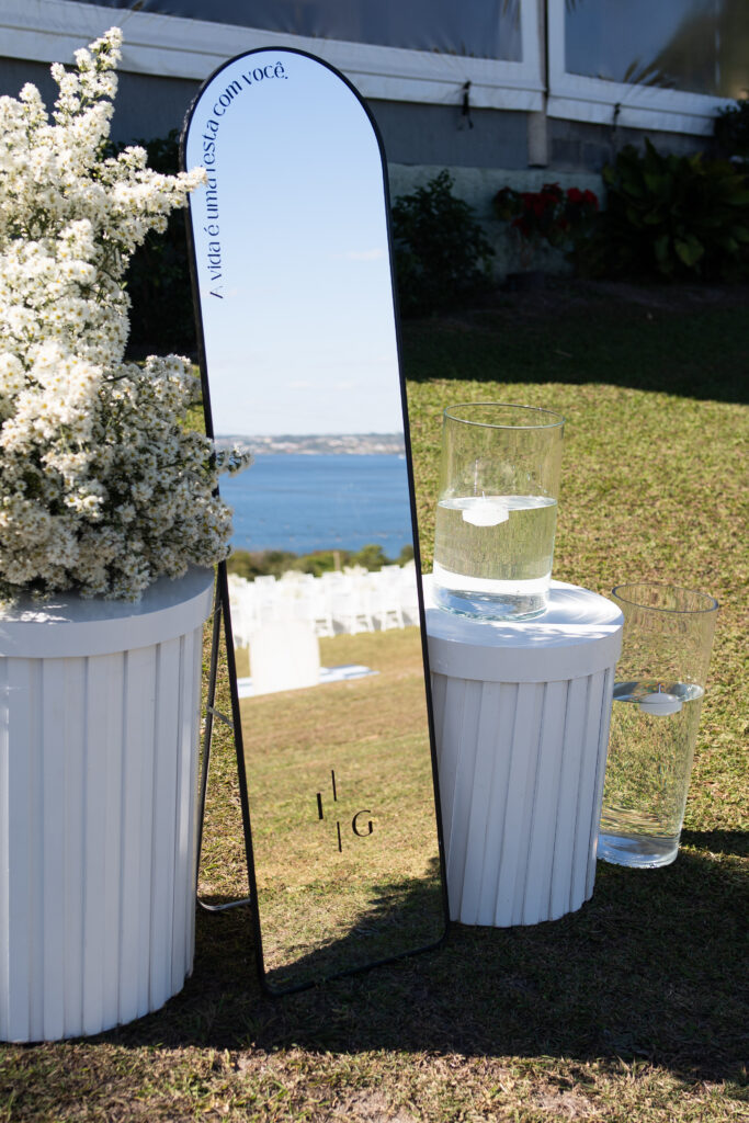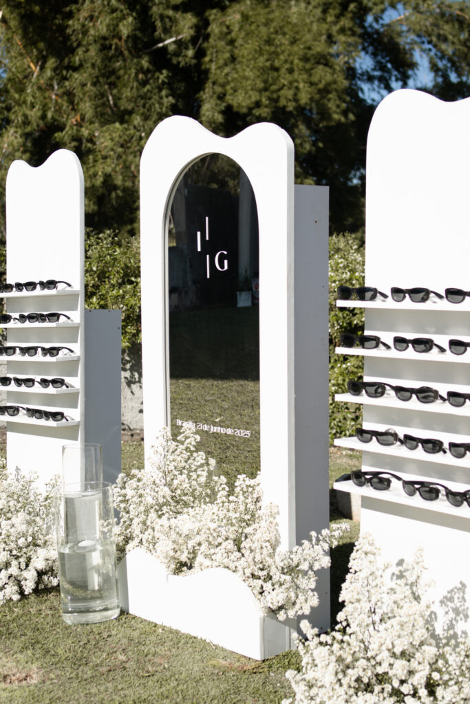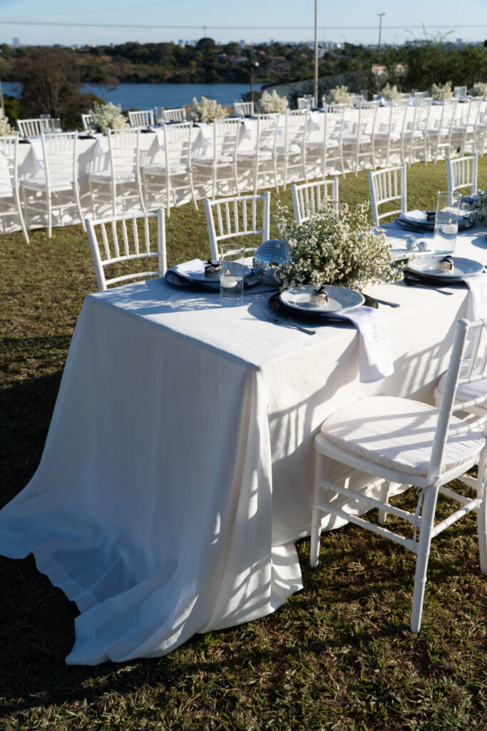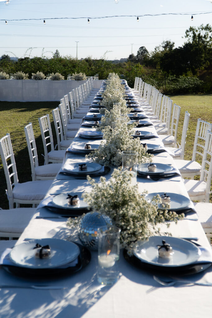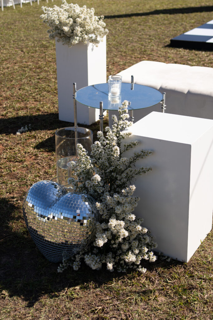E a decoração teve papel central na narrativa do dia. Tudo foi pensado para comunicar sensações e estimular a interação entre os convidados. A proposta contemporânea e minimalista se manifestava em painéis criativos, globos espelhados espalhados pelo espaço e até óculos de sol disponíveis desde a cerimônia até a pista de dança. Como um aceno às origens cariocas da noiva, Biscoitos Globo receberam os convidados logo na chegada. O mobiliário branco, com detalhes pontuais em preto, dialogava diretamente com os vestidos das madrinhas, criando uma composição visual coesa. A mesa comunitária em formato de “U”, composta por uma mesa posta com arranjos e velas, reforçava o clima de proximidade e acolhimento.