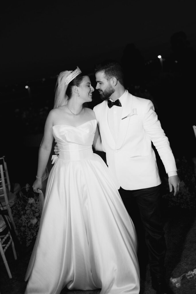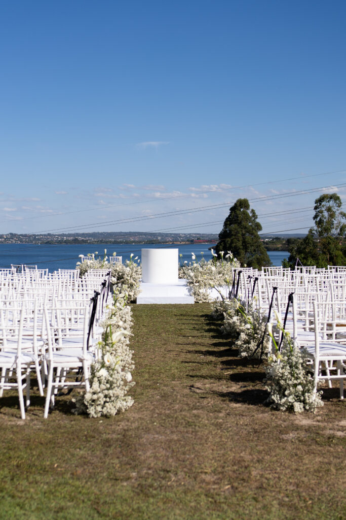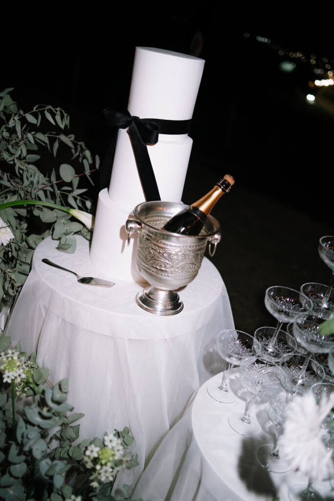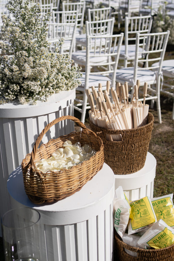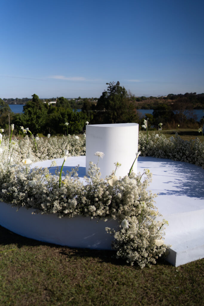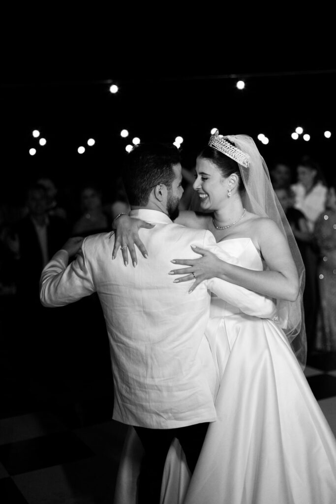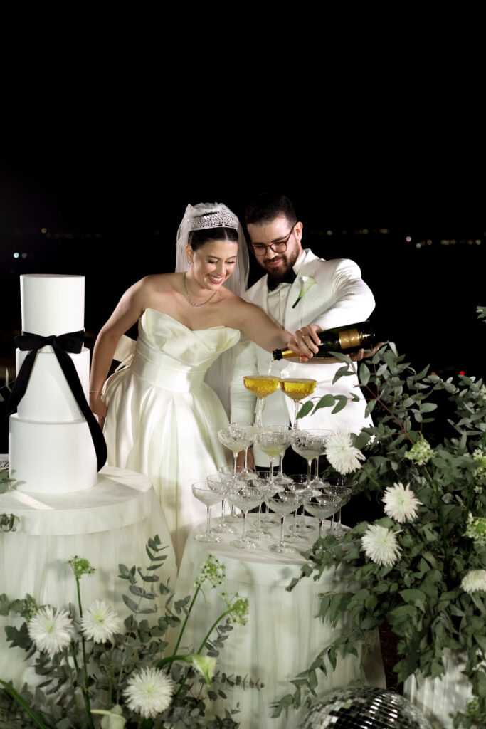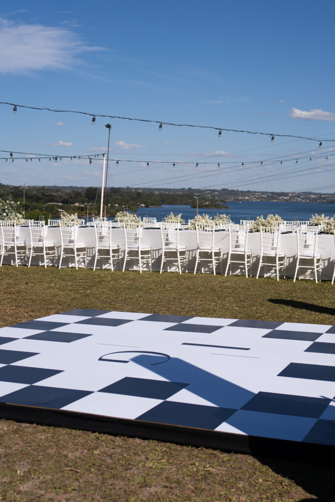 E a decoração teve papel central na narrativa do dia. Tudo foi pensado para comunicar sensações e estimular a interação entre os convidados. A proposta contemporânea e minimalista se manifestava em painéis criativos, globos espelhados espalhados pelo espaço e até óculos de sol disponíveis desde a cerimônia até a pista de dança. Como um aceno às origens cariocas da noiva, Biscoitos Globo receberam os convidados logo na chegada. O mobiliário branco, com detalhes pontuais em preto, dialogava diretamente com os vestidos das madrinhas, criando uma composição visual coesa. A mesa comunitária em formato de “U”, composta por uma mesa posta com arranjos e velas, reforçava o clima de proximidade e acolhimento.