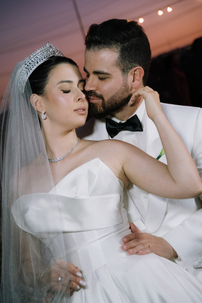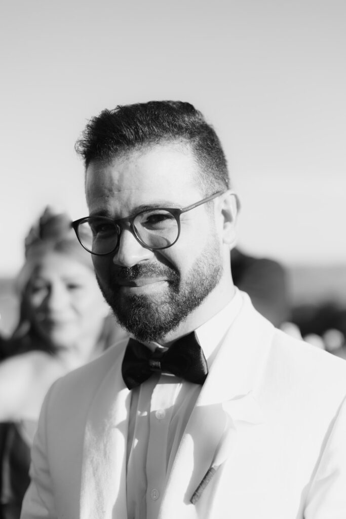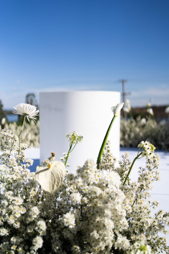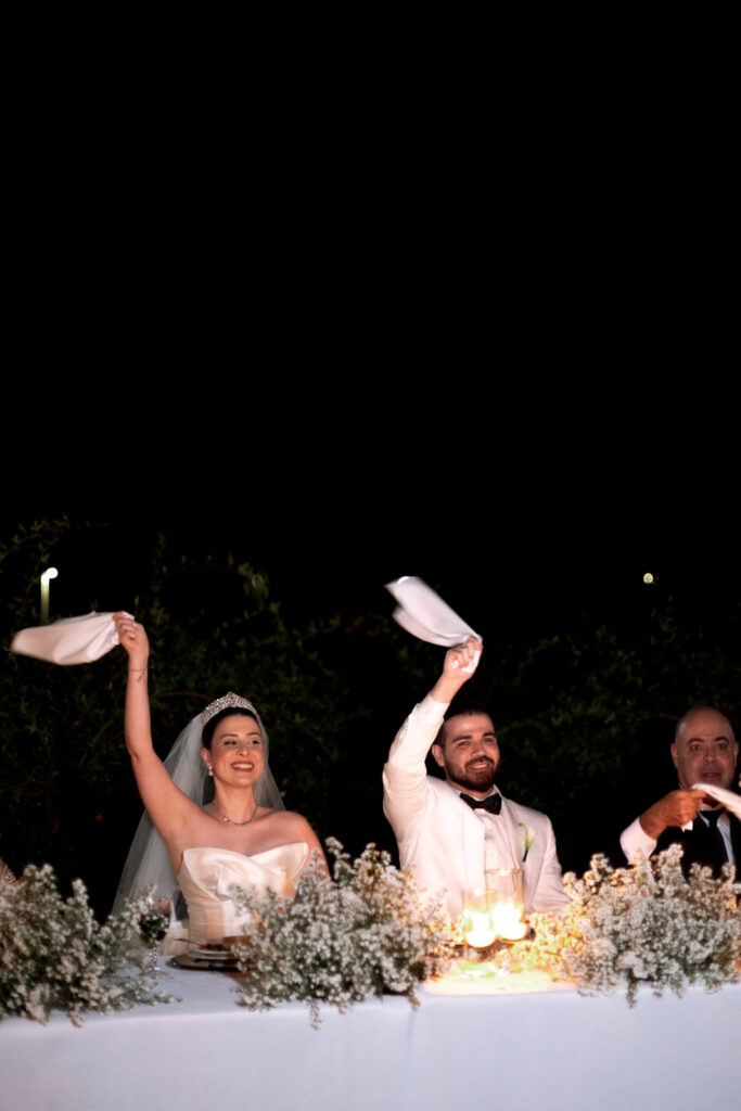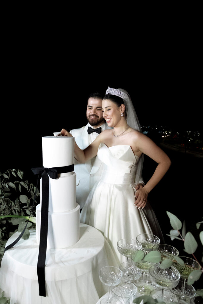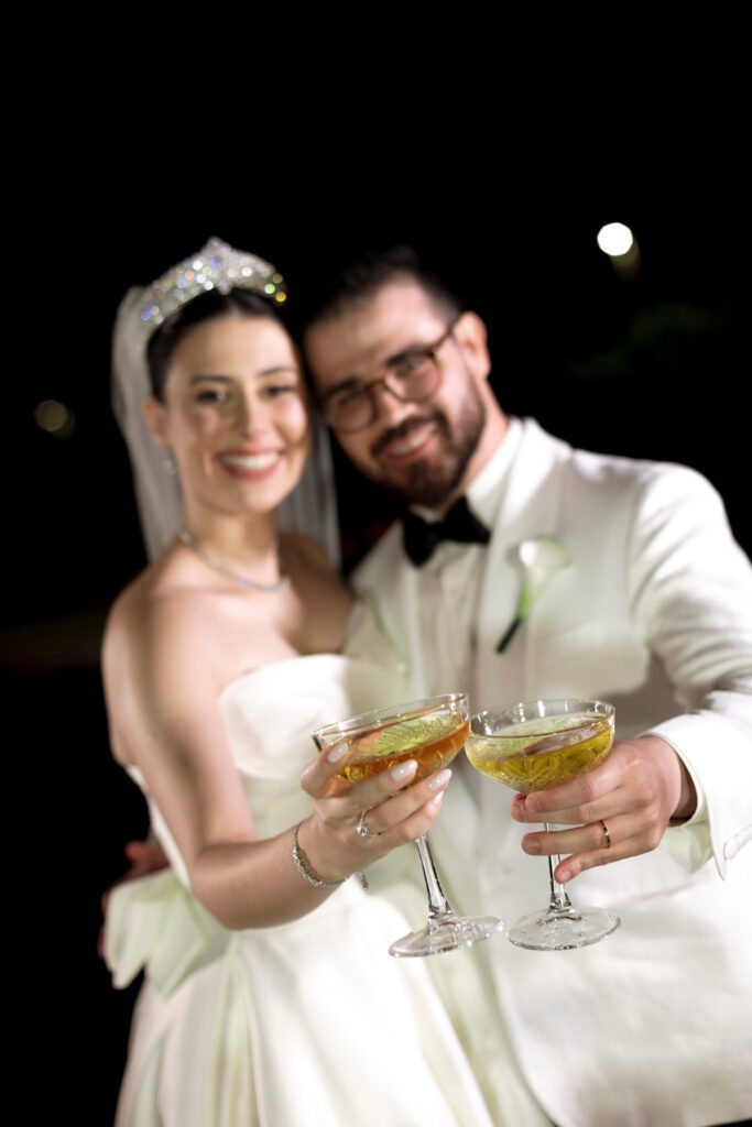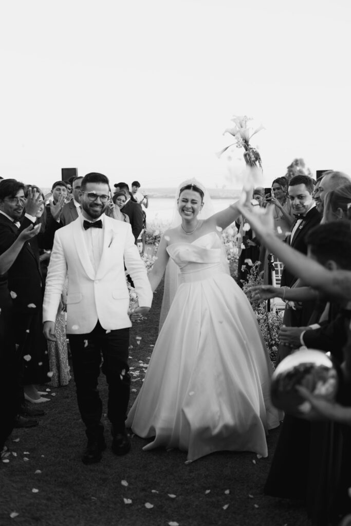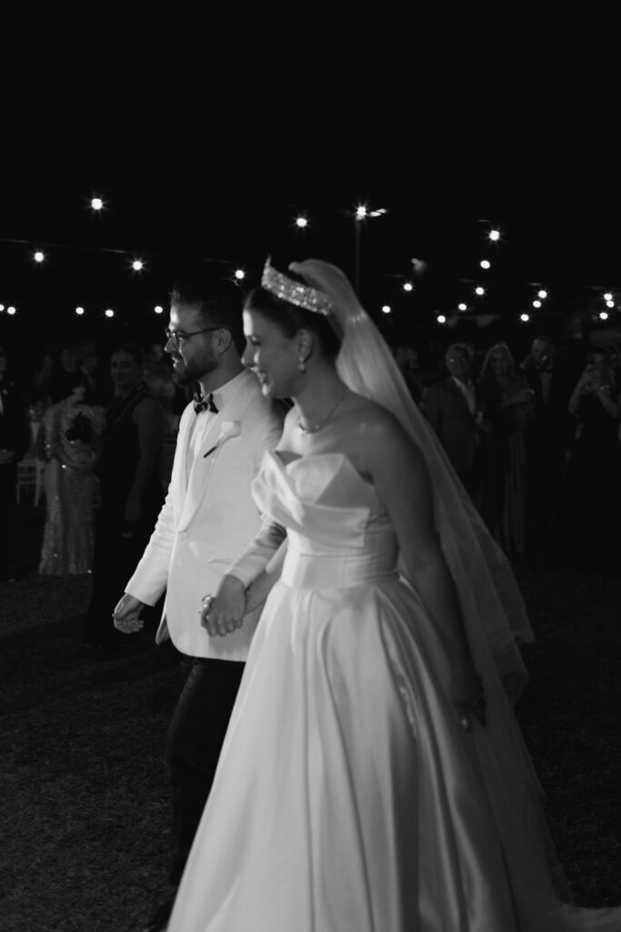 E a decoração teve papel central na narrativa do dia. Tudo foi pensado para comunicar sensações e estimular a interação entre os convidados. A proposta contemporânea e minimalista se manifestava em painéis criativos, globos espelhados espalhados pelo espaço e até óculos de sol disponíveis desde a cerimônia até a pista de dança. Como um aceno às origens cariocas da noiva, Biscoitos Globo receberam os convidados logo na chegada. O mobiliário branco, com detalhes pontuais em preto, dialogava diretamente com os vestidos das madrinhas, criando uma composição visual coesa. A mesa comunitária em formato de “U”, composta por uma mesa posta com arranjos e velas, reforçava o clima de proximidade e acolhimento.