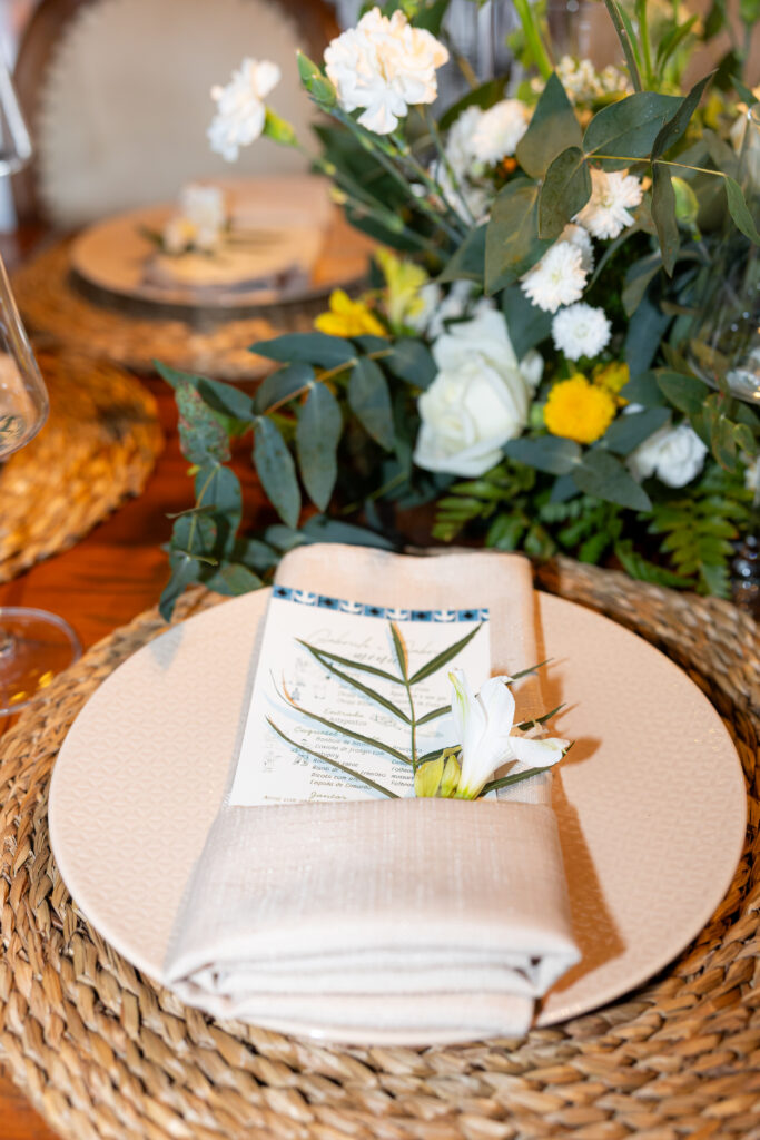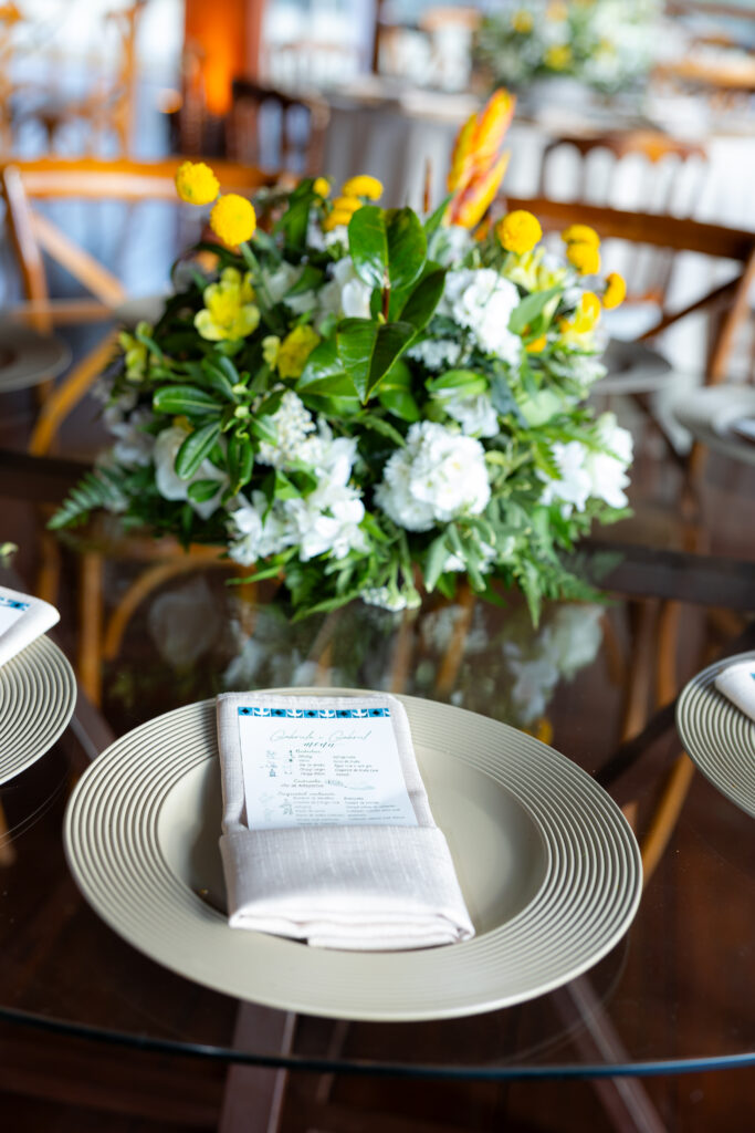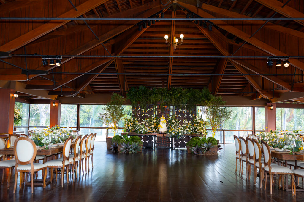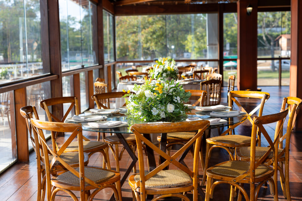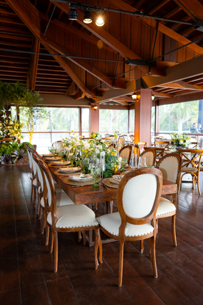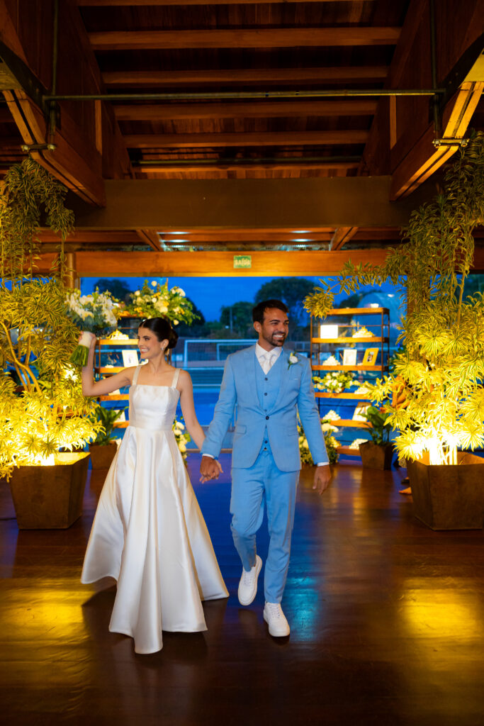 A Hacsa Decoração deu vida a um conceito que refletia a essência dos dois: minimalismo, elegância e significado. O verde e branco, pensados inicialmente, receberam toques sutis de amarelo, cor inspirada no ipê — símbolo de Brasília e do próprio amor que floresceu ali. O espaço emanava harmonia. Já o buquê da noiva, também assinado pela Hacsa, era uma extensão dessa energia delicada.