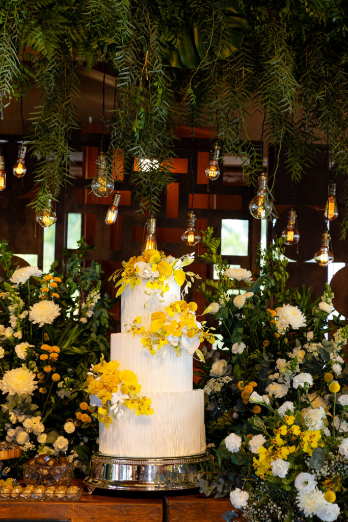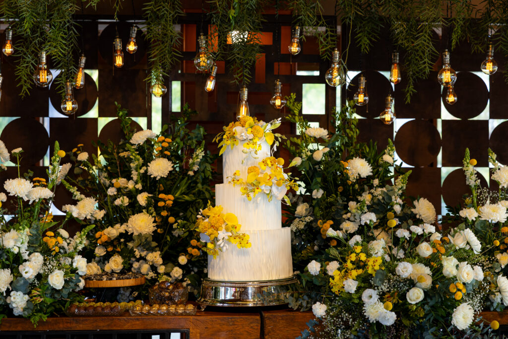 A mesa de doces e bolos também harmonizou com a beleza e elegância da decoração. A maquete do bolo, criada pela Baruka Cake, encantava os olhos com sua delicadeza e ornou perfeitamente com o ambiente. Enquanto os bem-casados da Savant Doces Especiais adoçavam o fim da cerimônia com o sabor de novos começos.