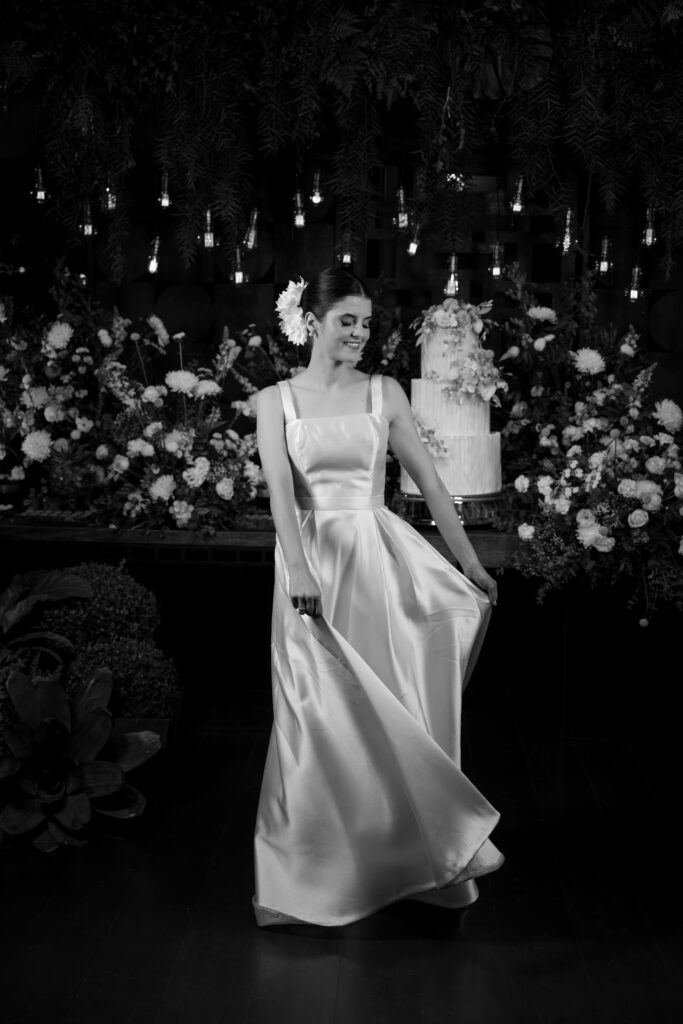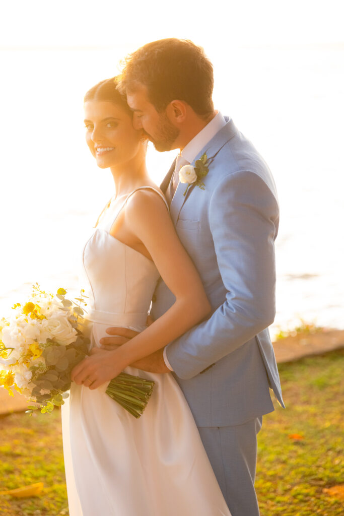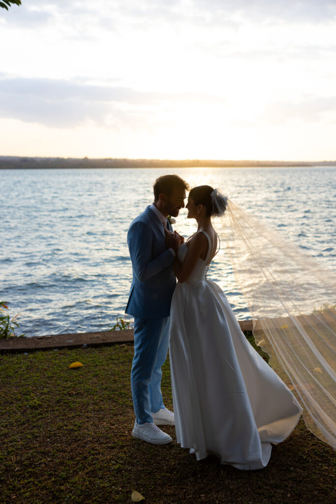 O vestido da noiva foi um sonho se tornando realidade, com um estilo minimalista, atemporal e encantador. A flor no cabelo, escolhida como ponto de destaque, parecia sussurrar poesia. O noivo, fiel ao próprio estilo, utilizou um terno do Maxine noivos e apostou no conforto ao combinar o traje com o tênis. O que trouxe um toque despretensioso e encantador, provando que elegância e autenticidade podem caminhar lado a lado.