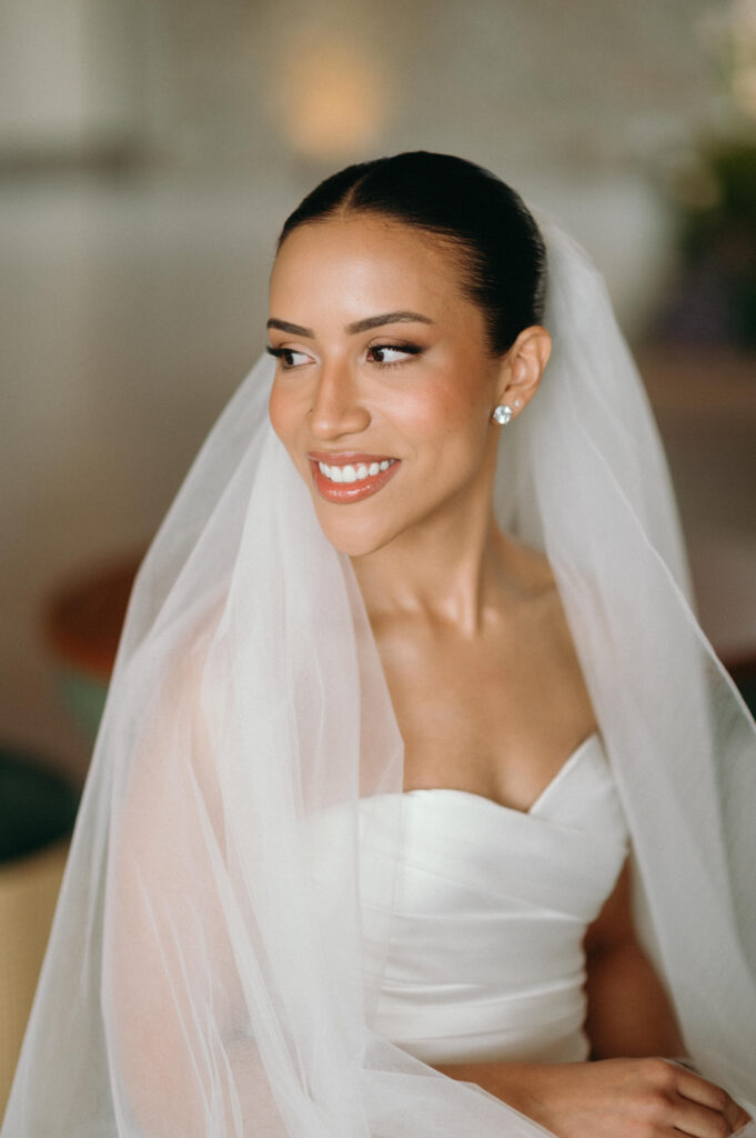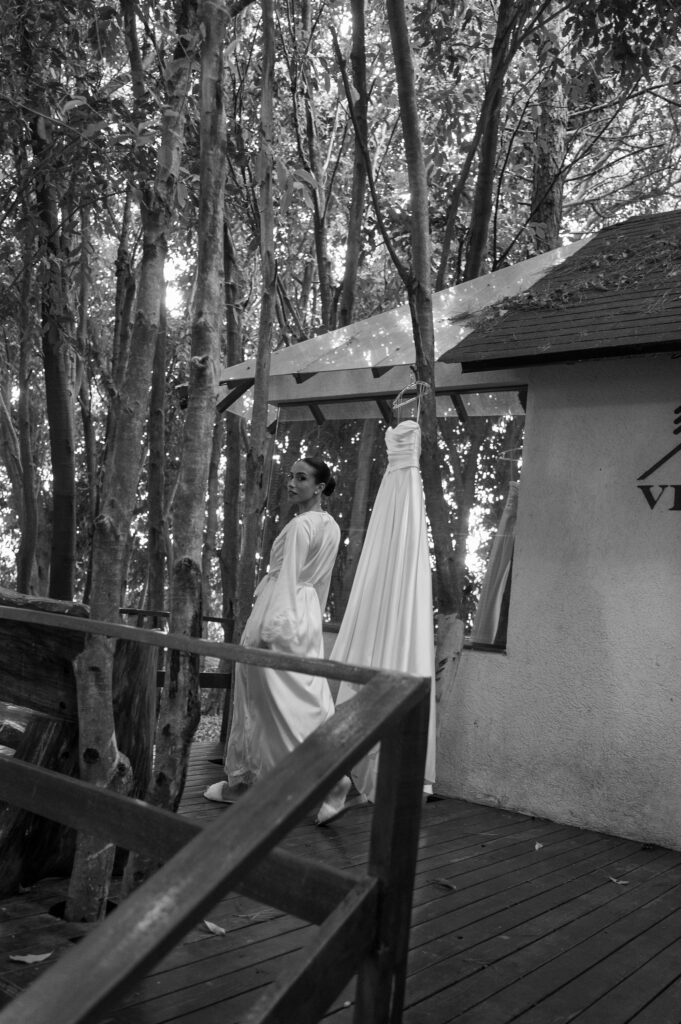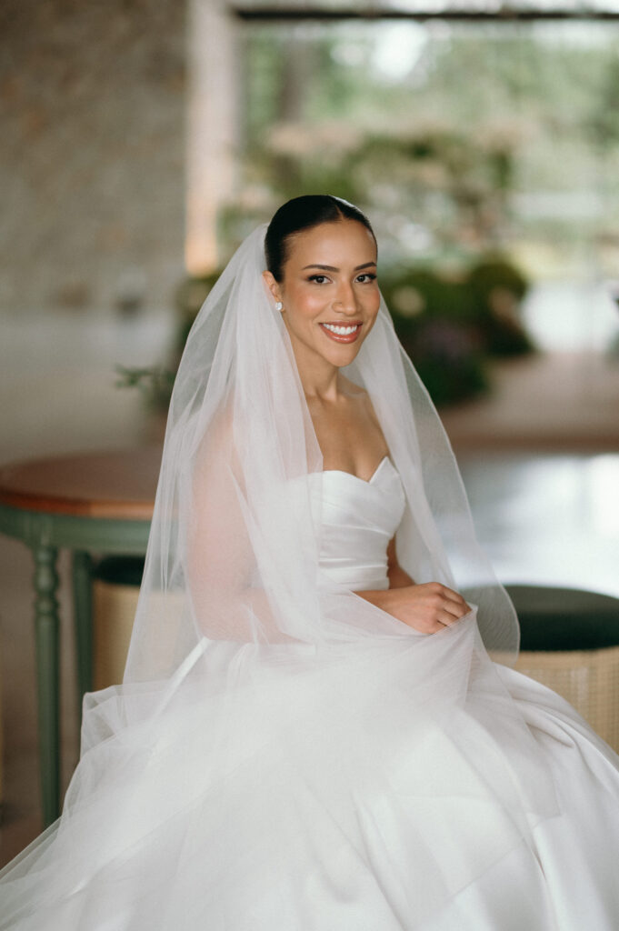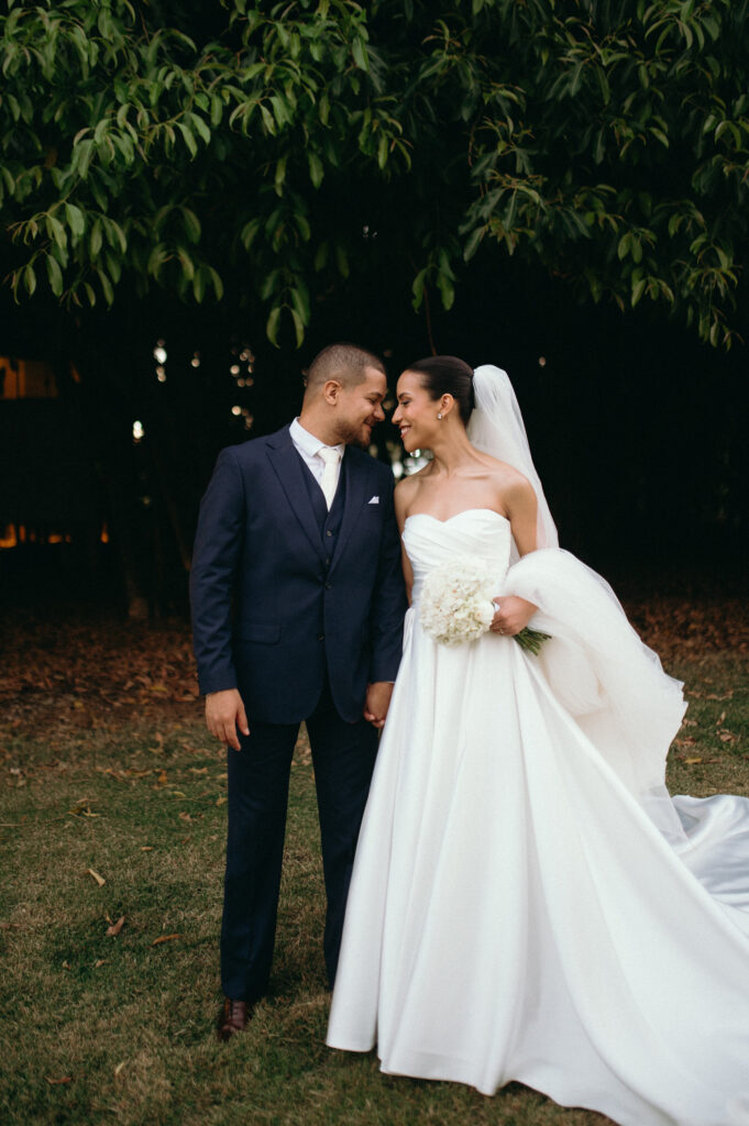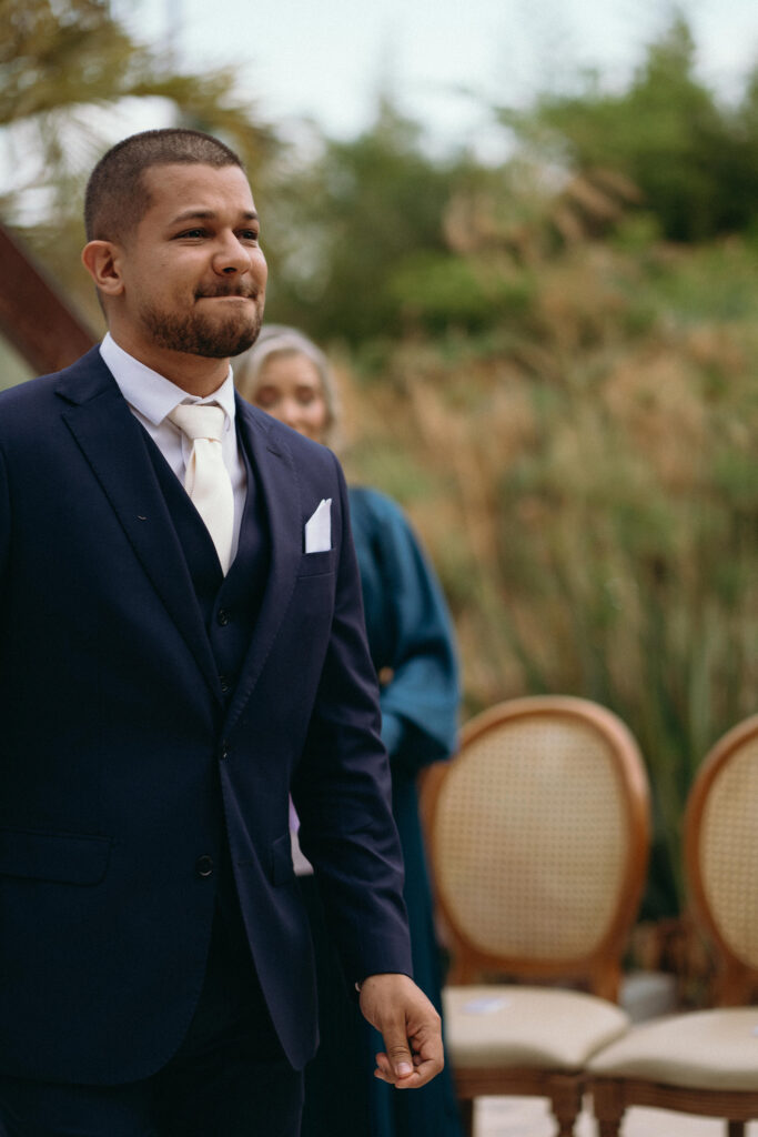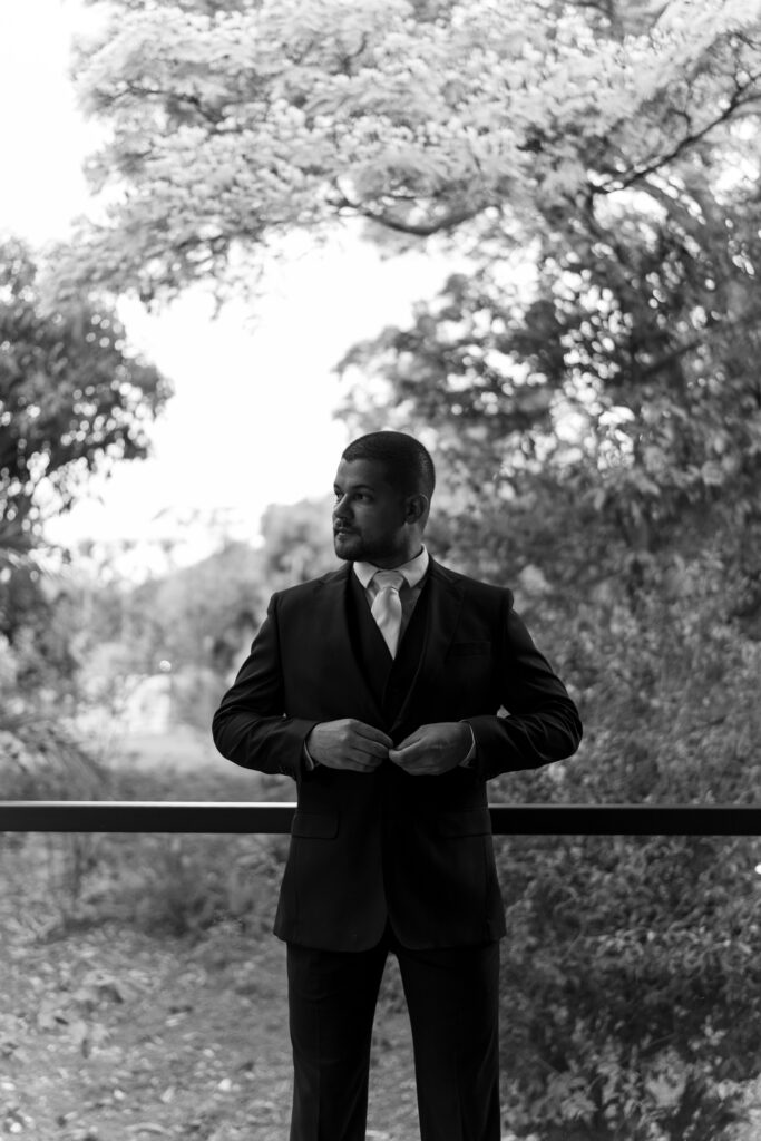 Na escolha dos trajes, a decisão também veio com convicção. A noiva encontrou seu vestido logo na primeira visita à La Fiancée. Letícia mostrou uma referência, experimentou dois modelos semelhantes e soube, imediatamente, qual era o seu. Clássico, elegante e fiel à sua personalidade. Gustavo também encontrou o terno de forma objetiva juntamente com a sua noiva, escolhendo um azul-escuro atemporal que reforçou a harmonia do conjunto.
