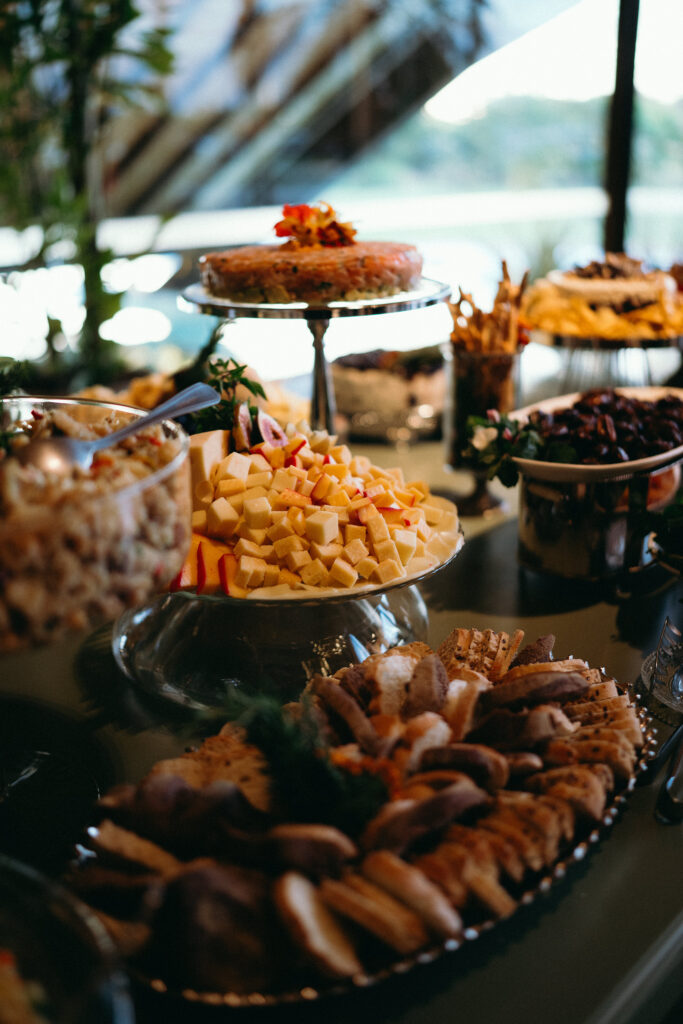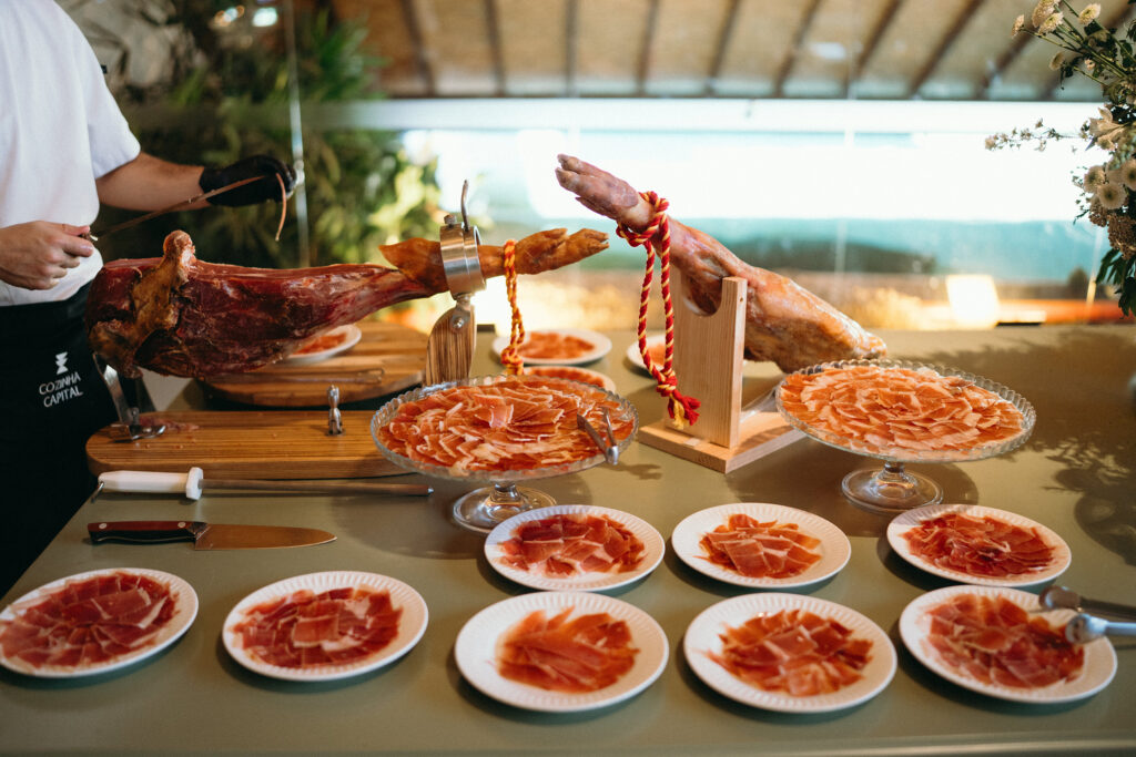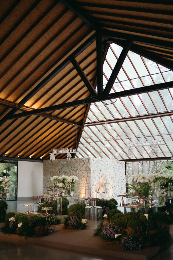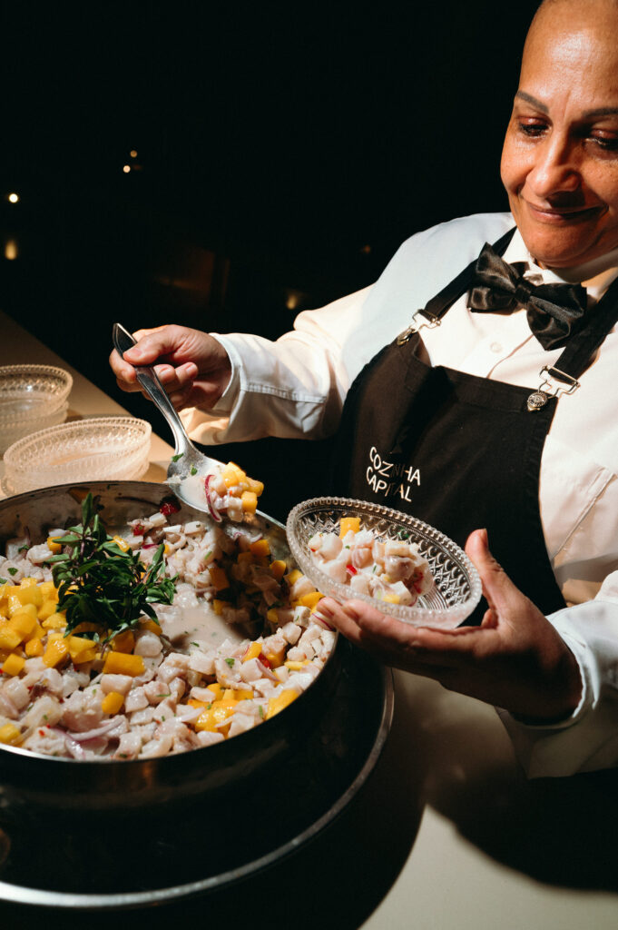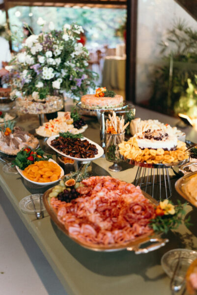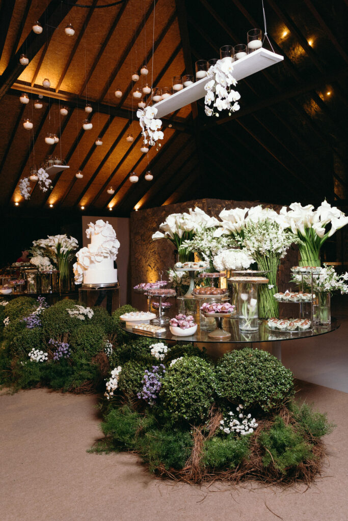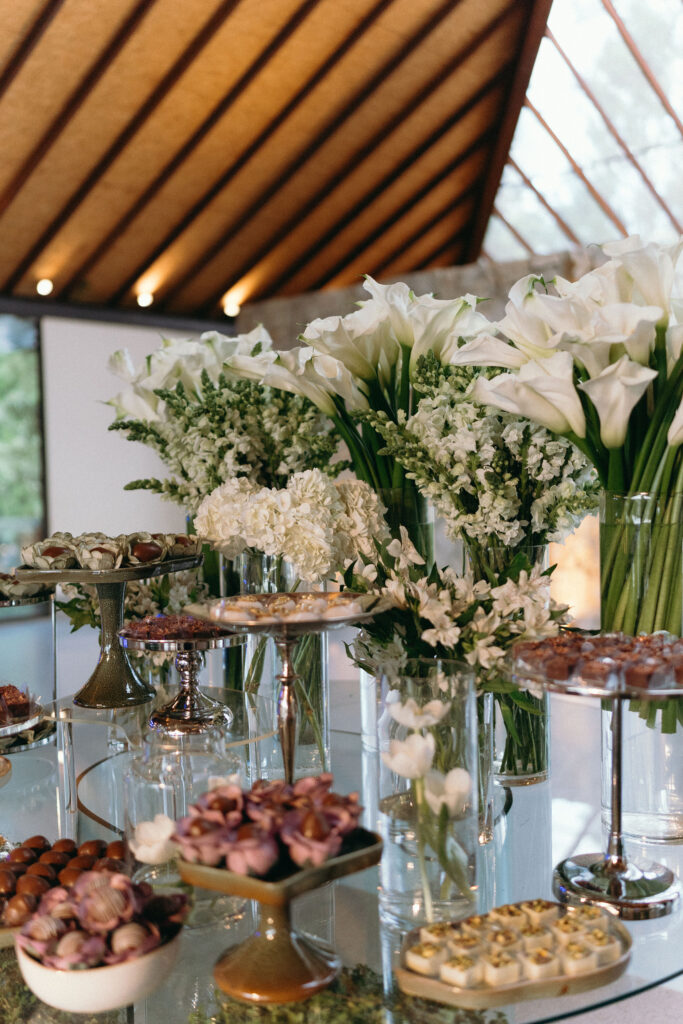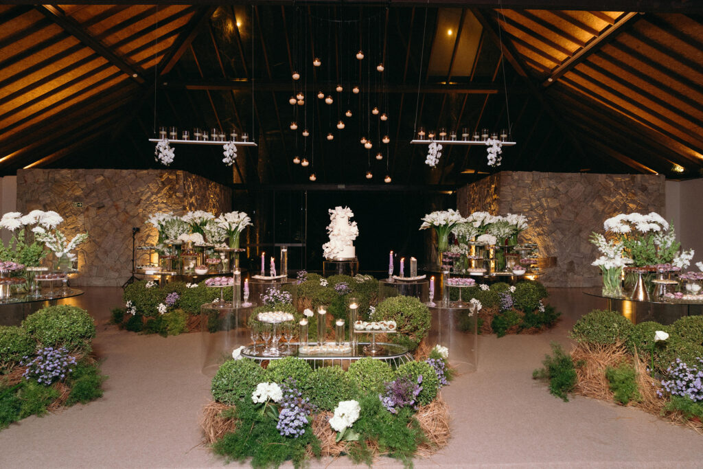 No menu, a proposta era servir aquilo que o casal realmente amava. O cardápio assinado pelo Cozinha Capital trouxe mesa de antepastos, estação de frutos do mar com bobó de camarão e ceviche, carrinho de escondidinho, coquetel volante variado, jantar completo, ilha de sobremesas afetivas e mini-hambúrguer com batata frita na pista de dança.