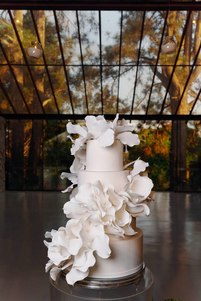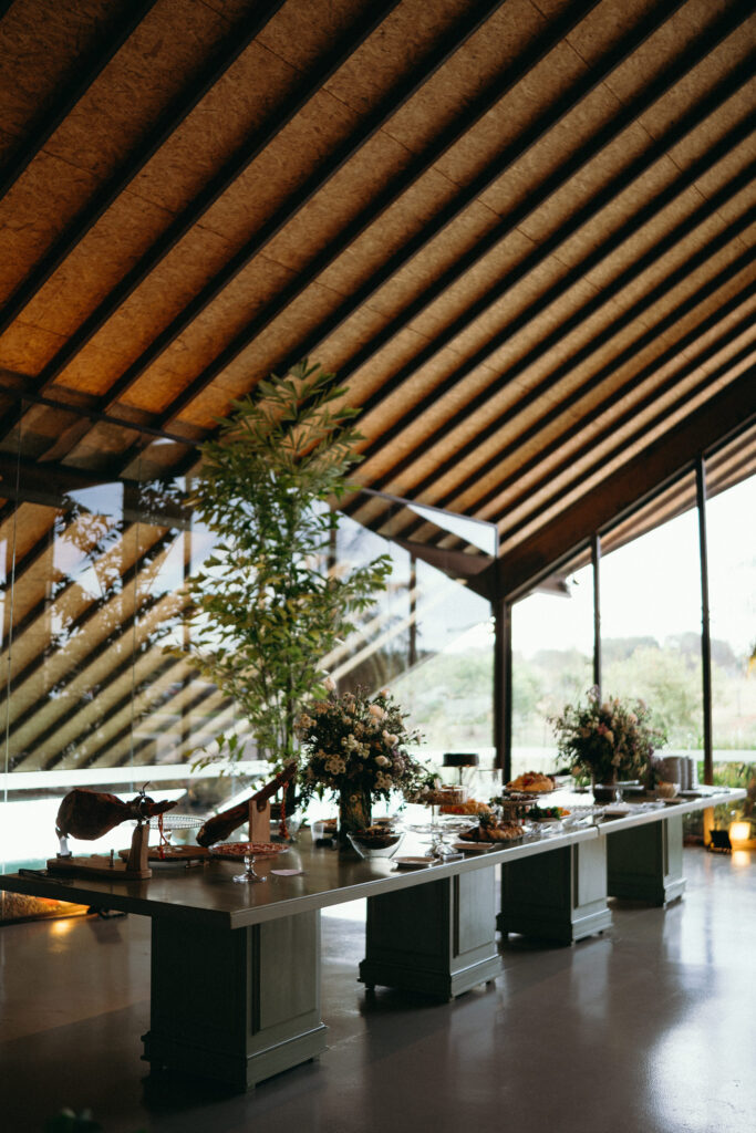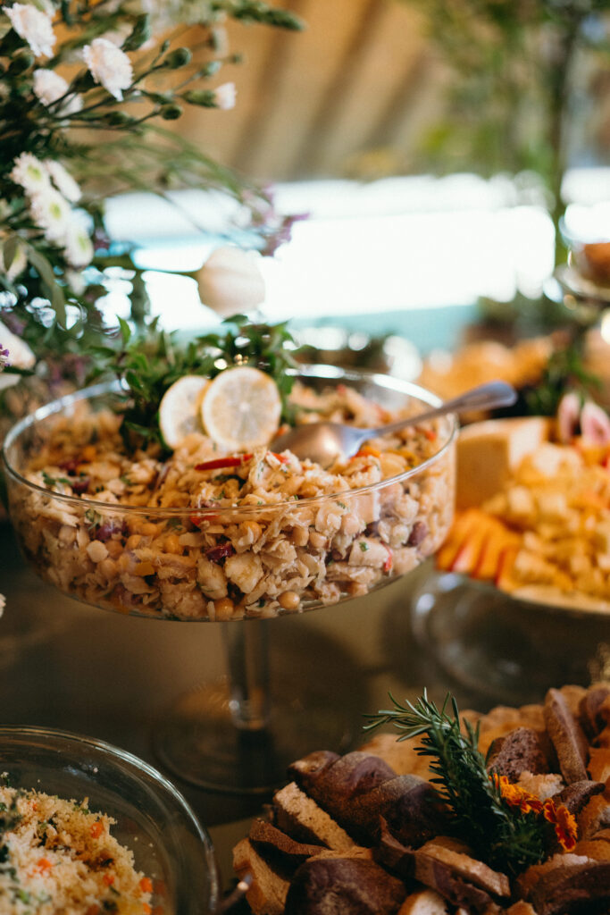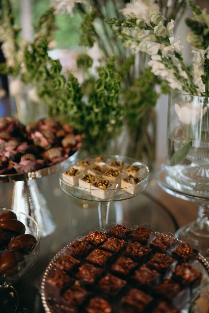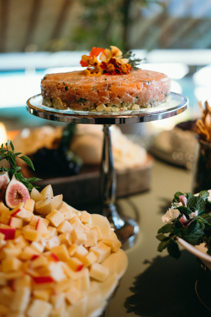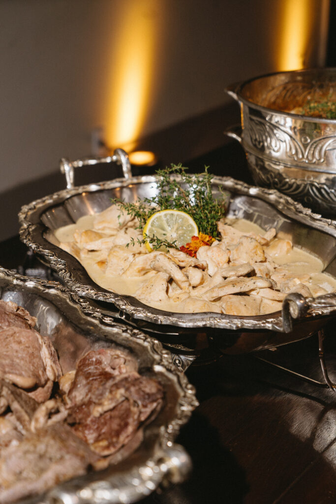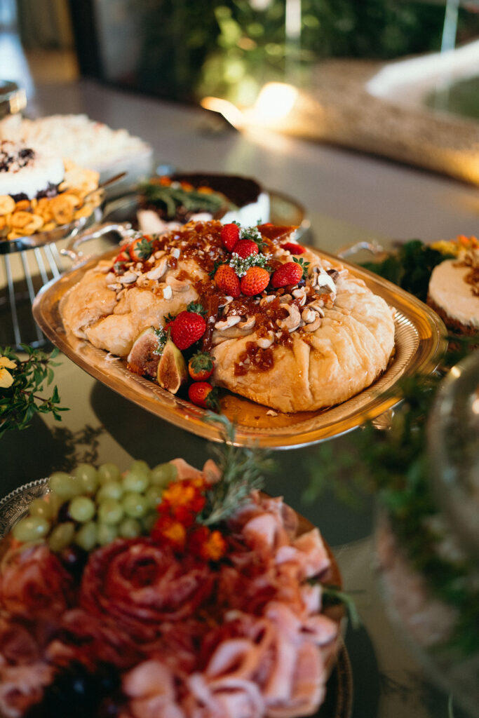 No menu, a proposta era servir aquilo que o casal realmente amava. O cardápio assinado pelo Cozinha Capital trouxe mesa de antepastos, estação de frutos do mar com bobó de camarão e ceviche, carrinho de escondidinho, coquetel volante variado, jantar completo, ilha de sobremesas afetivas e mini-hambúrguer com batata frita na pista de dança.