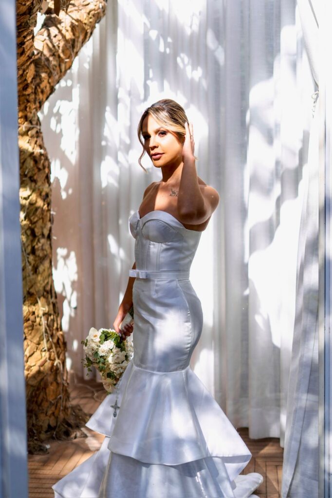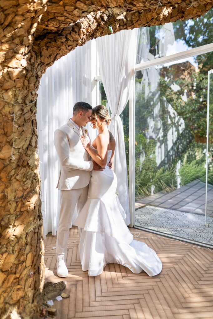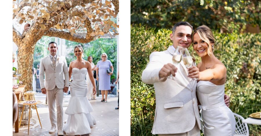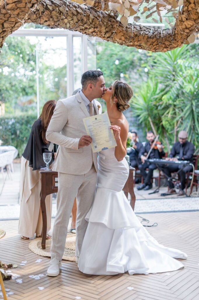O casamento foi decidido com a mesma objetividade: noivaram em janeiro e escolheram se casar ainda naquele ano. A organização começou, de fato, em abril, quando encontraram o Vert Café — espaço que recebeu a cerimônia civil e também foi responsável pelo buffet. A proposta era reunir pessoas importantes, criar uma experiência elegante e, acima de tudo, fazer um casamento com a identidade deles.