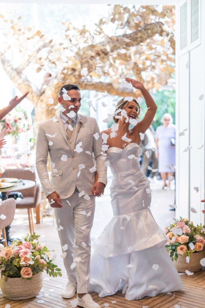 A cerimônia também foi marcada por escolhas pessoais. A entrada da noiva ao som de The Way You Look Tonight trouxe uma referência afetiva ao filme O Casamento do Meu Melhor Amigo, um dos favoritos da noiva, enquanto outras músicas escolhidas pelo casal ajudaram a construir um momento único e significativo.