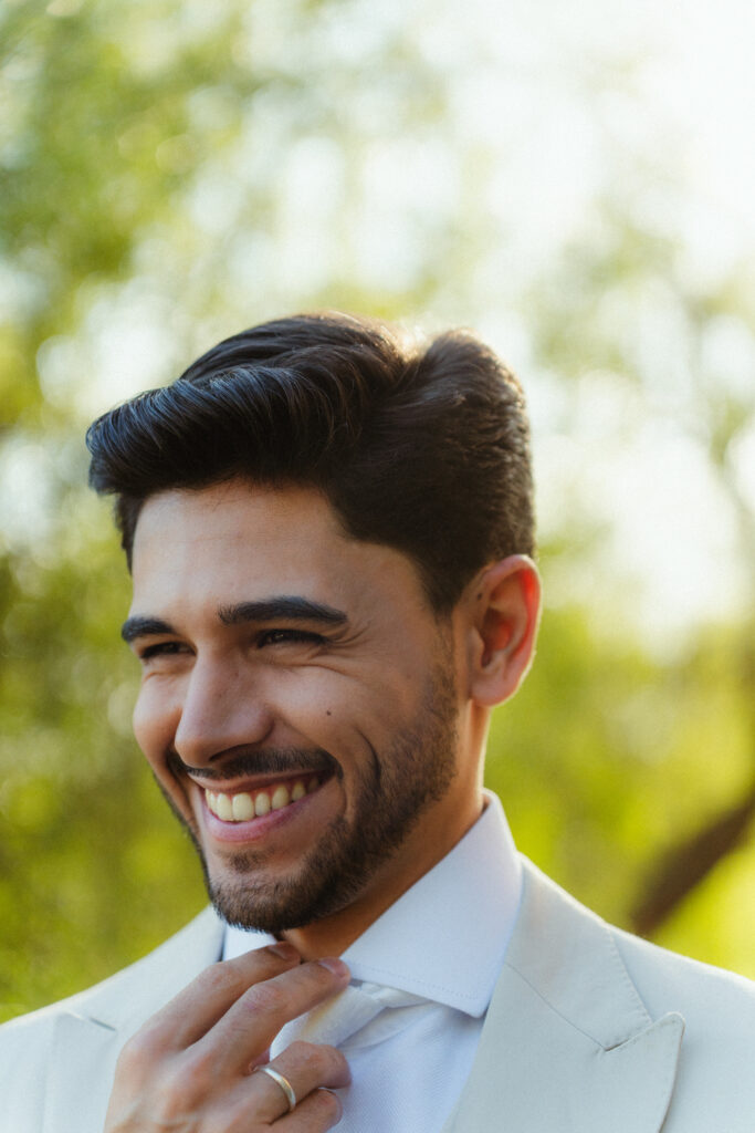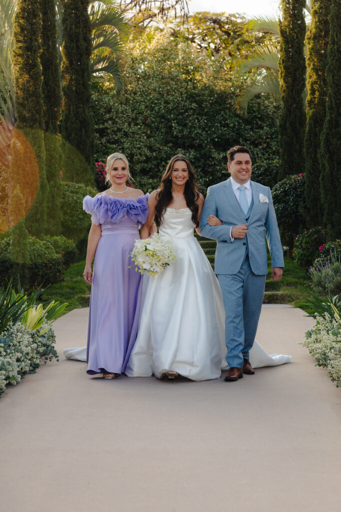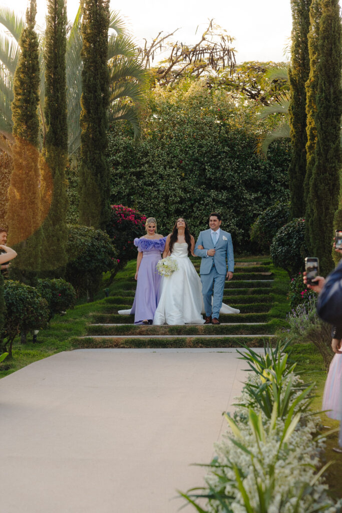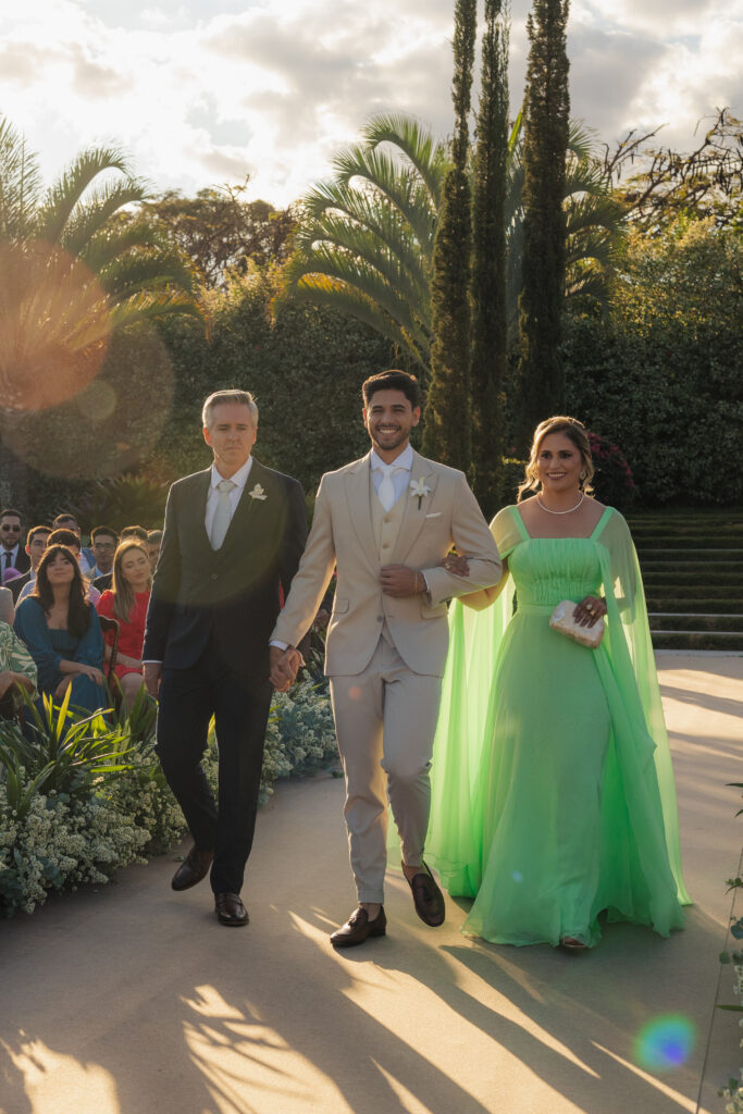 Para as madrinhas, a noiva escolheu um mesmo tecido em fúcsia furta-cor, pensando no melhor resultado das fotos, e as deixou livres para a confecção dos modelos. Já para os padrinhos, ofereceram gravatas no tom de cinza-claro, o que manteve a ideia de unidade e reforçou o visual leve e elegante. Para as demoiselles, Isabela escolheu o tom peach fuzz, que seguiu a paleta romântica do casamento. “Esse equilíbrio entre harmonia estética e liberdade individual era algo que eu fazia questão de manter”, conta a noiva.