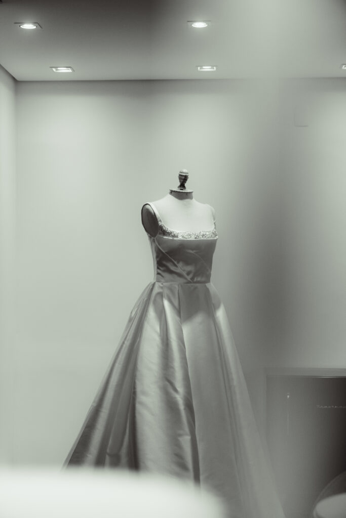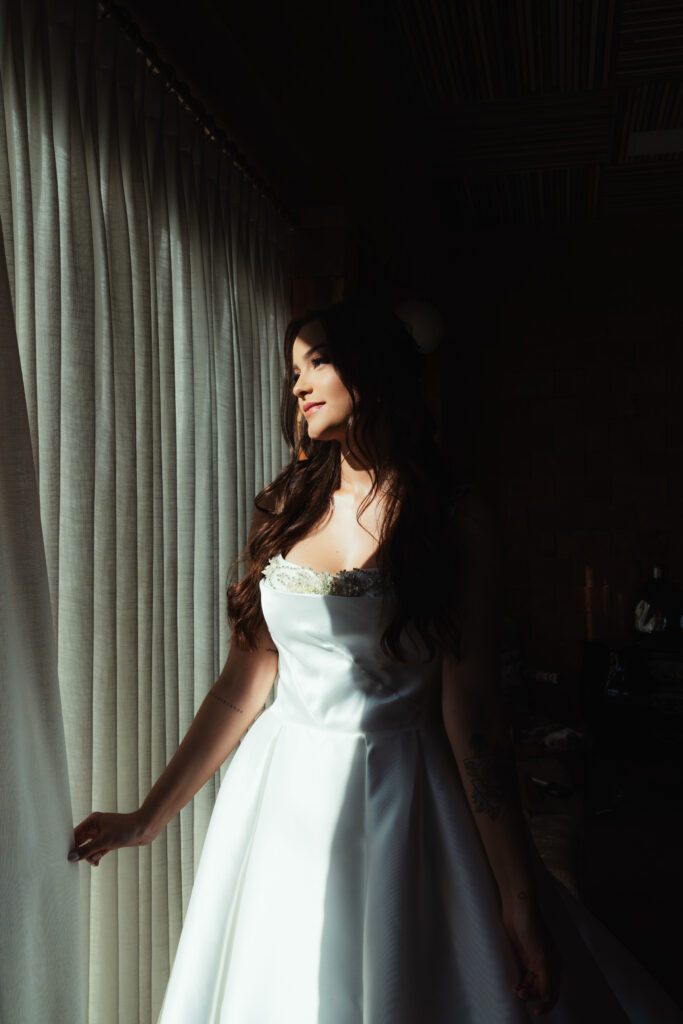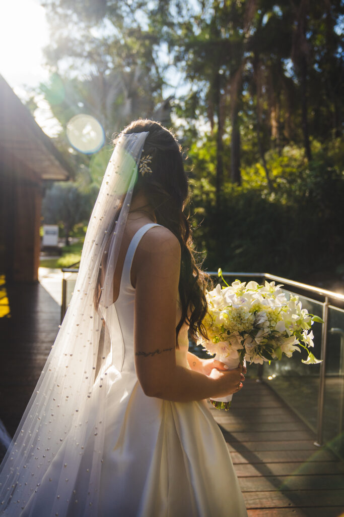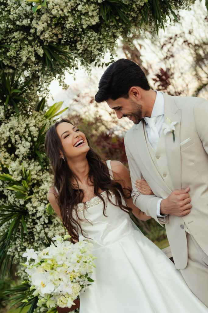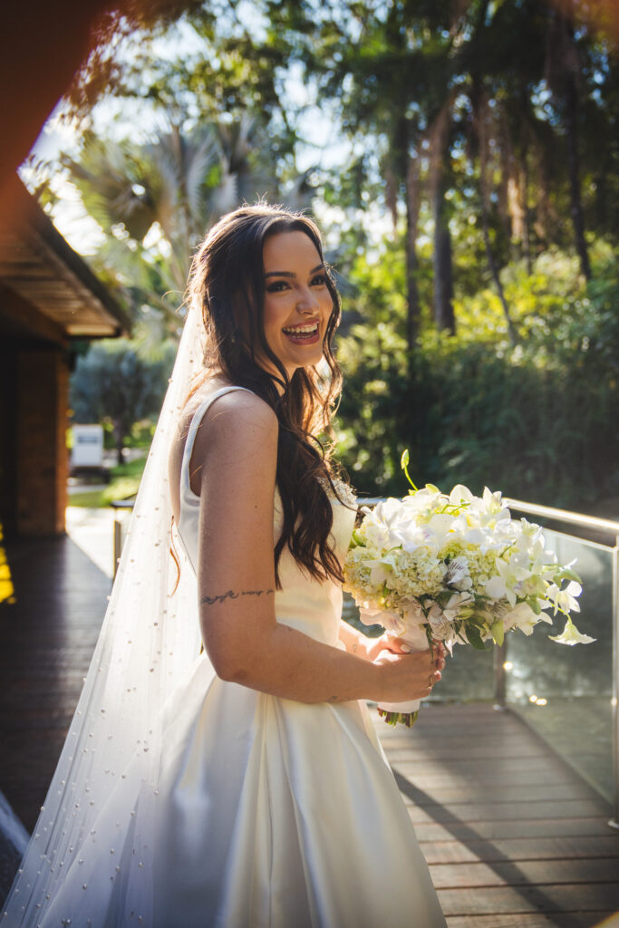 Para subir ao altar, a noiva sabia que queria algo clássico. “Queria um vestido que valorizasse meu colo, mas sem ser vulgar. Algo que me fizesse sentir uma princesa, sem renda, brilho ou excessos. Um vestido que carregasse a minha identidade, a minha essência, sem precisar de muito.” Após experimentar alguns modelos, Isabela se encantou por um minimalista, tomara que caia, com as costas fechadas por pequenas pérolas. Estava praticamente decidida, quando, em uma das provas, uma vendedora querida que lhe acompanhava mostrou novas opções — e foi então que o vestido a escolheu. Um modelo que a permitiu se sentir ela mesma, como sempre desejou.
