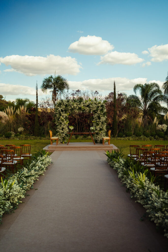 Mesmo antes de começar a namorar, ela já sabia onde queria se casar: no Espaço da Lenda. Seguia o perfil do local e sonhava com o dia em que o seu “sim” seria dito ali. Quando viu que haveria uma visita técnica com o espaço decorado, foi com a mãe conhecer o local. A conexão foi imediata e, logo, descobriram uma oportunidade única: o casamento poderia acontecer no dia 27 de julho de 2024 — uma data que havia sido bloqueada e, por sorte ou destino, estava disponível. Era agora ou só no fim do ano, então não pensaram duas vezes e fecharam ali mesmo. A partir daí, começaram os preparativos, com exatos nove meses para organizar tudo.