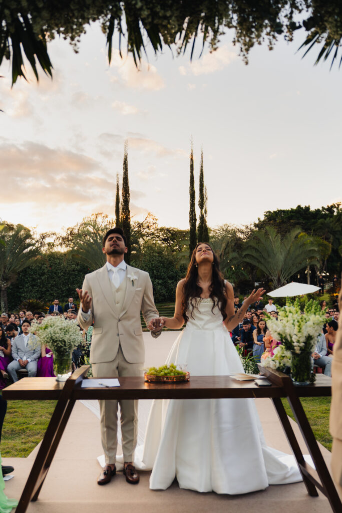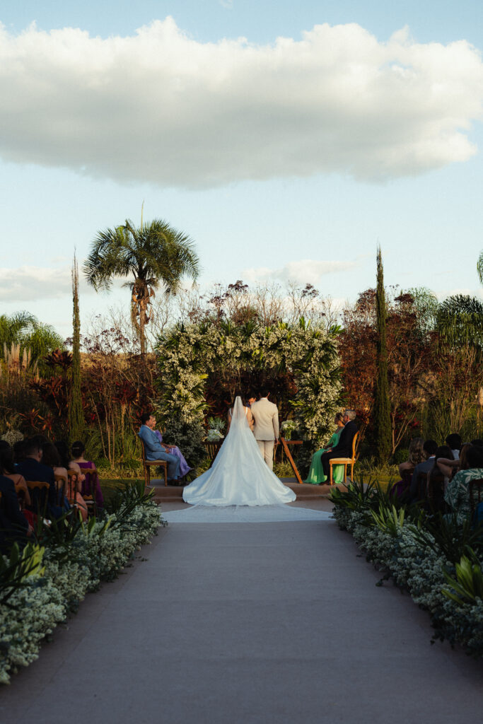 As músicas que entoaram a cerimônia contaram com vozes conhecidas — amigos que faziam parte do ministério de louvor de sua igreja. “Além do talento musical, eram pessoas que carregavam consigo o significado profundo das canções e nos conheciam bem, tornando cada momento ainda mais especial e genuíno”, contam. Para a entrada de Vitor, escolheram “Don’t Wanna Go” — música de significado especial para ele. Já para Isabela, optaram pelos acordes iniciais da Marcha Nupcial seguidos por “La Vie en Rose”, sua música favorita e de significado especial. Durante toda a celebração, músicas cristãs simbolizaram a presença de Deus e a fé do casal.