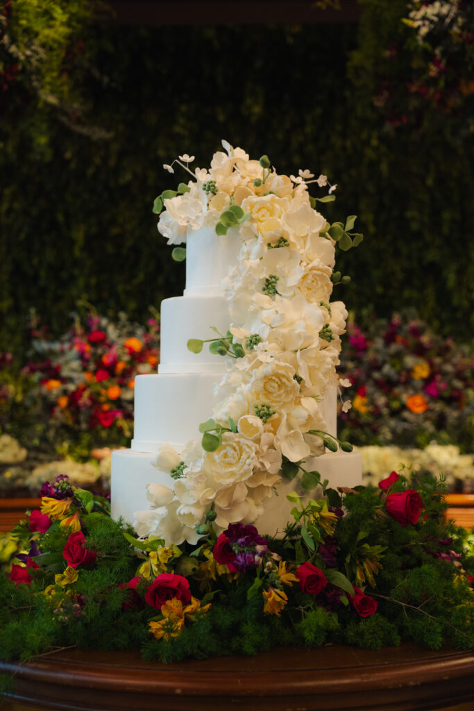 Pensando na diversidade de seus convidados, o casal optou por um buffet completo e cuidadosamente elaborado. A proposta era agradar a todos os perfis: quem quisesse aproveitar a pista sem perder um petisco pôde contar com o coquetel volante; já aqueles que preferiam se sentar e saborear com calma encontraram conforto e sofisticação nos pratos quentes. O cardápio contou com cortes nobres de filé, arroz, saladas, risoto à mineira, camarão com geleia de pimenta, favo de mel e queijos — uma verdadeira experiência gastronômica, protagonizada pela equipe de Andreia Sales. “Ficamos muito felizes em ver que todos os convidados puderam desfrutar e se deliciar, além do cuidado da Andreia com opções para todas as pessoas”, afirmam os noivos. Um dos grandes diferenciais foi o cuidado com as restrições alimentares. A mãe da noiva, por exemplo, que é intolerante ao glúten, pôde saborear o menu sem preocupações, graças à atenção personalizada do buffet. Um gesto que fez toda a diferença.