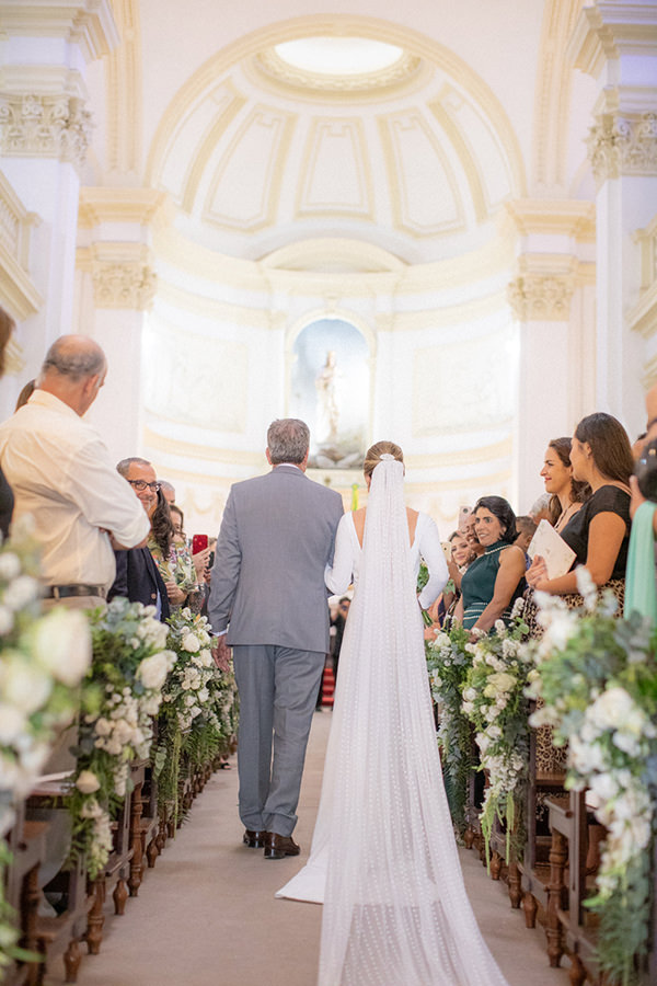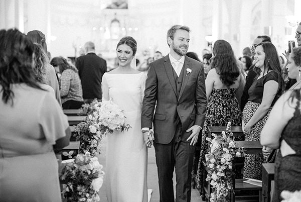 Carla tinha o sonho de se casar na igreja pela manhã e receber os convidados para uma festa à luz do dia. Depois de exatamente um ano de preparativos, o casal subiu ao altar na Capela Nossa Senhora do Sion em Petrópolis, região serrana do Rio de Janeiro, diante de 250 convidados. “A capela é linda, toda branca, e achei que ficaria perfeita com meu estilo e com o que estávamos planejando: uma decoração em branco e muito verde, principalmente com as rosas brancas.”