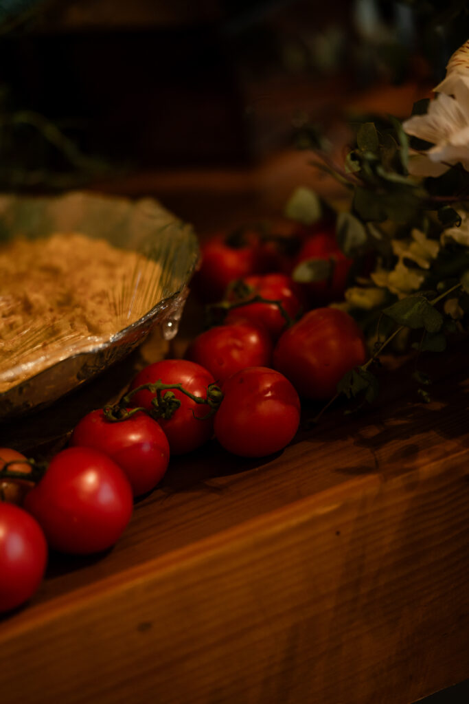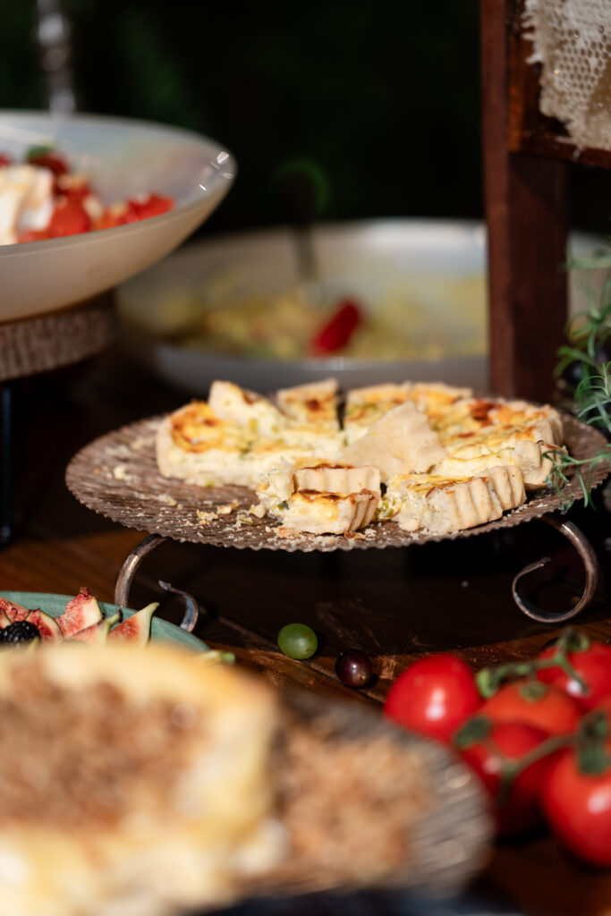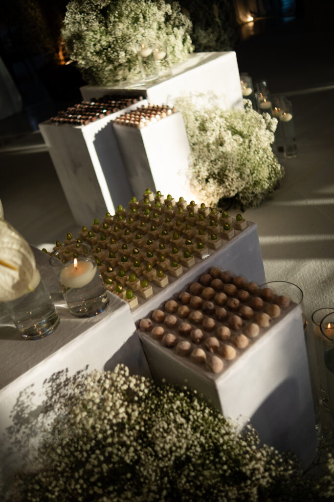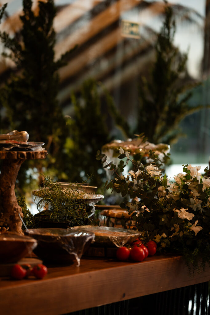 Depois do “sim”, a celebração seguiu em forma de sabores. O cuidado do Andréia Sales Buffet se revelou desde a primeira degustação até o último prato servido. As ilhas de antepastos, coquetel volante, jantar completo e hambúrgueres para o fim da festa compuseram uma experiência generosa e acolhedora. Nada foi apenas servido; tudo foi pensado. A atenção aos detalhes, a criatividade nas combinações e o cuidado com os convidados tornaram o buffet parte viva da narrativa do casamento.