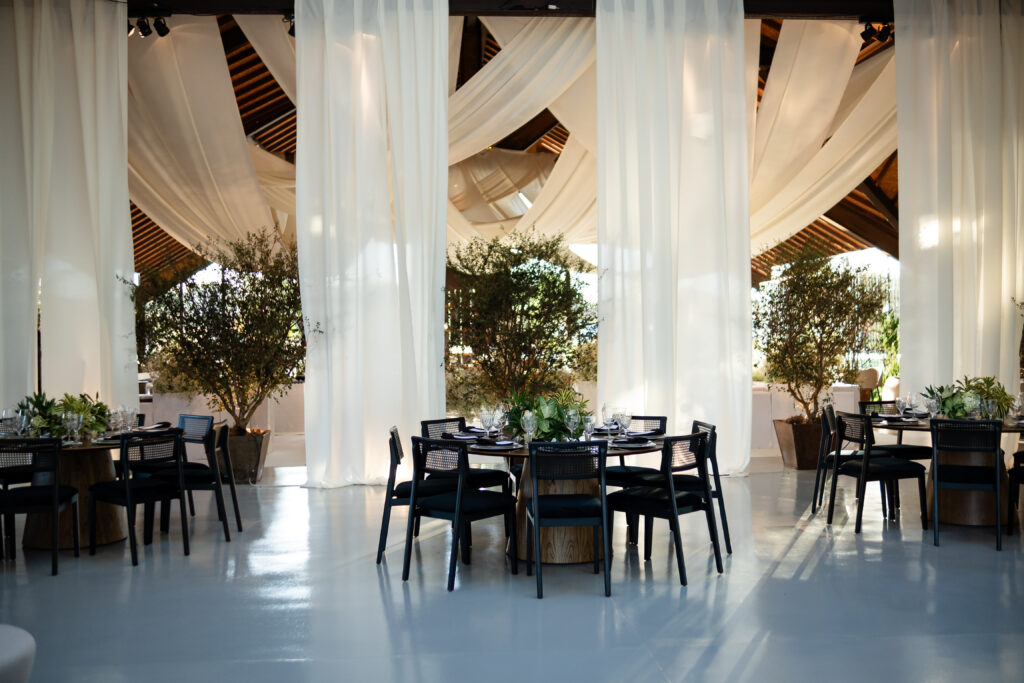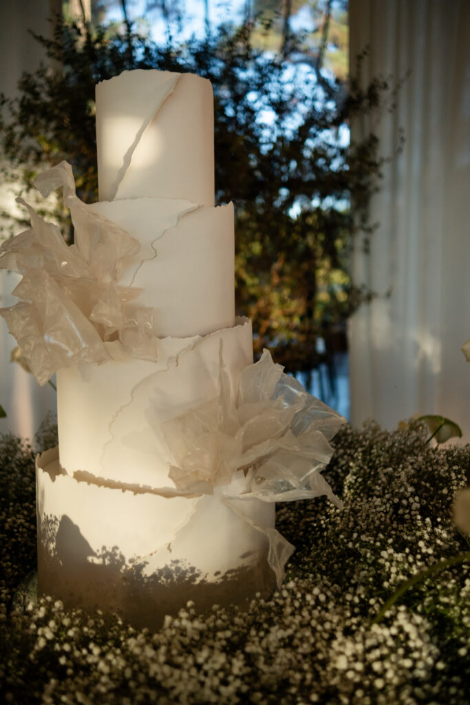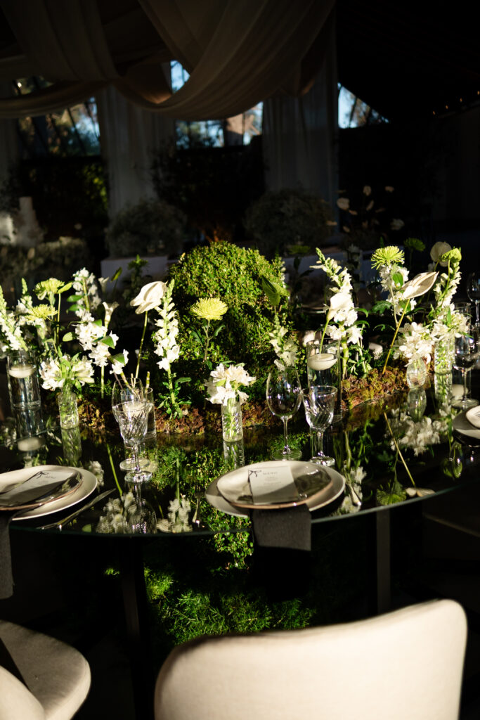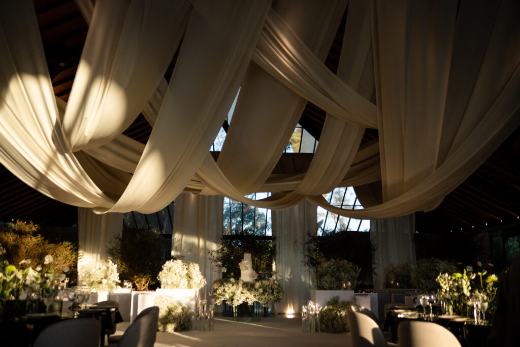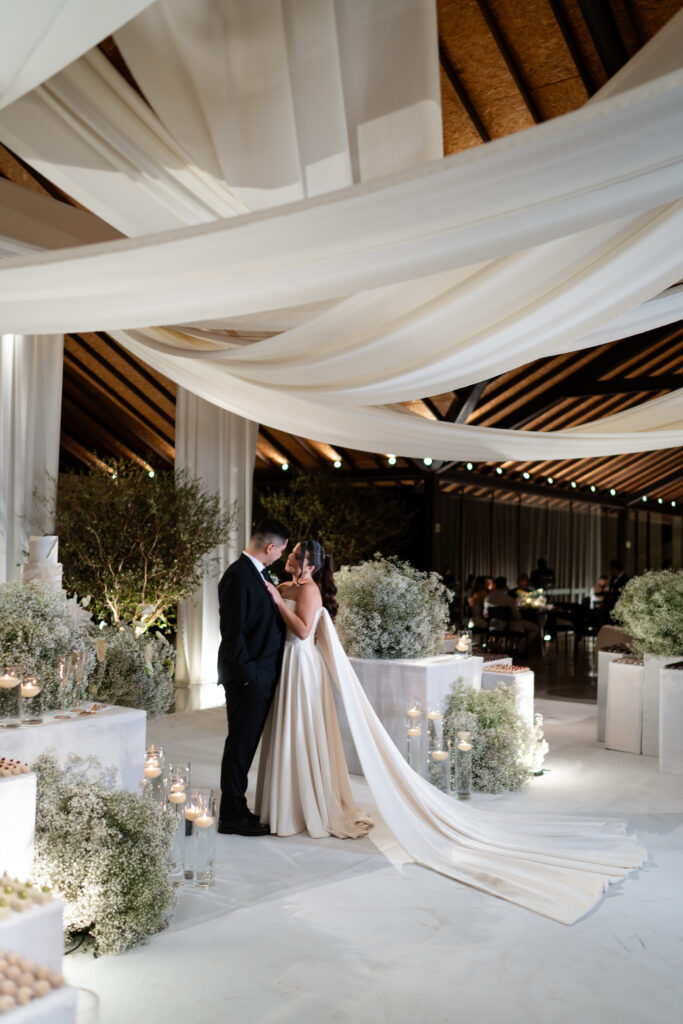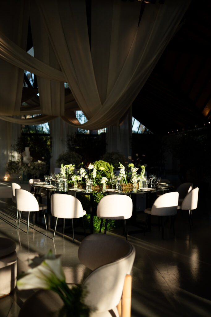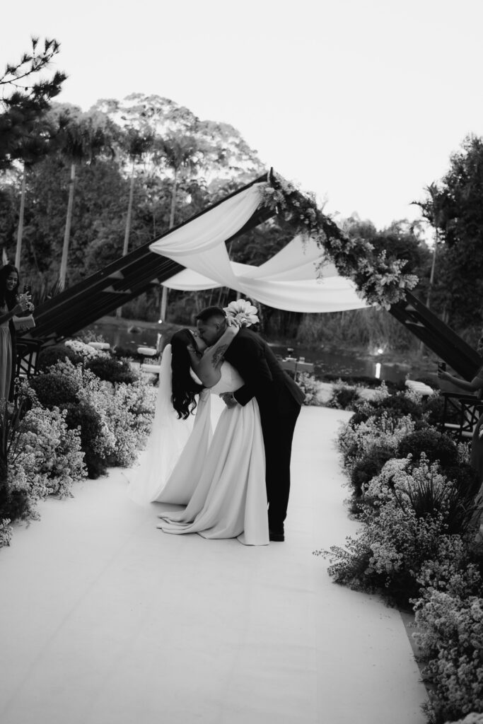 A decoração nasceu do desejo de romper com padrões. A noiva se envolveu em cada escolha, da papelaria às flores, da mobília aos pequenos detalhes. Nada era aleatório. O vestido também carregava uma história longa. Idealizado há anos, ele não cabia em moldes prontos, por isso, a noiva optou por buscar um ateliê que conseguisse trazer para o real um modelo exato de como ela sonhava que o vestido deveria ser.