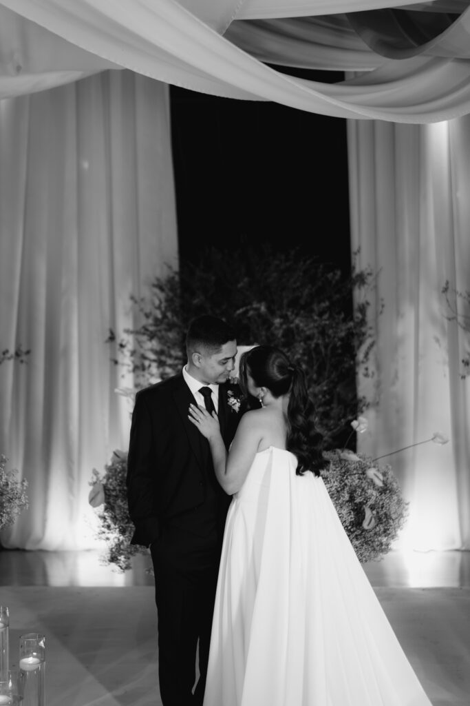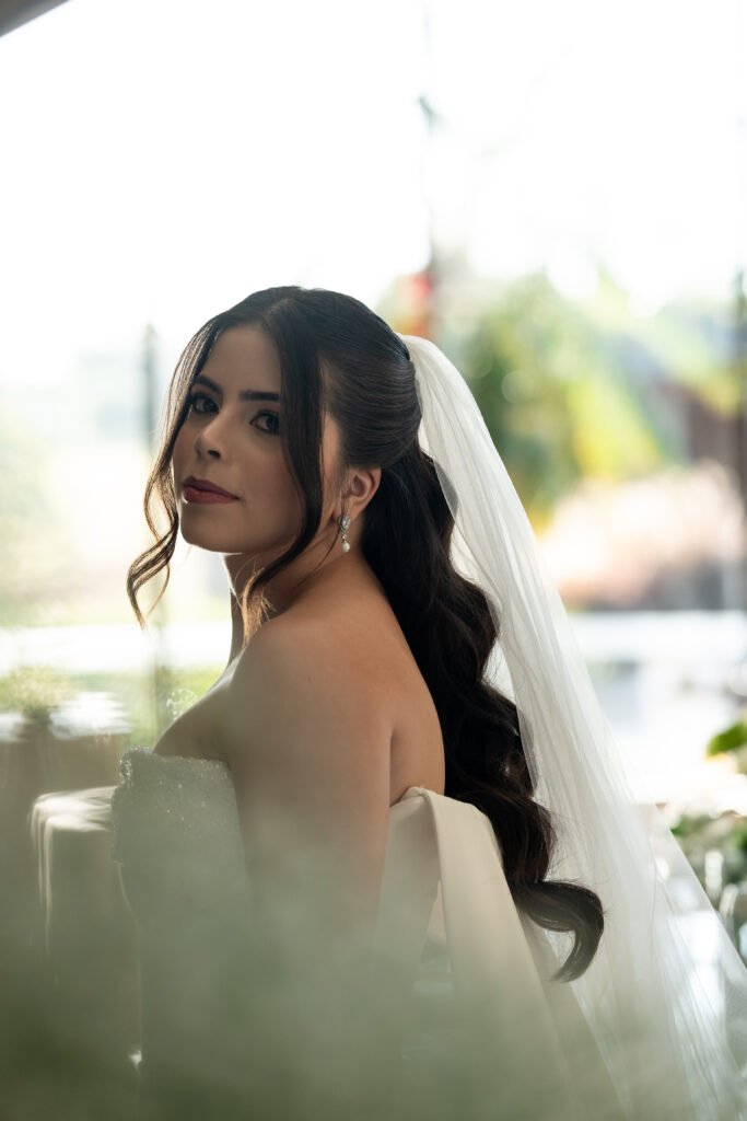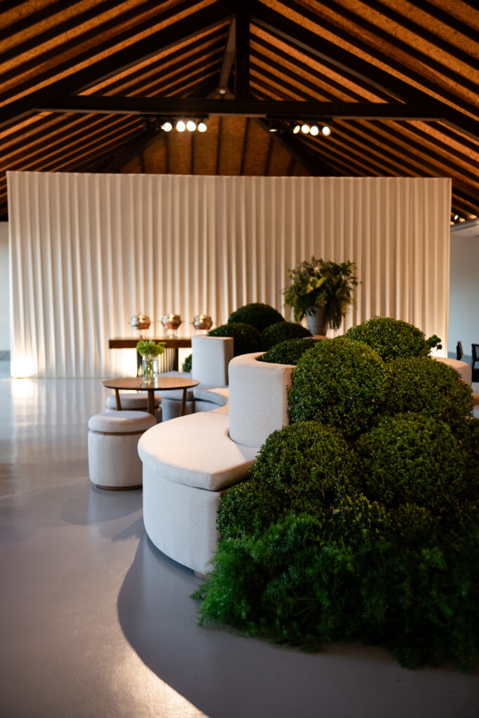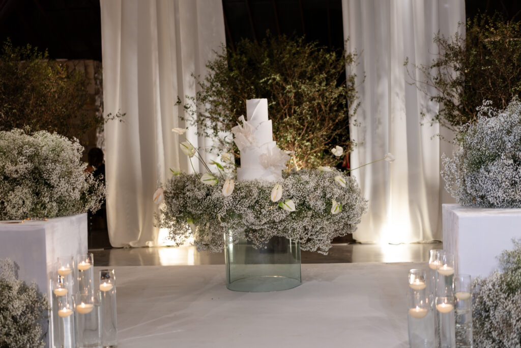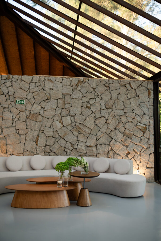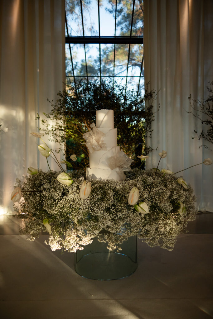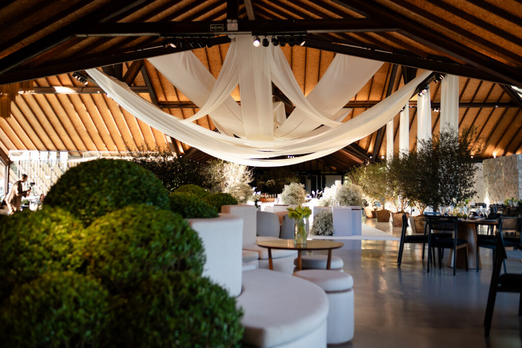 A decoração nasceu do desejo de romper com padrões. A noiva se envolveu em cada escolha, da papelaria às flores, da mobília aos pequenos detalhes. Nada era aleatório. O vestido também carregava uma história longa. Idealizado há anos, ele não cabia em moldes prontos, por isso, a noiva optou por buscar um ateliê que conseguisse trazer para o real um modelo exato de como ela sonhava que o vestido deveria ser.